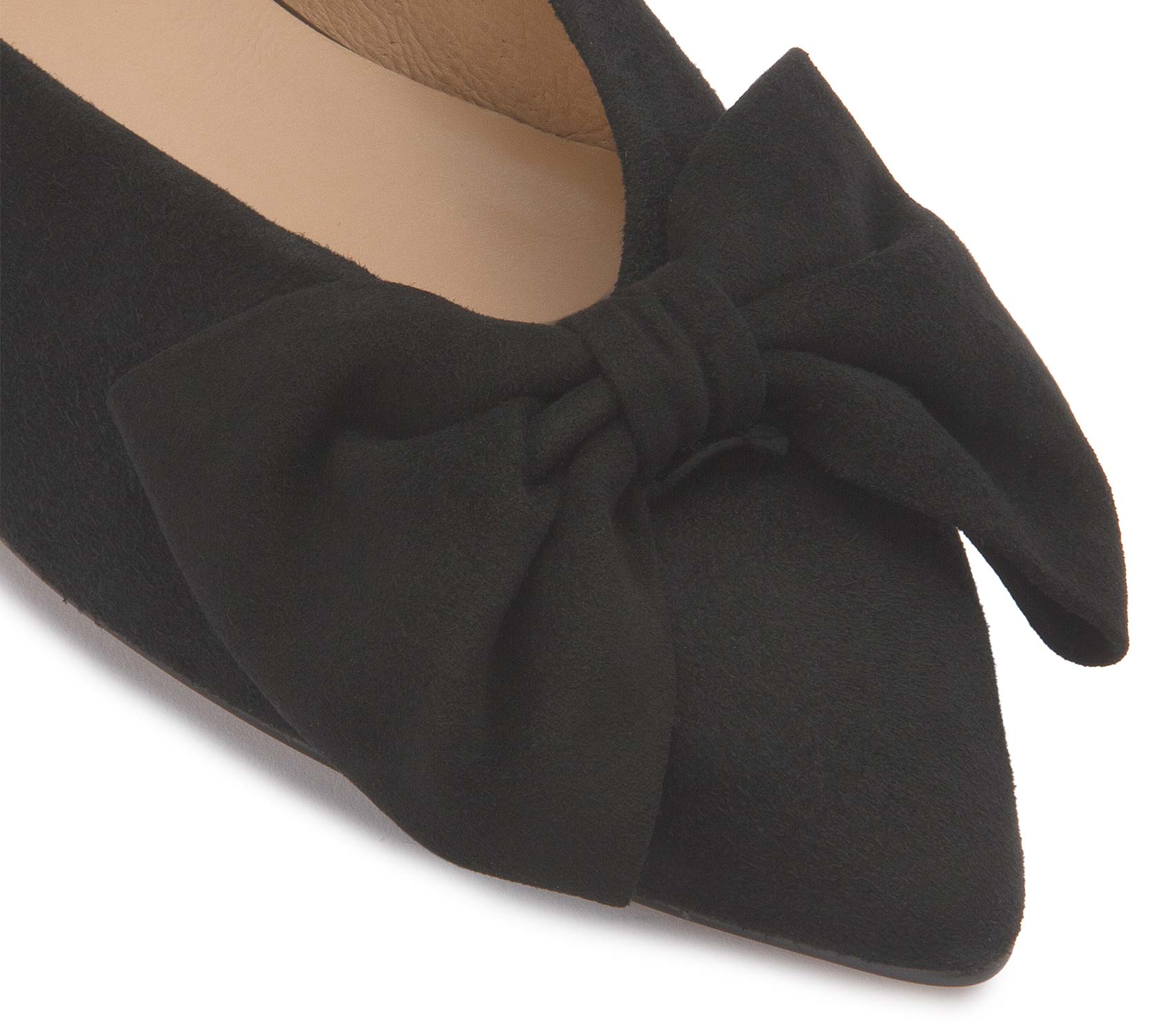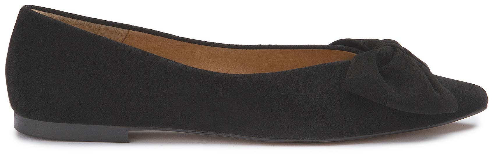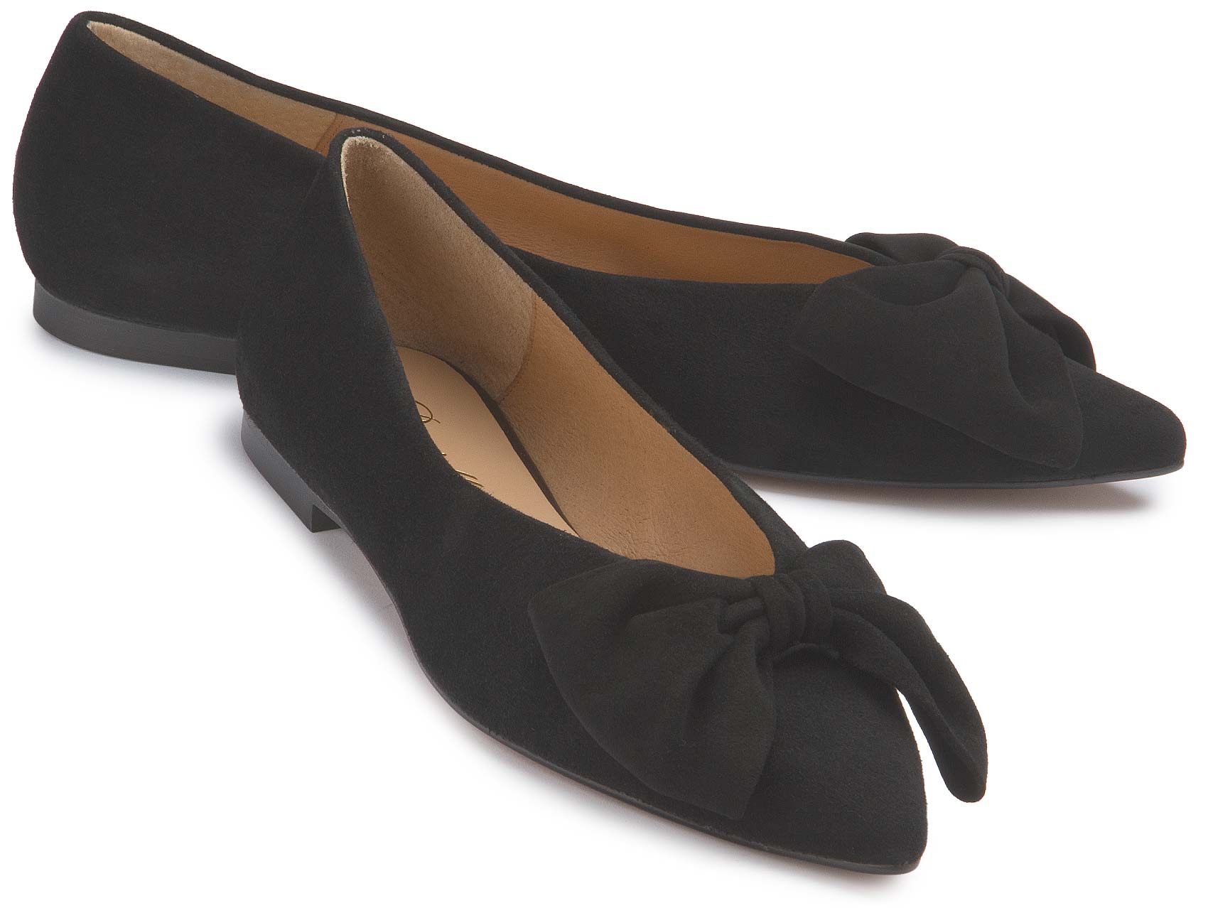 Die eleganten Ballerinas von Bariello überzeugen mit zeitloser Raffinesse. Aus feinem schwarzen Rauleder gefertigt und mit einer schicken Schleife verziert, verleihen sie jedem Outfit eine edle Note. Der spitz zulaufende Schnitt und die flache Sohle sorgen für stilvollen Tragekomfort – perfekt für Alltag und besondere Anlässe.