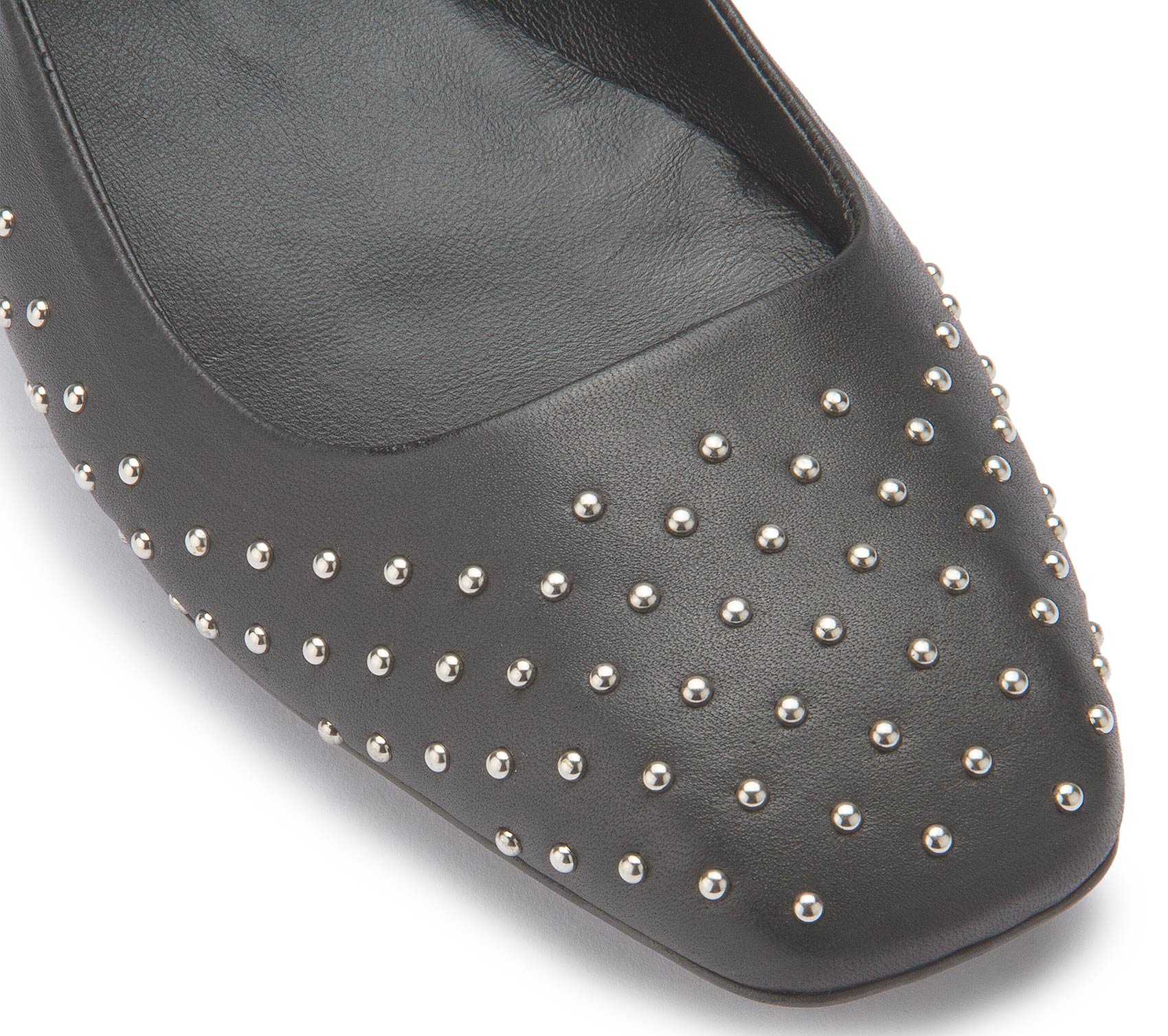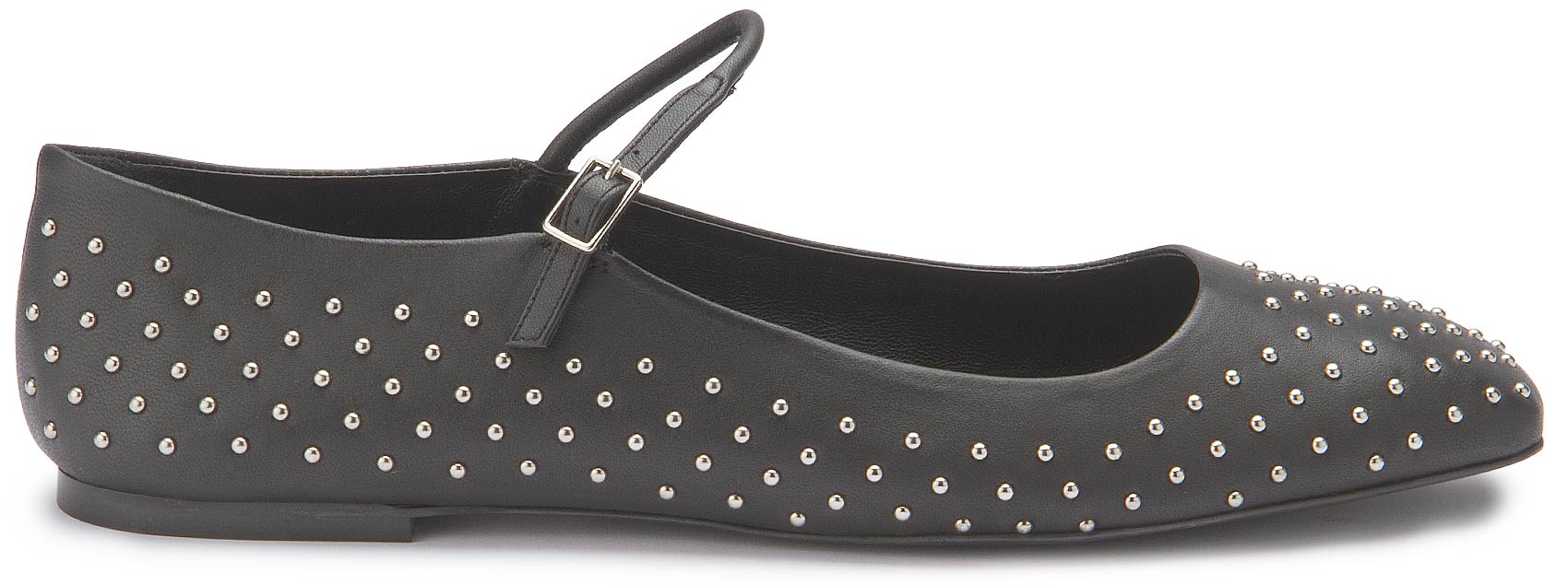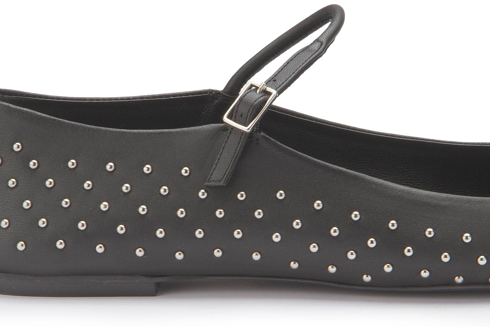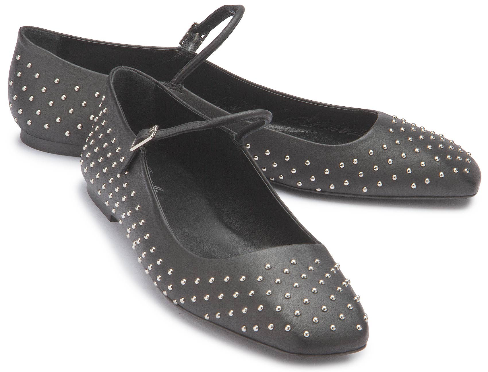 Der Ballerina von Bariello überzeugt mit seinem edlen Schwarzton und markanten Nieten-Details. Der Riemenverschluss sorgt für einen sicheren Halt und unterstreicht das stilvolle Design. Dieses Modell vereint modische Raffinesse mit hohem Tragekomfort – perfekt für elegante Alltagslooks mit einem Hauch Rock-Chic.