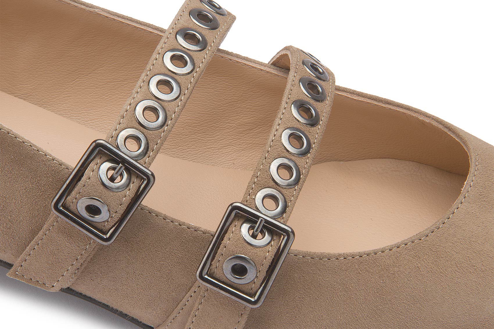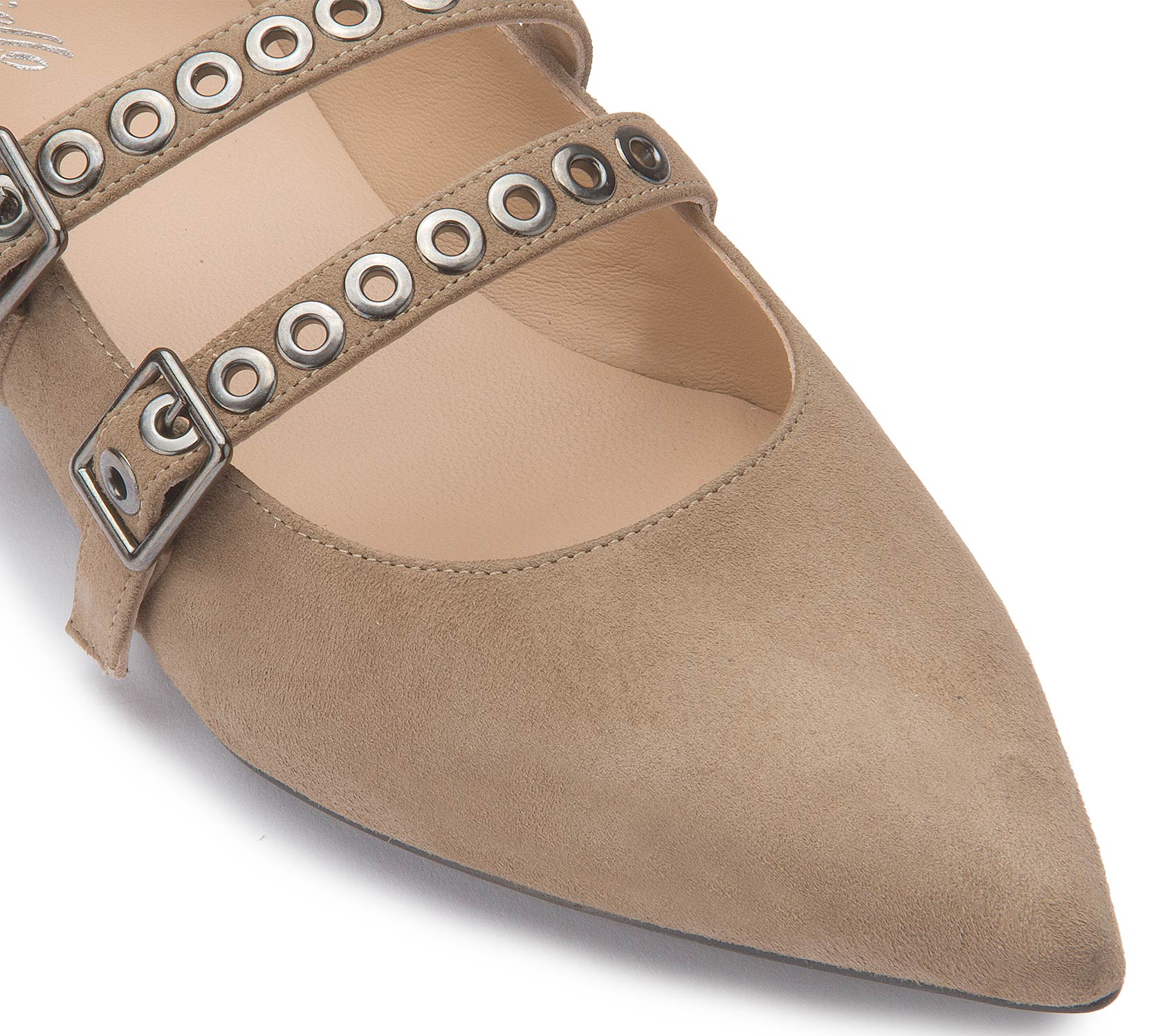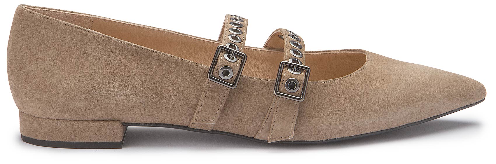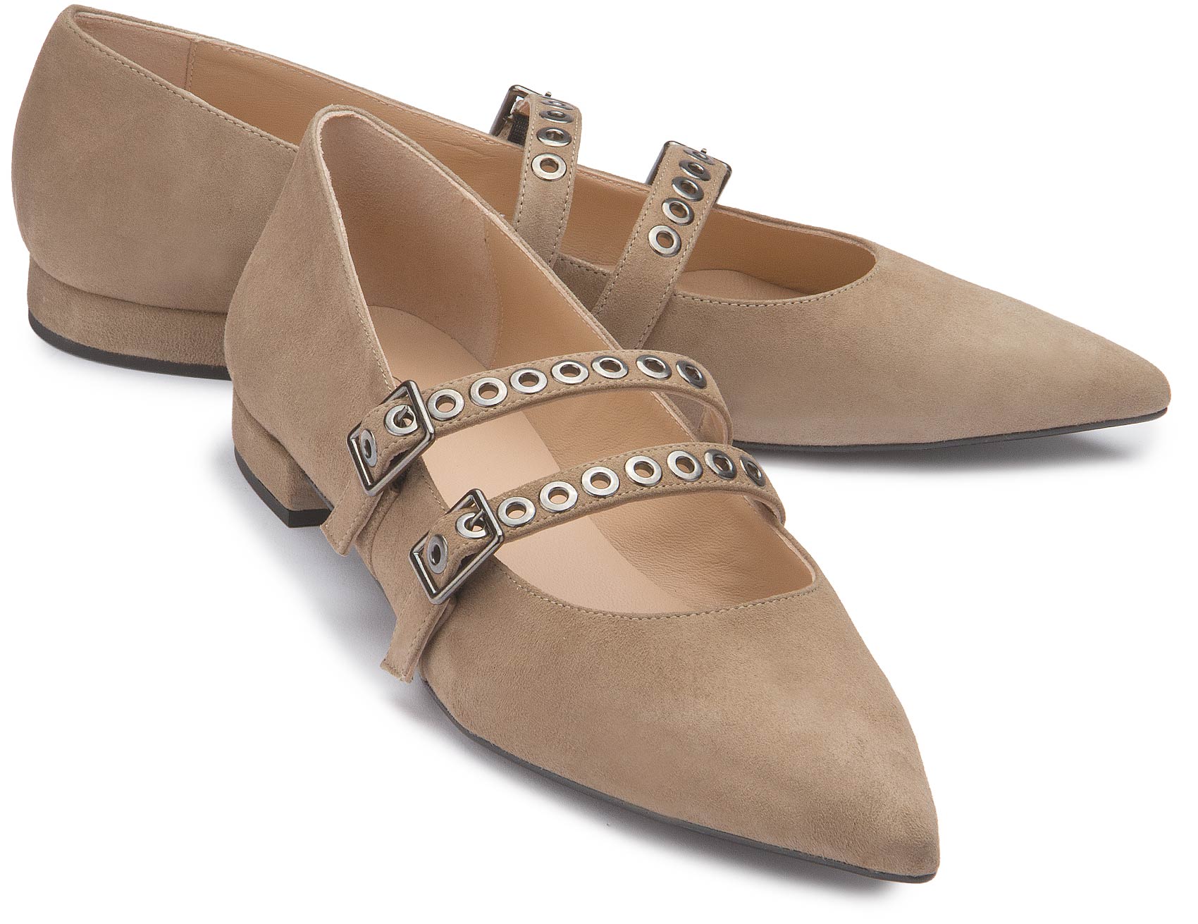 Diese eleganten Schuhe von Bariello verbinden zeitlose Eleganz mit einem Hauch moderner Raffinesse. Das weiche Rauleder in edlem Beige und die markanten Riemchen mit Nieten verleihen dem spitz zulaufenden Ballerina-Modell eine stilvolle, leicht rockige Note. Perfekt für modebewusste Frauen, die ihren Look dezent, aber ausdrucksstark abrunden möchten.