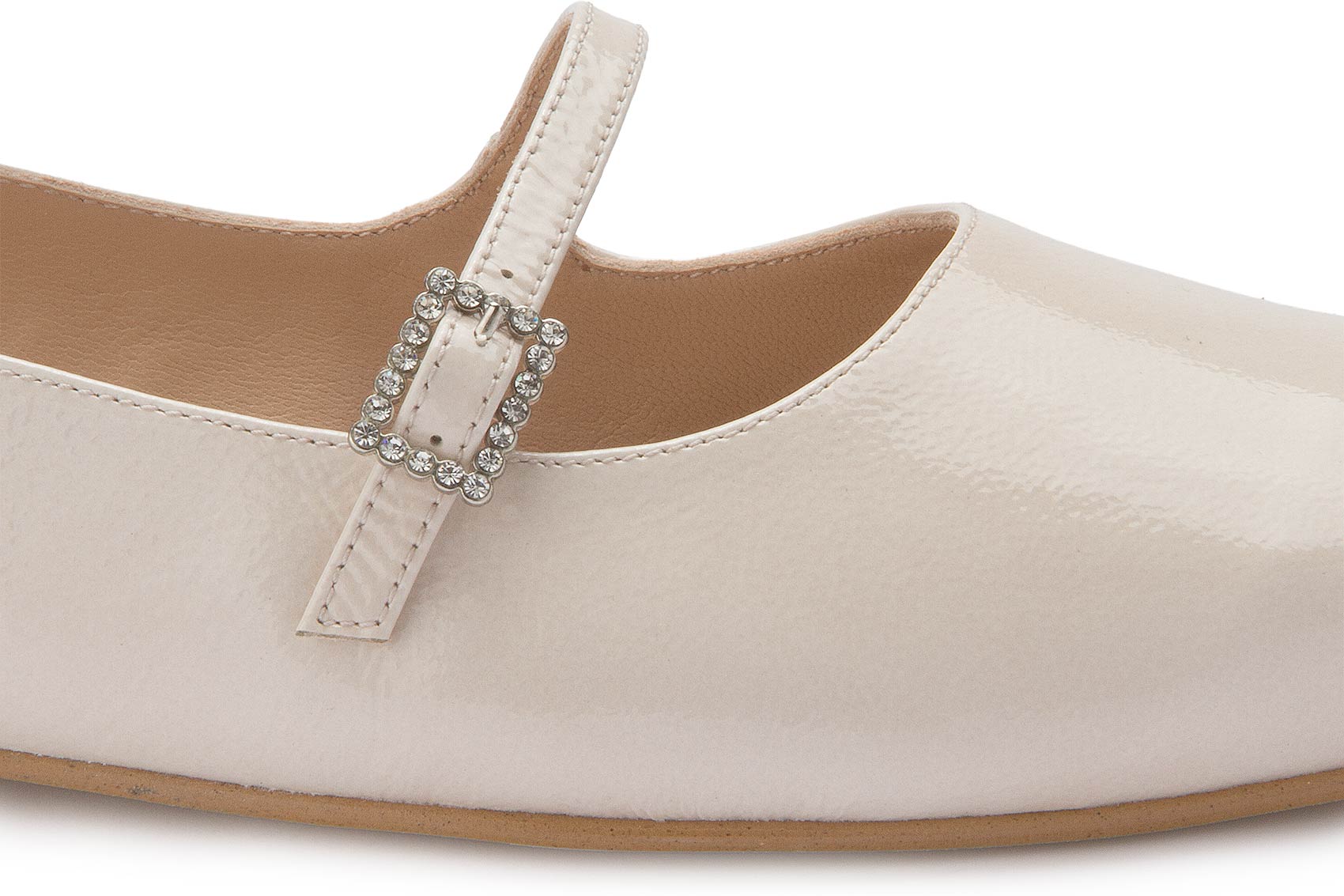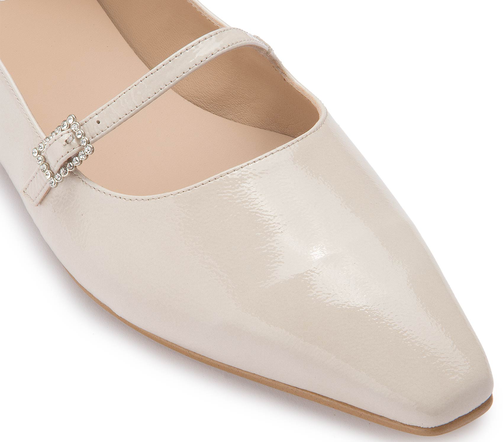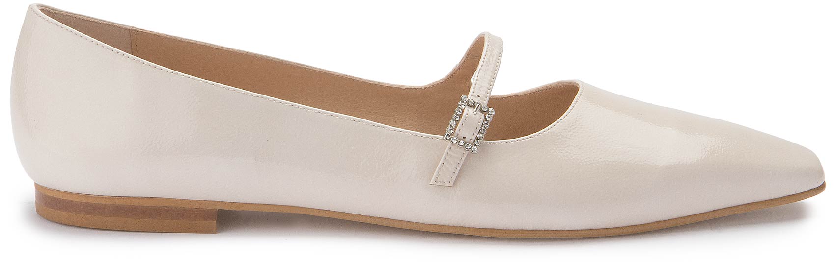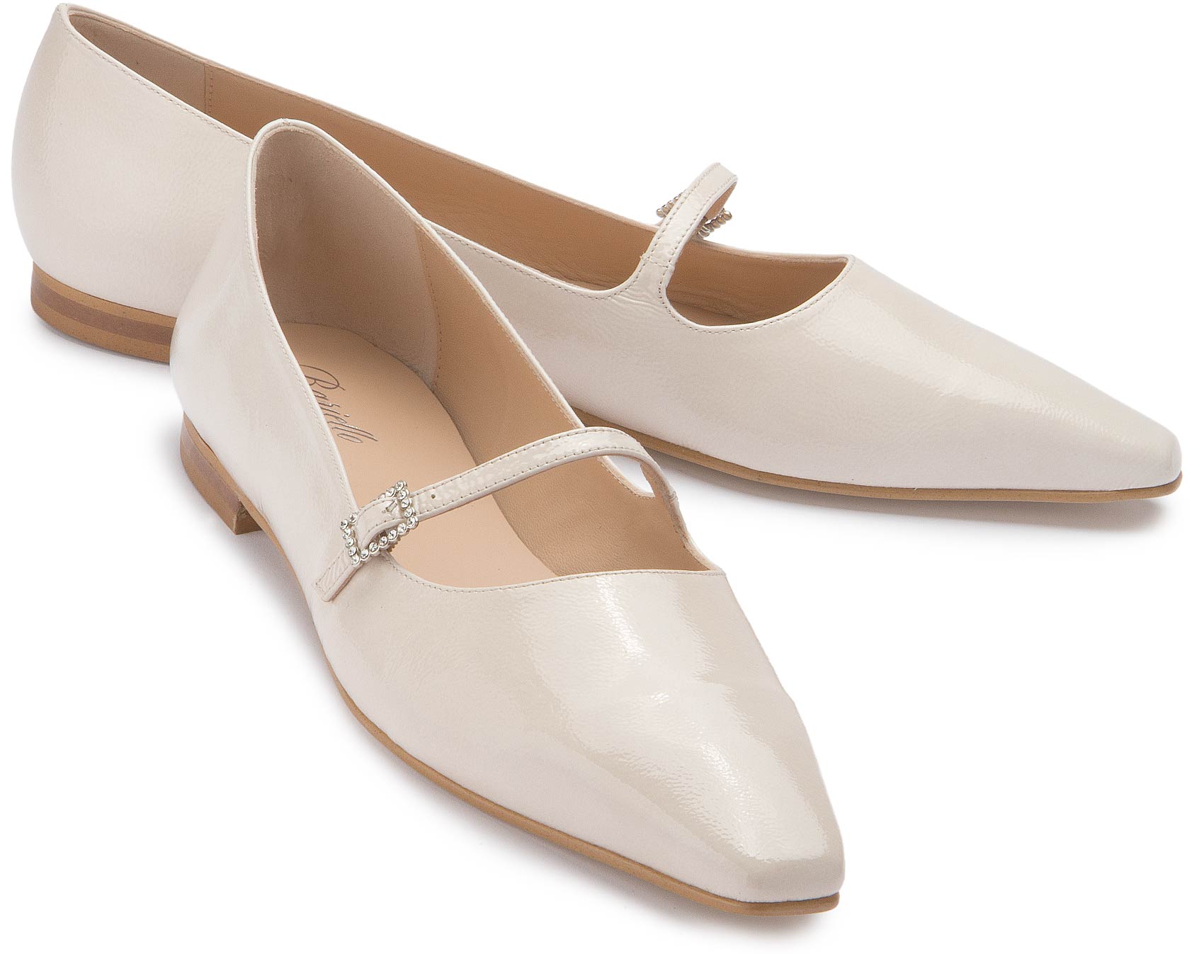 Diese eleganten Ballerinas von Bariello überzeugen mit ihrem edlen Lackleder in zartem Cremeweiß. Der schmale Riemen mit funkelnder Schnalle verleiht dem Schuh eine feminine Note und sorgt gleichzeitig für sicheren Halt. Ideal für stilvolle Auftritte – ob im Alltag oder zu besonderen Anlässen.