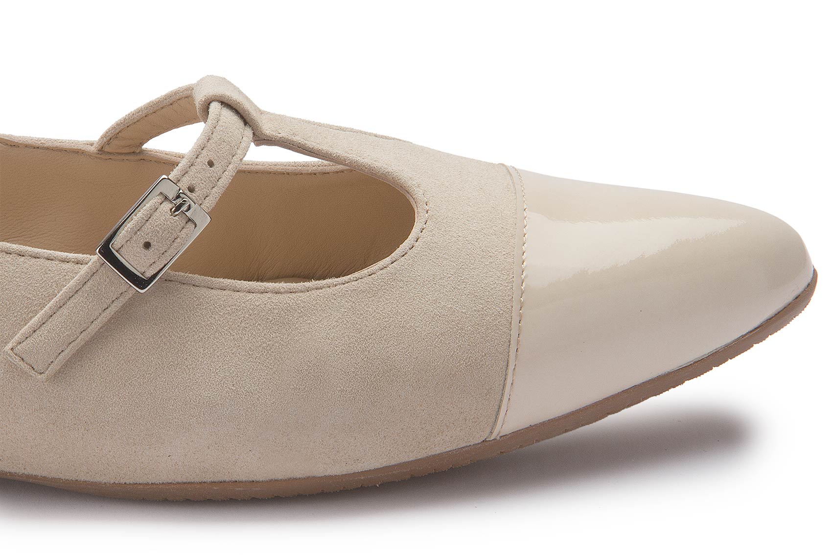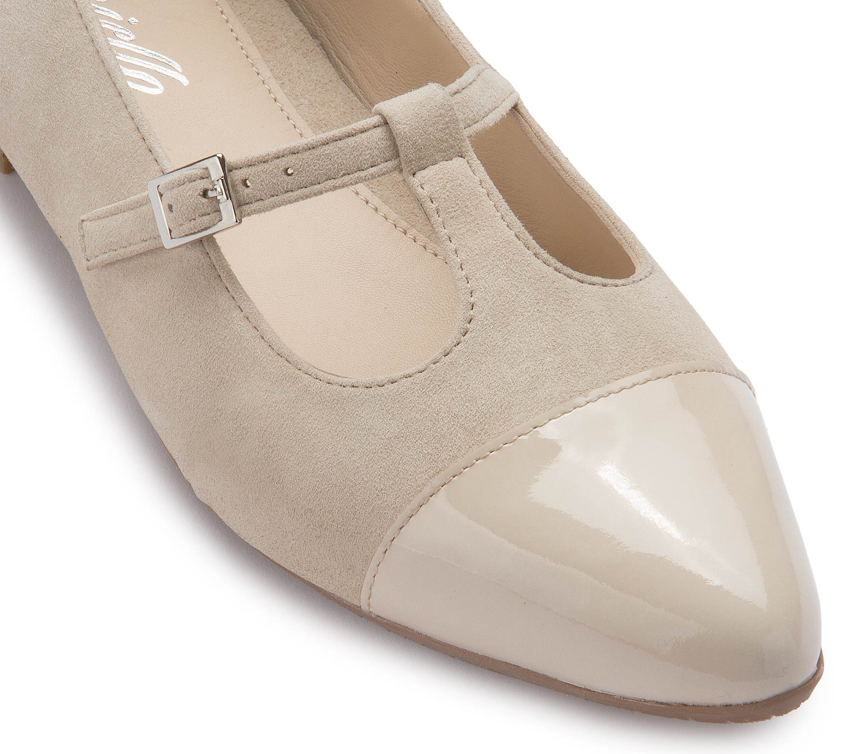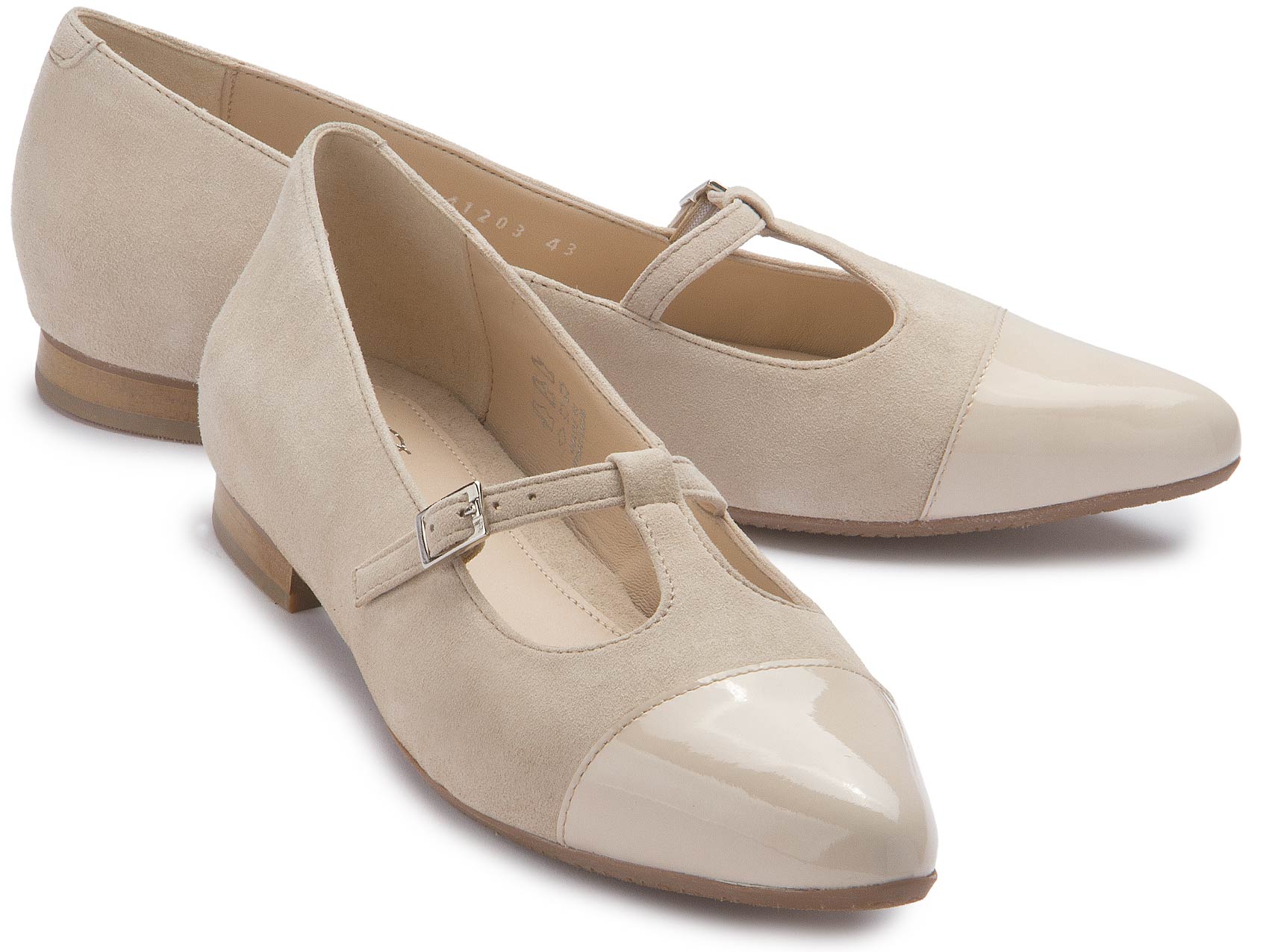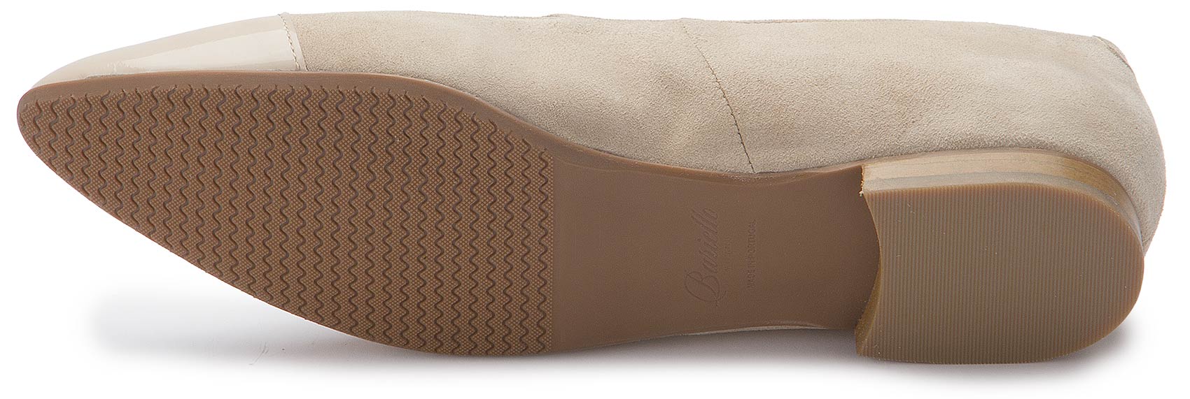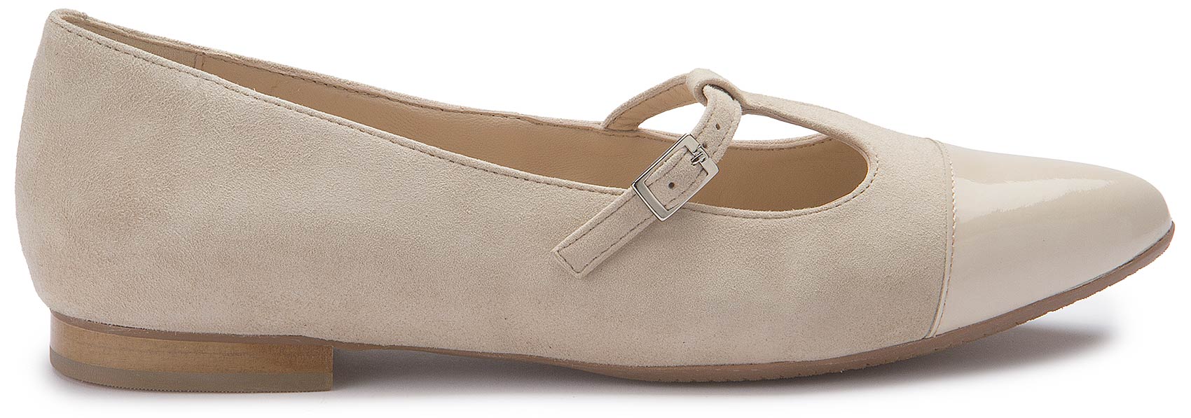 Dieser elegante Ballerina von Bariello kombiniert klassisches Design mit modernen Akzenten. Die gelungene Mischung aus weichem Rauleder und glänzender Lackspitze verleiht dem Modell eine edle Ausstrahlung. Der seitliche Riemen sorgt für optimalen Halt und unterstreicht den stilvollen Look. Perfekt für modebewusste Auftritte – ob im Büro oder zu besonderen Anlässen.