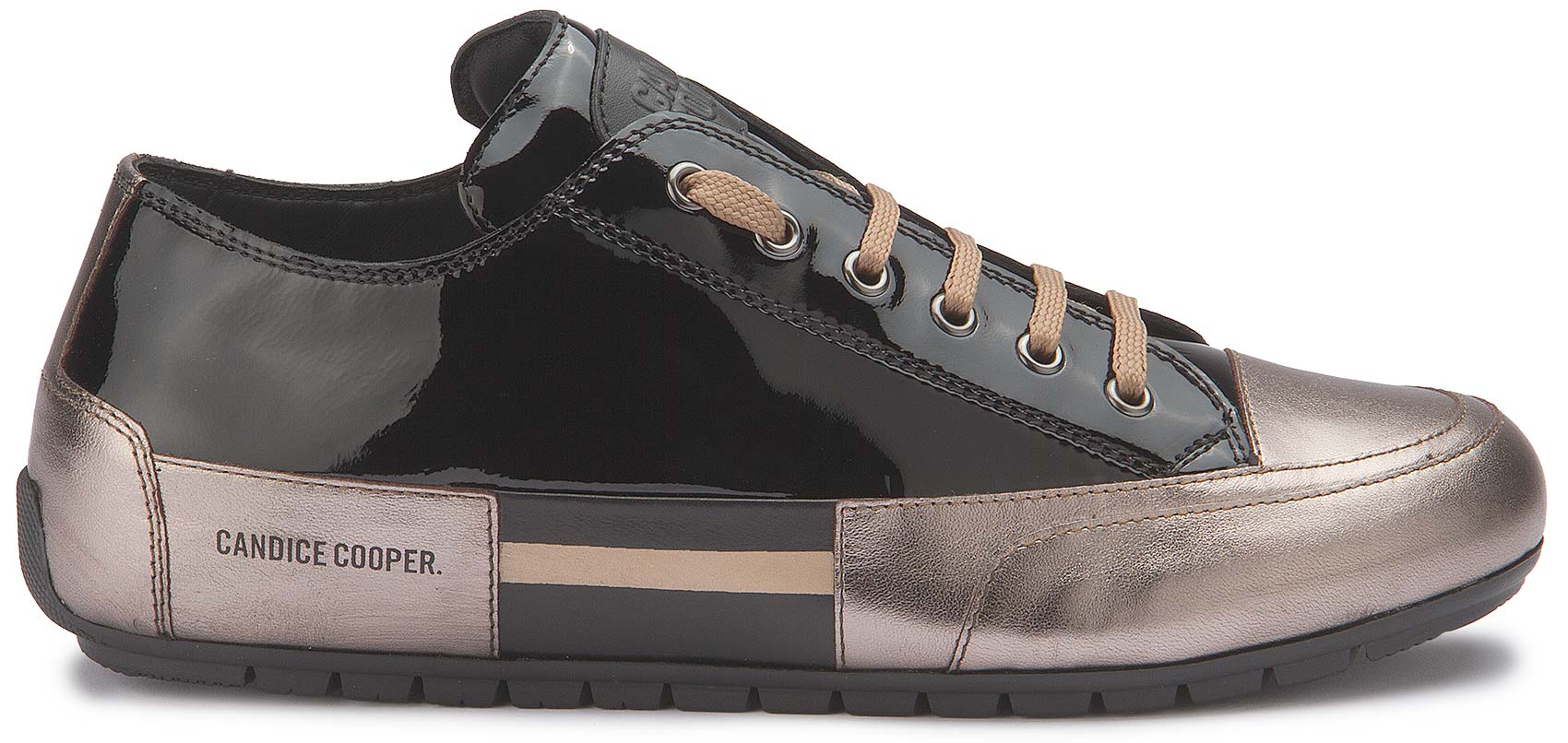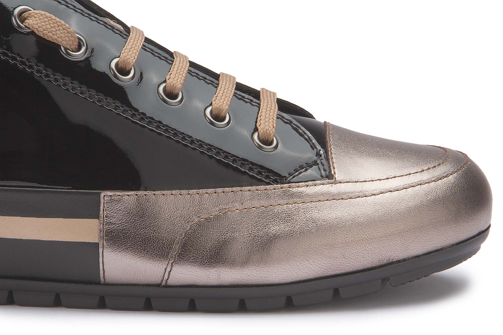 Niedrige Sneaker mit Linien, die von den Basketballmodellen der 90er Jahre inspiriert sind. Das Obermaterial aus Lackleder wird durch Ledereinsätze an Zehen und Fersen sowie den Rand mit sichtbaren Steppnähten und die laminierte Unterseite ergänzt. Die herausnehmbare Innensohle und die dünne Gummisohle runden das Design ab.