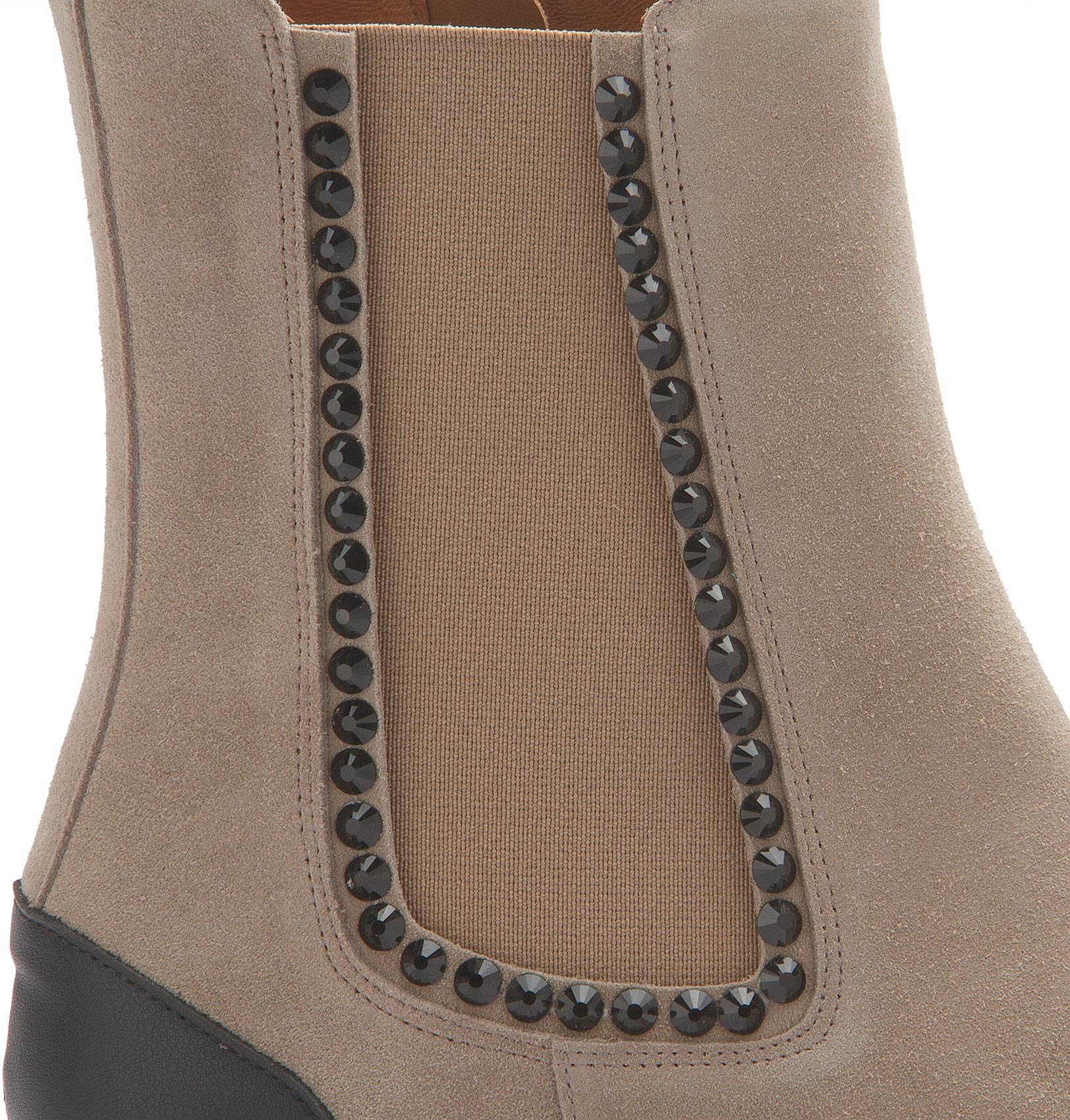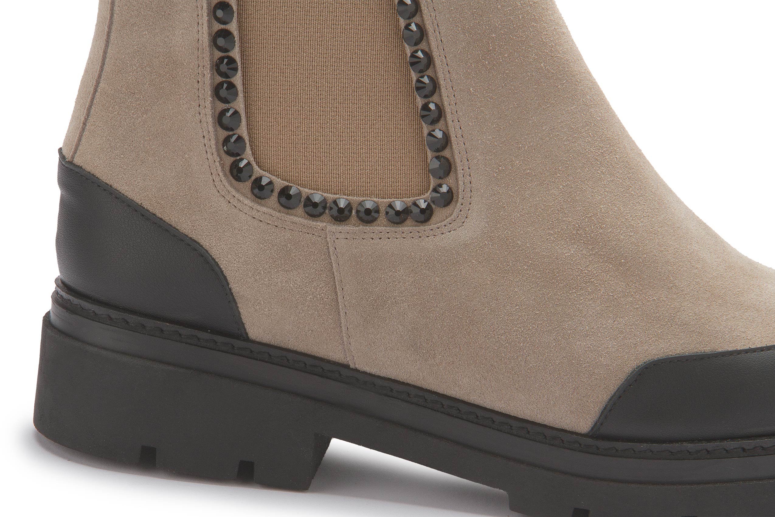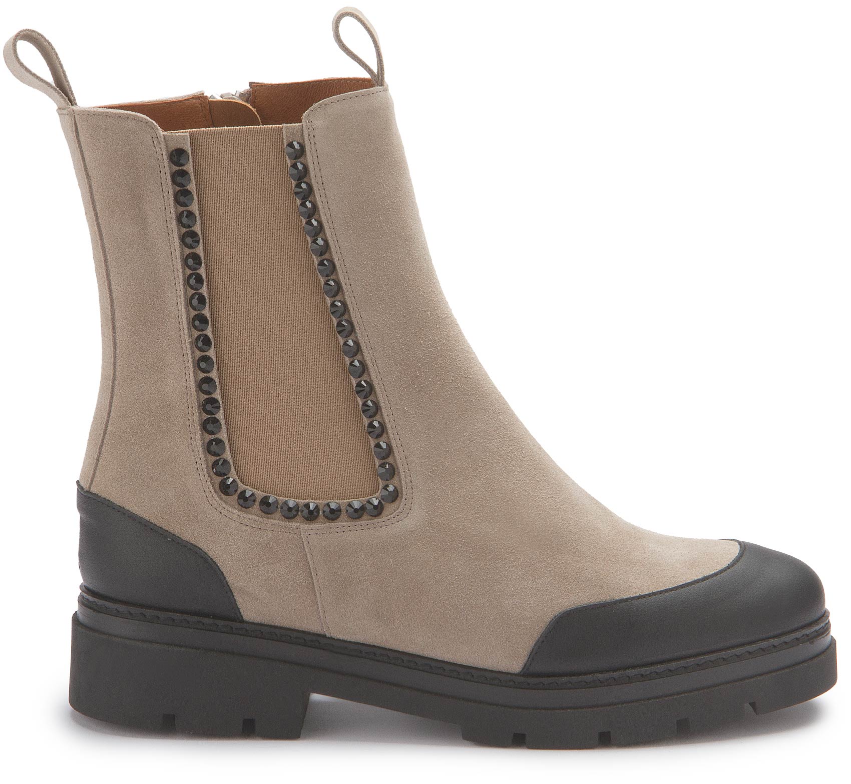Toller Chelsea Boot von Bariello in feinem Veloursleder. Die schwarze Kappe aus Glattleder gibt dem Boot ein markantes Aussehen. Die Steinchen um den klassischen Gummi-Einsatz runden das Design perfekt ab. Ein wahres Highlight in jedem Schuhschrank!