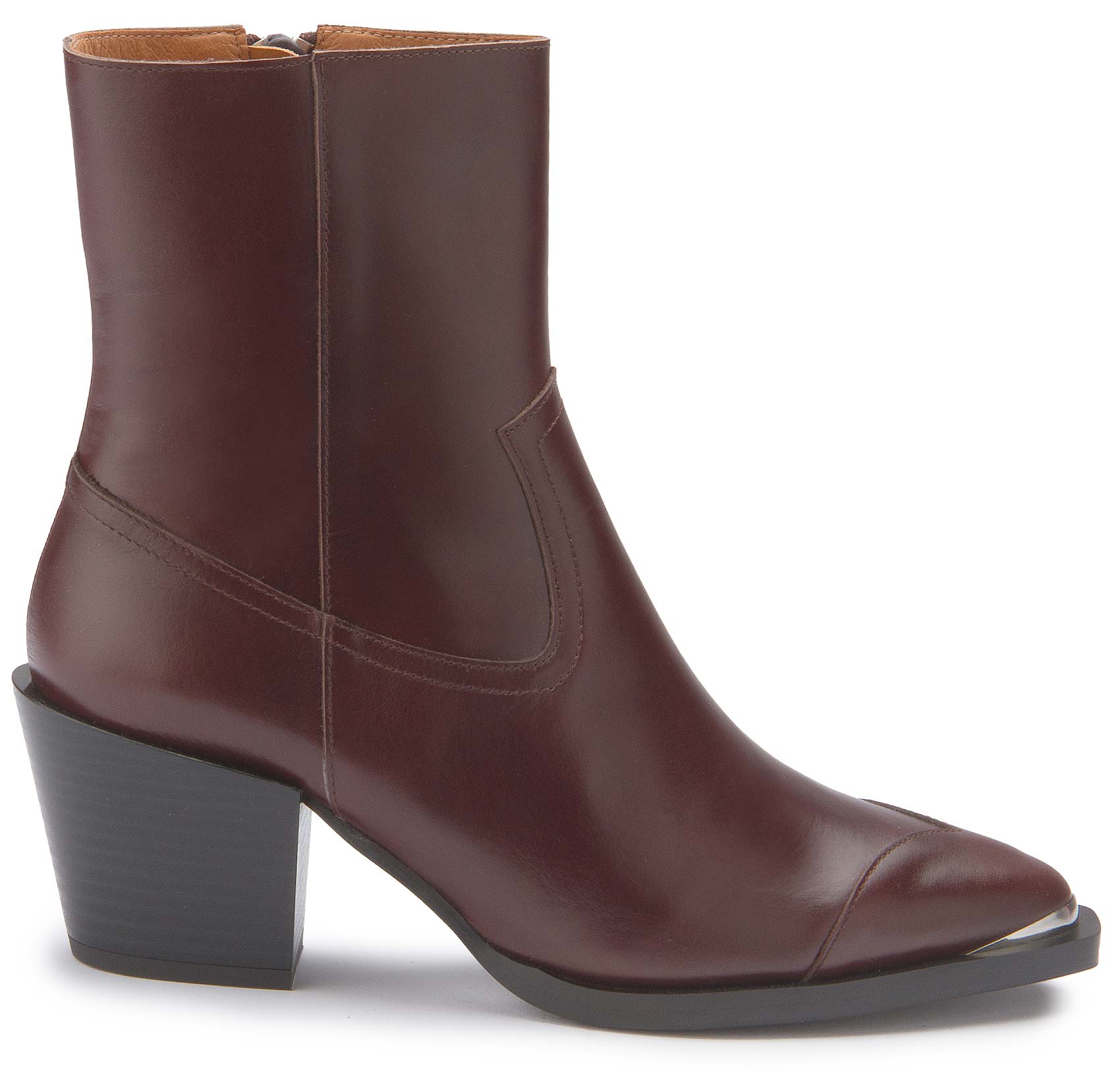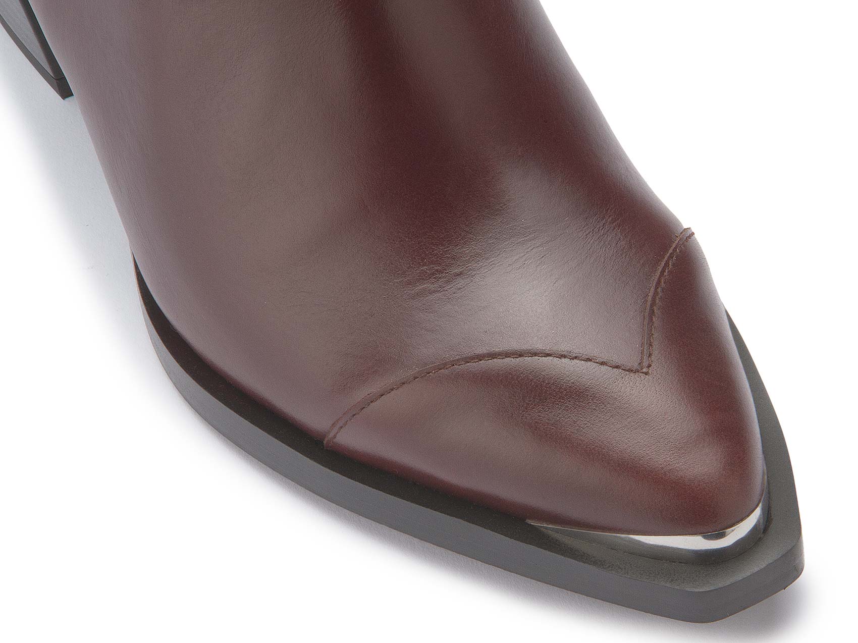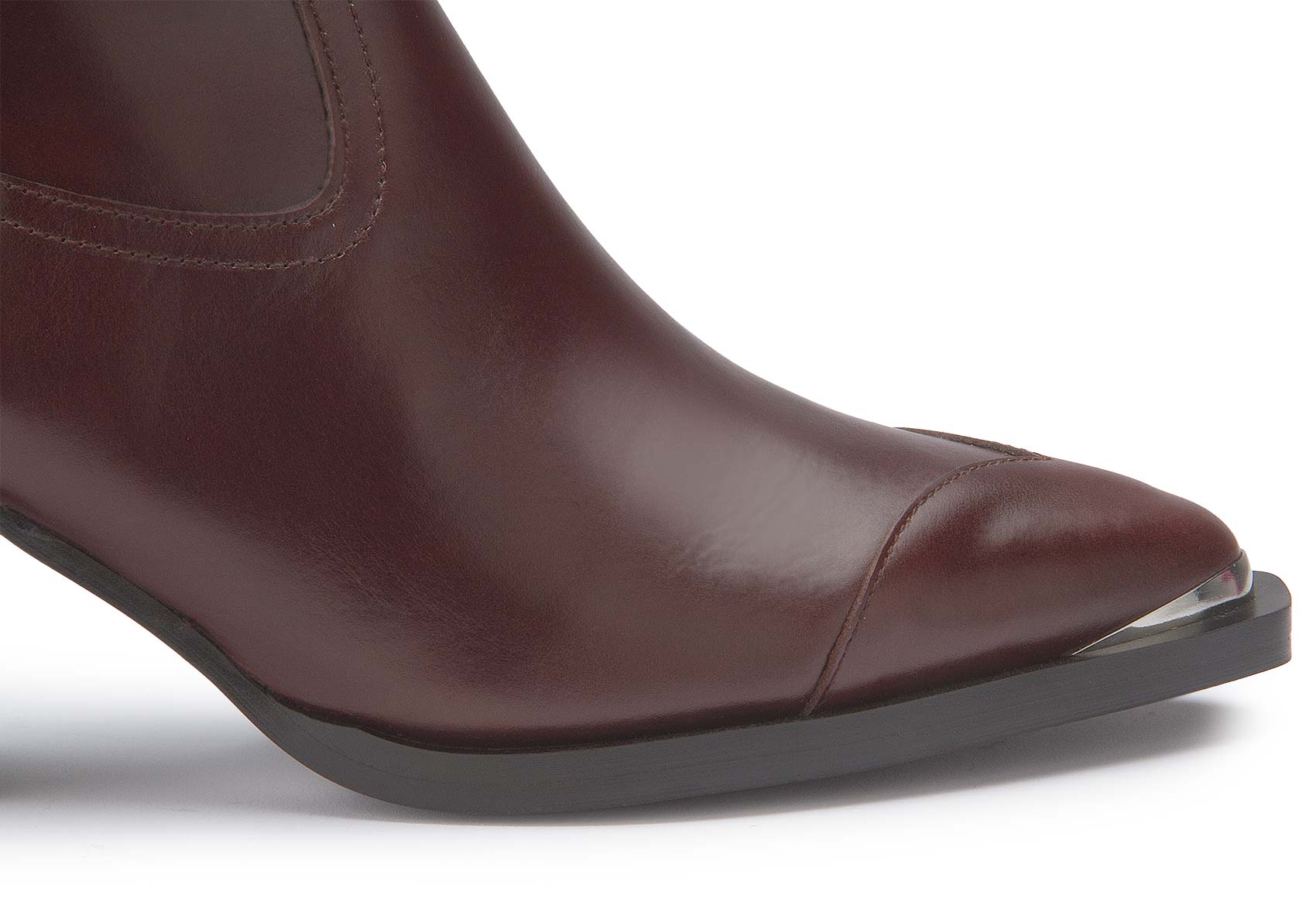 Dieser Stiefel von Bariello überzeugt mit puristischer Eleganz und raffiniertem Detail: Glänzendes, braunfarbenes Glattleder trifft auf eine markant geformte Spitze mit Metallapplikation. Der bequeme Blockabsatz und der seitliche Reißverschluss machen ihn zum idealen Begleiter für stilvolle Auftritte mit urbanem Charakter.