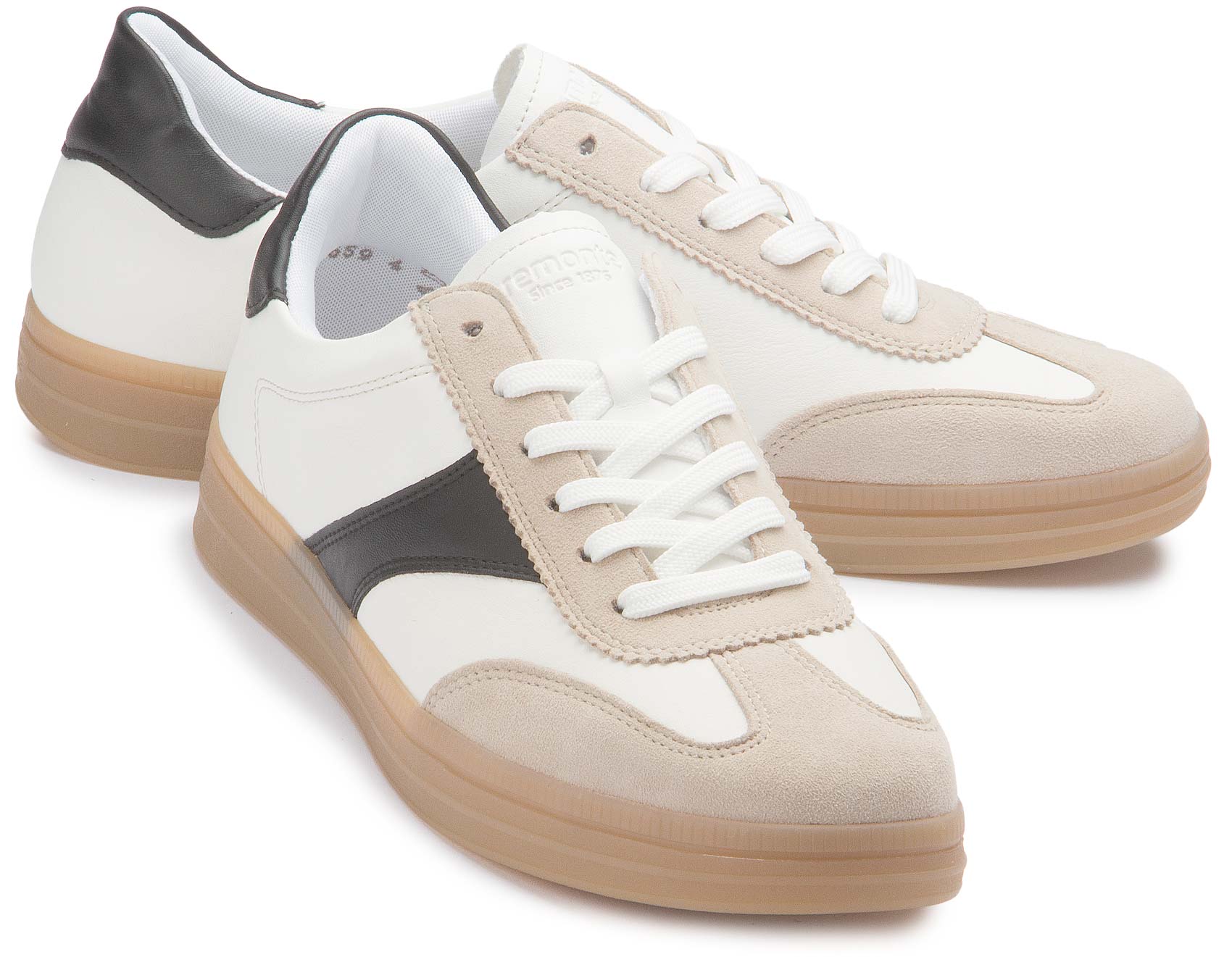 Mehr Bewegungsfreiheit für die Füße! Diese weißbeigen remonte Sneaker kombinieren trendigen Design mit unvergleichlichem Tragekomfort. Zudem sorgt die Schnürung für einen optimalen Sitz am Fuß. Das Design wird durch die gepolsterte und herausnehmbare Einlegesohle zusammen mit einer dämpfenden und flexiblen Sohle ergänzt. Dieser Schuh ist in Komfortweite. Das Innenfutter aus Microvelour ist leicht und atmungsaktiv und sorgt somit den ganzen Tag über für ein angenehmes Tragegefühl. Jackpot!