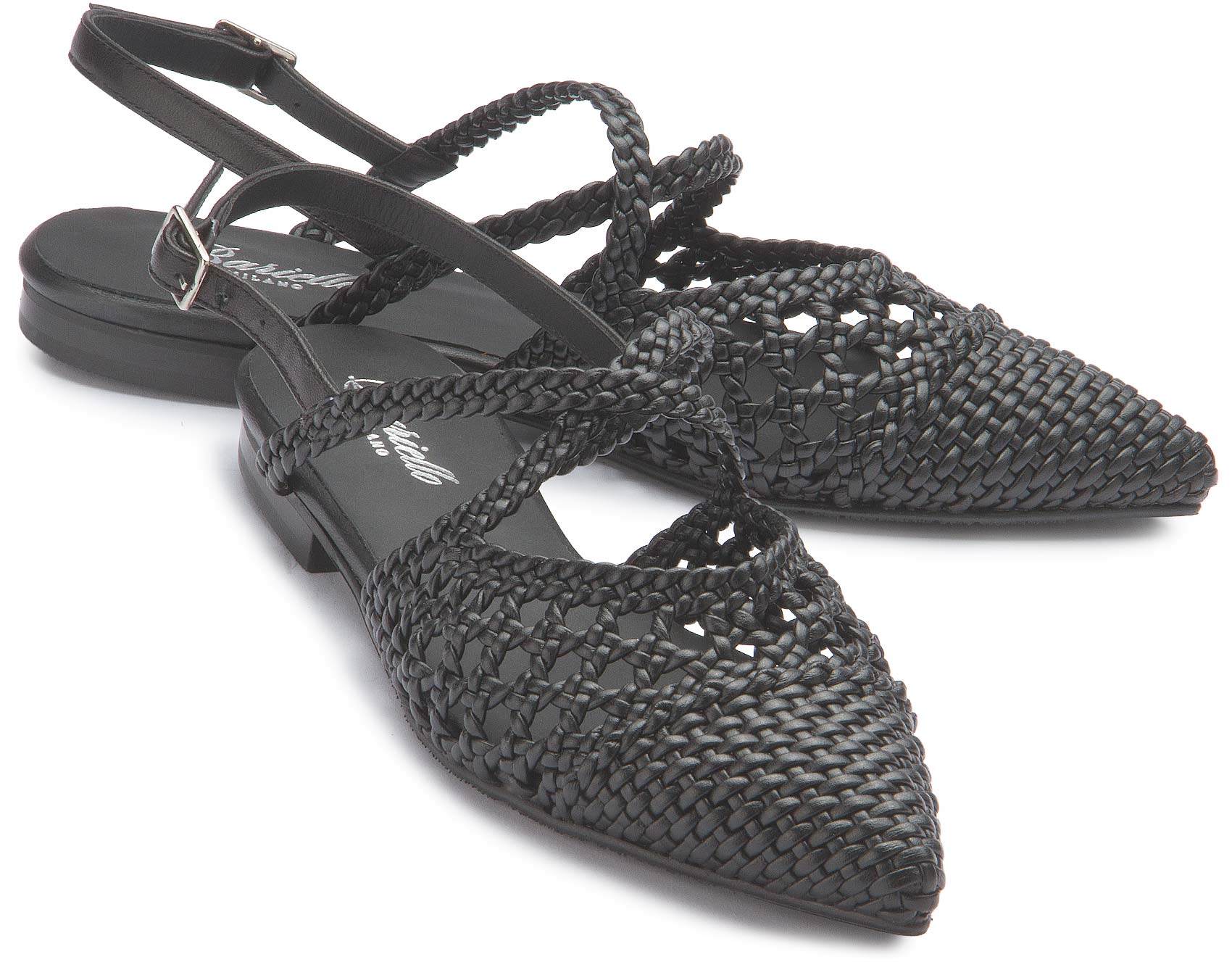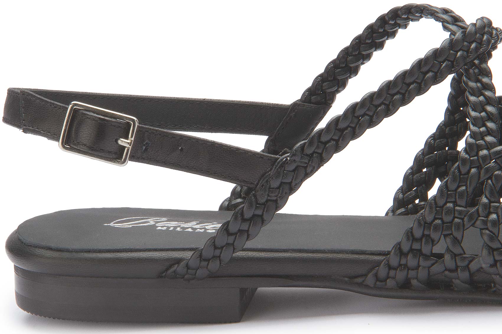 Diese Sandalette von Bariello Milano fällt mit ihrem kunstvoll geflochtenen Design und der eleganten Farbe sofort ins Auge. Der verstellbare Fersenriemen sorgt für sicheren Halt, während die flache Sohle angenehmen Tragekomfort bietet. Ein stilvoller Schuh, der sommerlichen Outfits eine frische und moderne Note verleiht.
