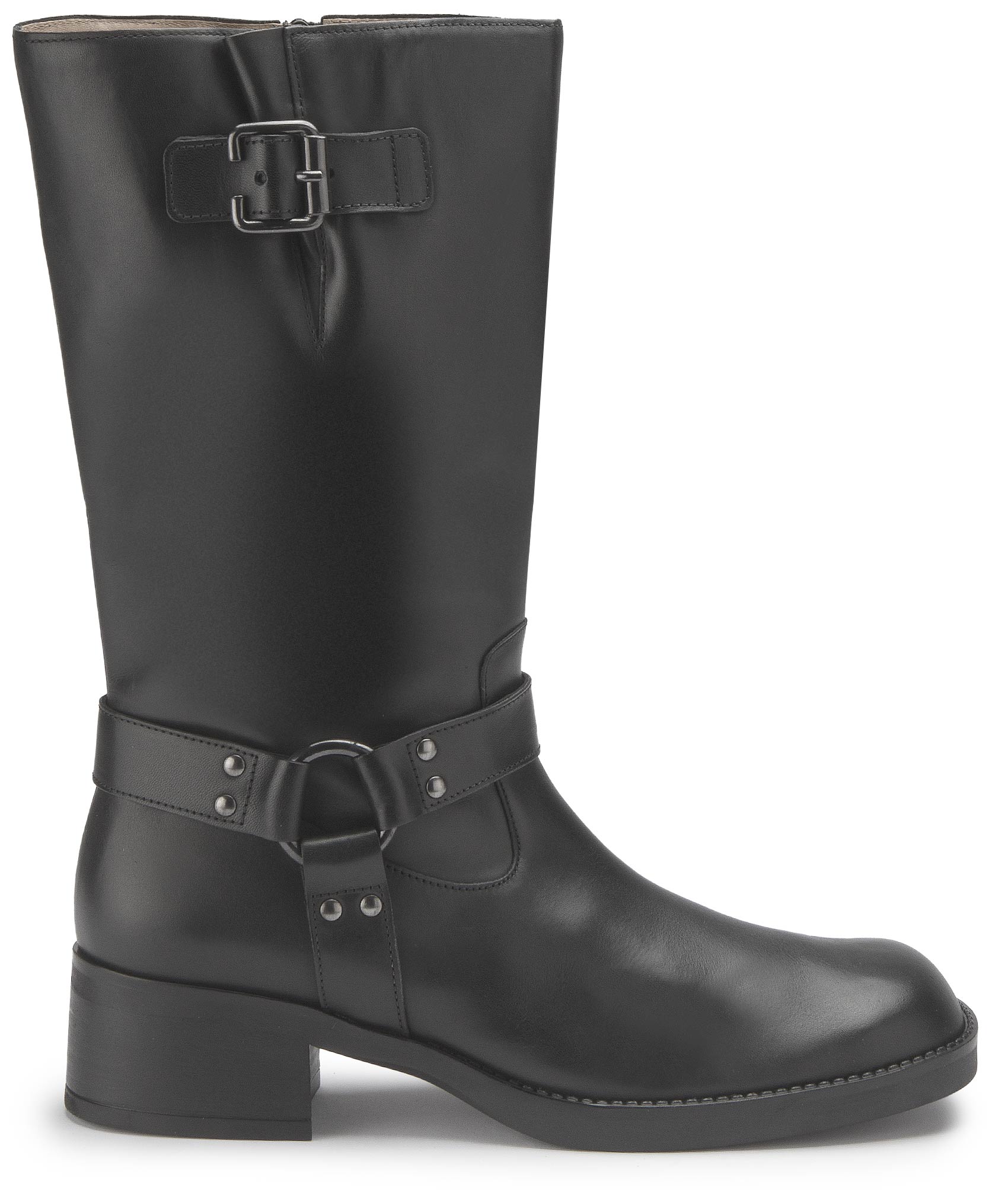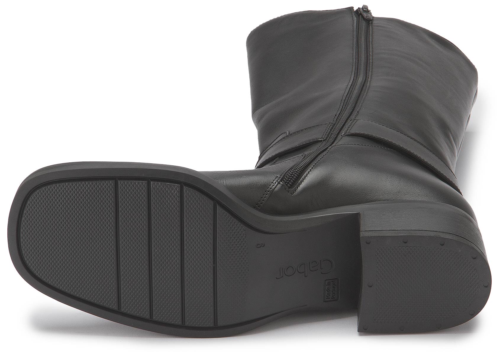 Discover the Gabor ankle boot in elegant black with a side zipper and decorative buckle. The stable block heel ensures comfort and a stylish silhouette. Perfect for versatile outfits from casual to chic - a must-have for every wardrobe.