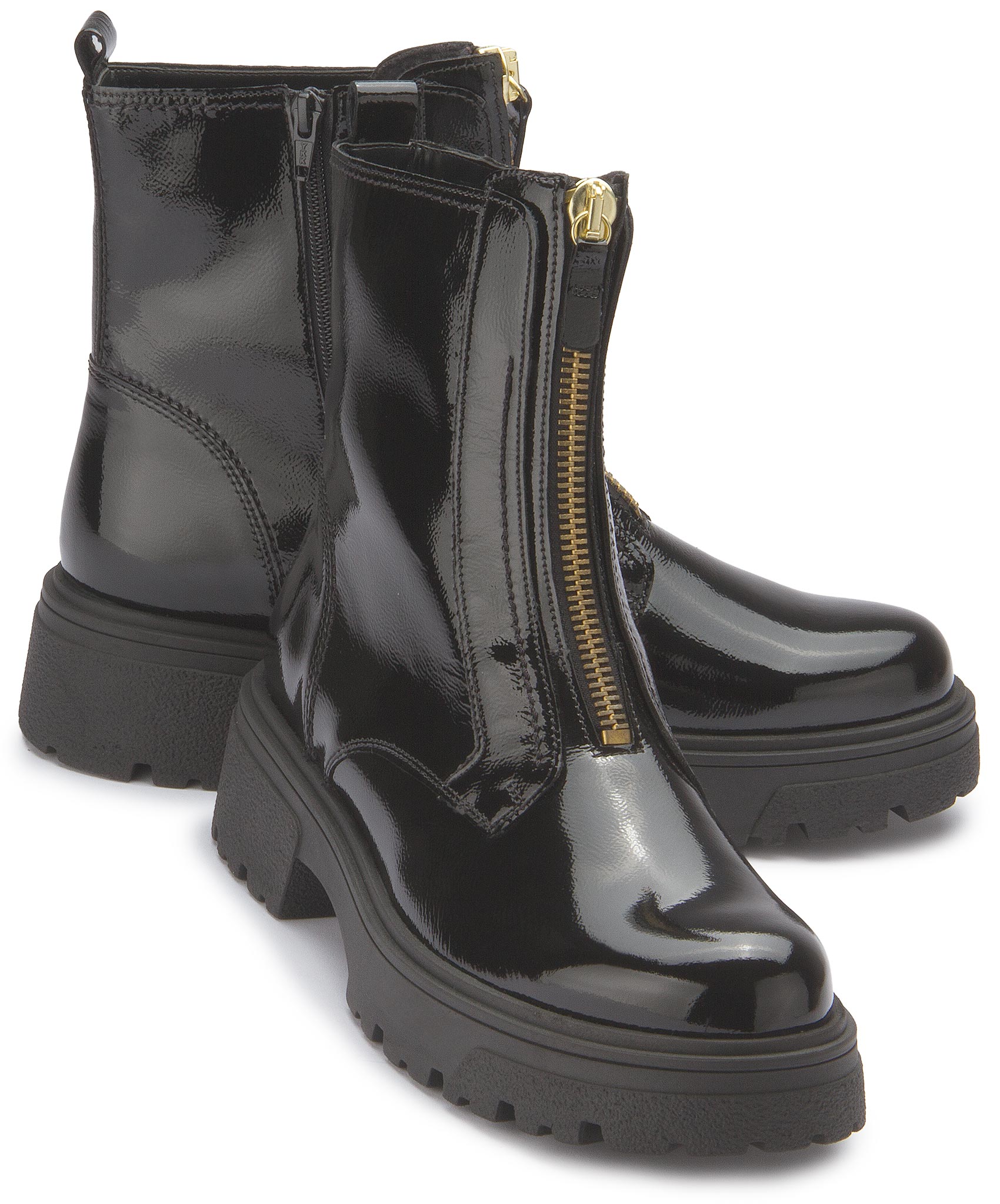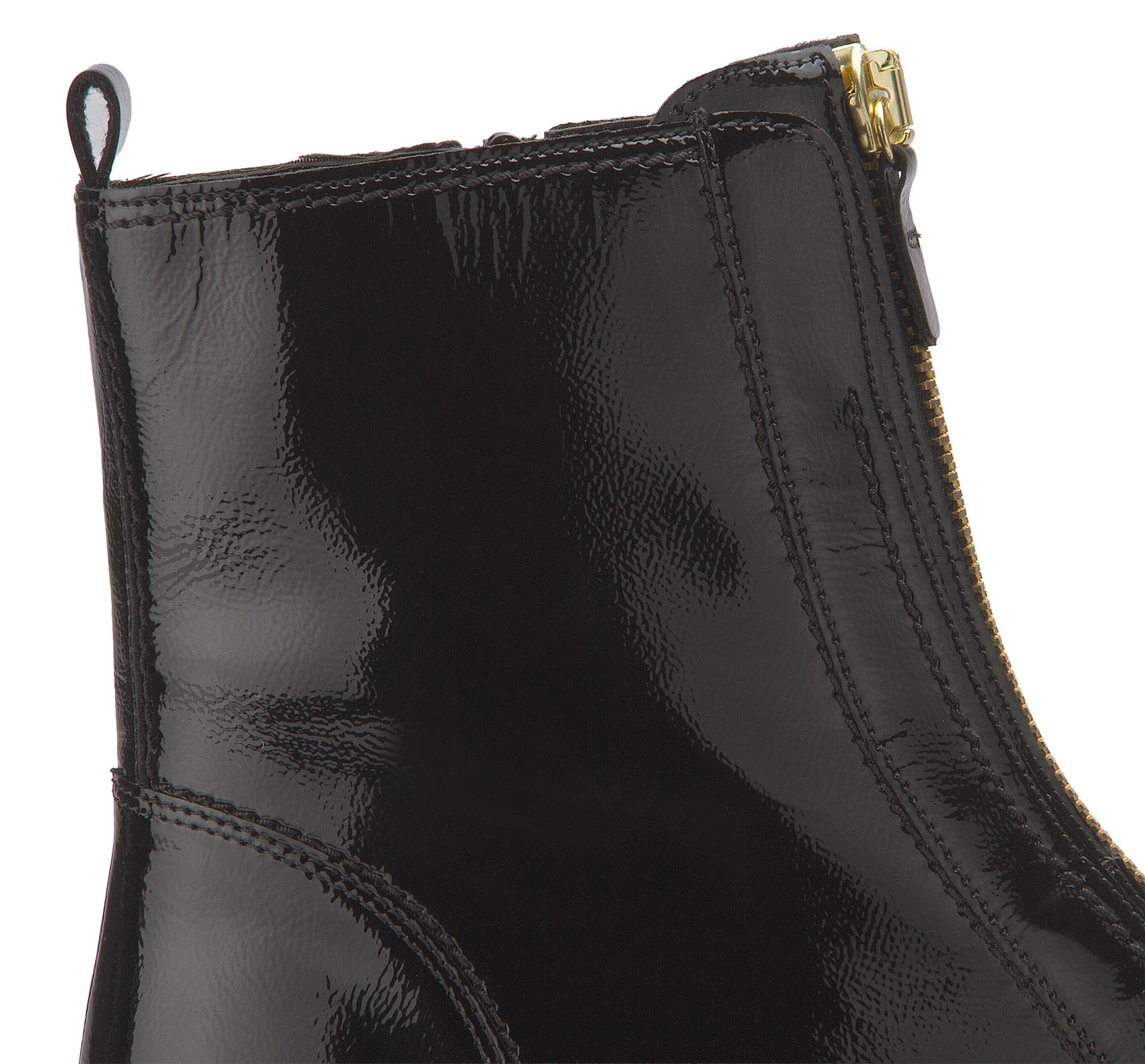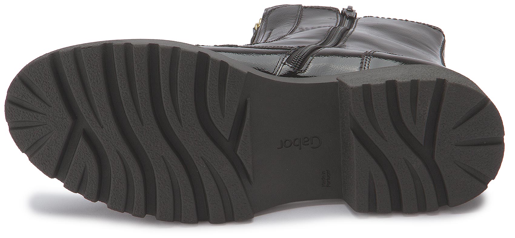 The black patent leather ankle boot from Gabor impresses with its modern look and practical details. With a zipper on the side and an additional zipper at the front, the shoe is easy to put on and take off. The stable block heel ensures a high level of comfort and gives the style an elegant silhouette. A versatile companion for stylish looks.