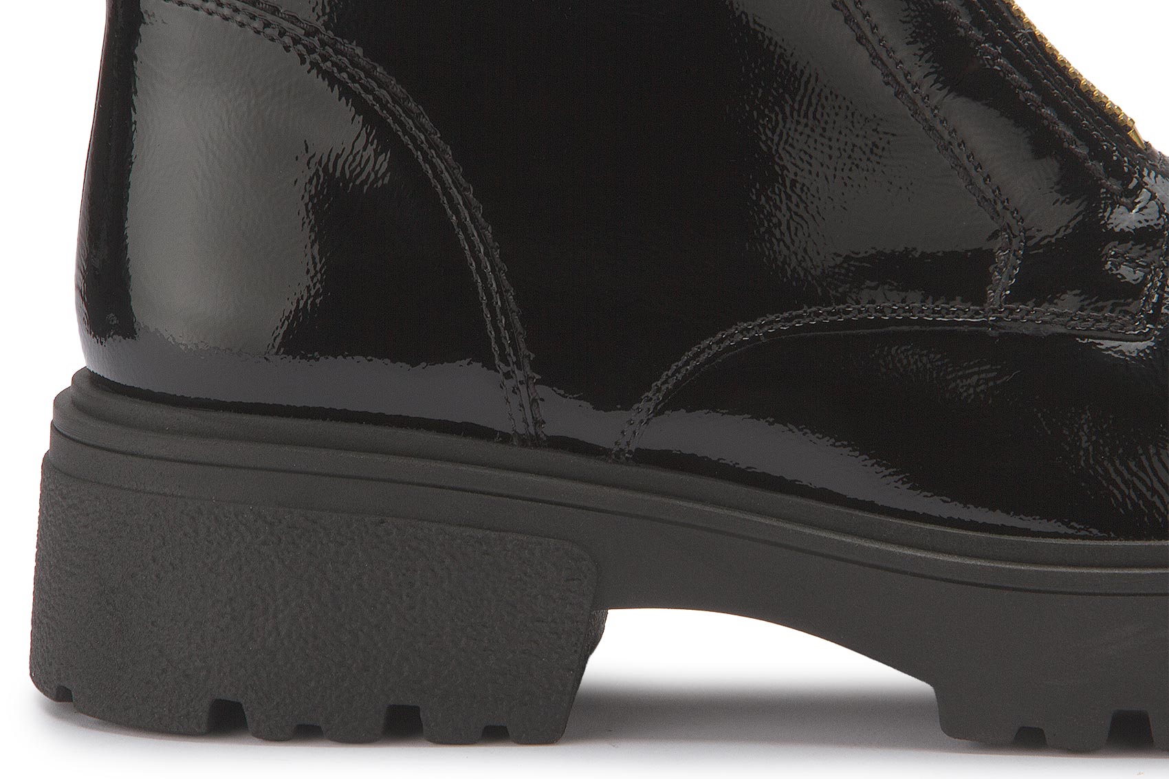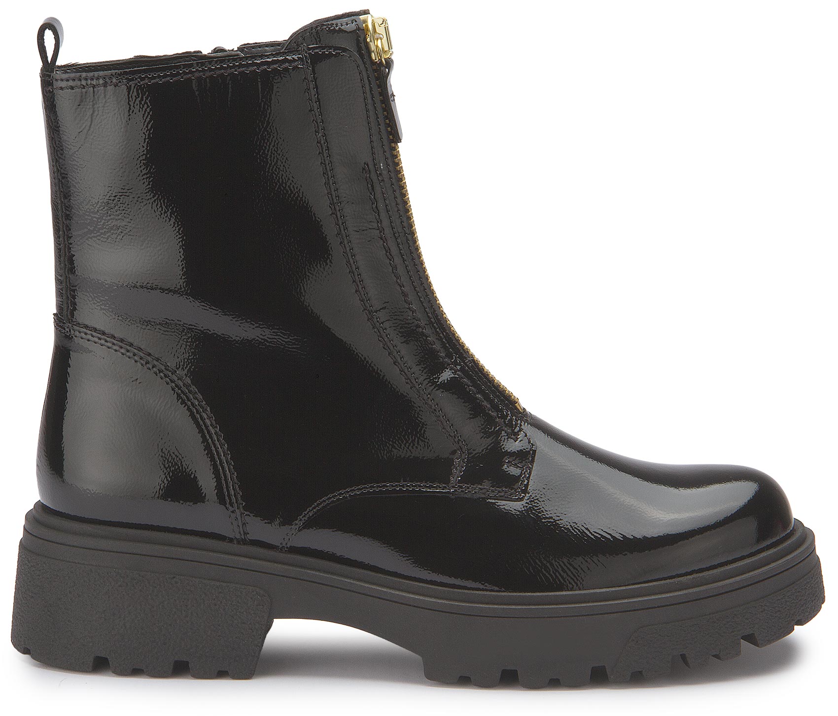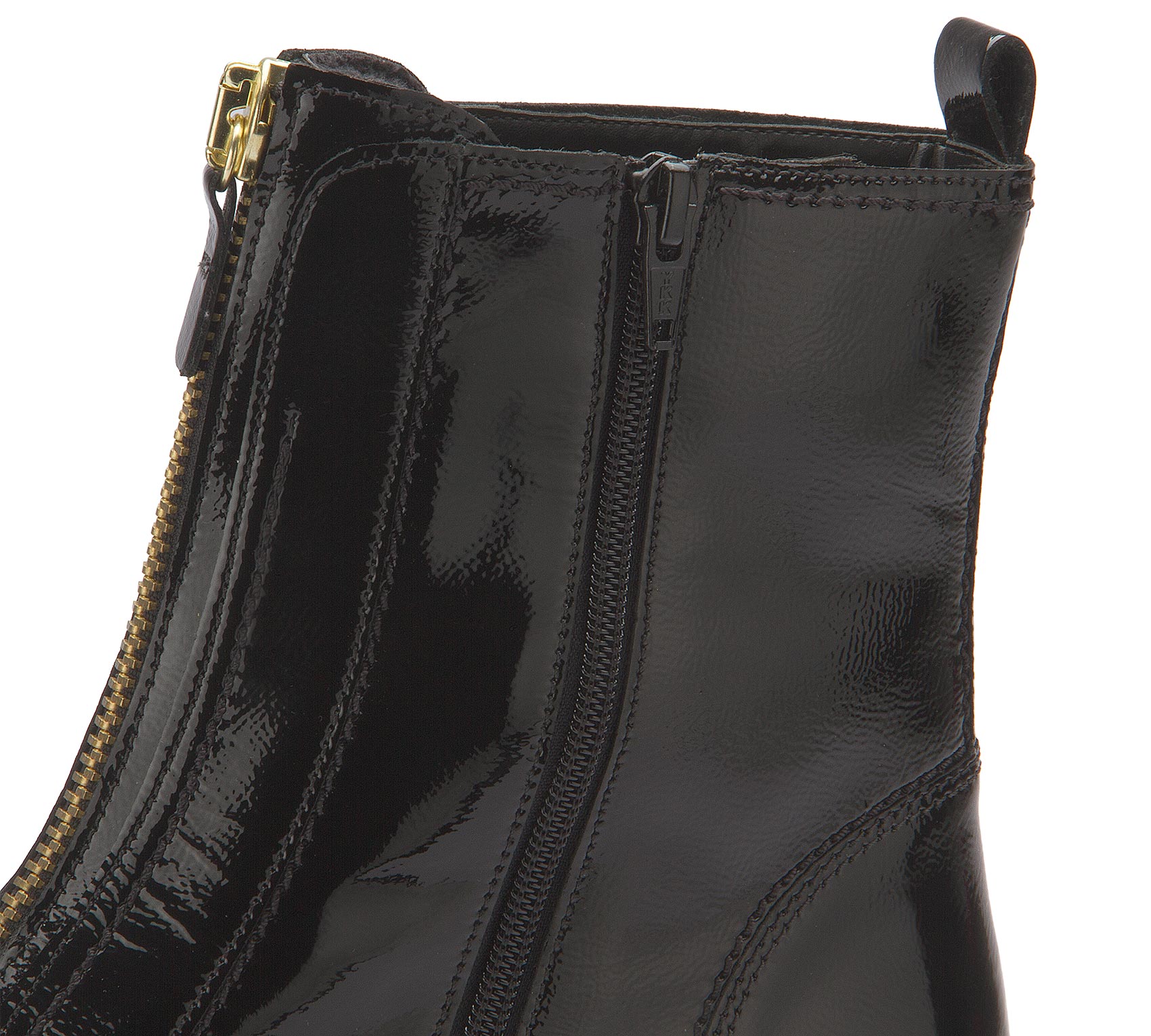 The black patent leather ankle boot from Gabor impresses with its modern look and practical details. With a zipper on the side and an additional zipper at the front, the shoe is easy to put on and take off. The stable block heel ensures a high level of comfort and gives the style an elegant silhouette. A versatile companion for stylish looks.
