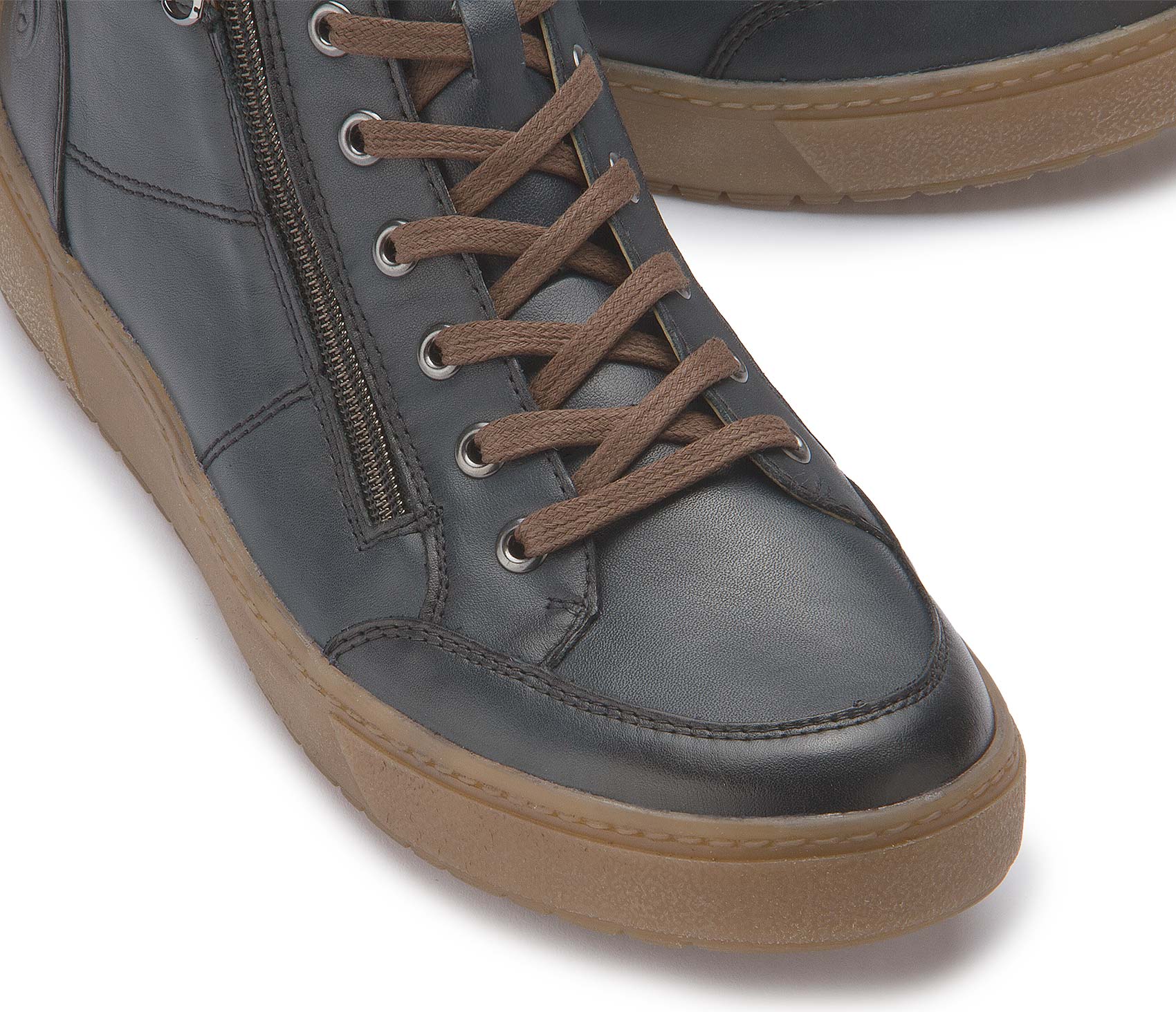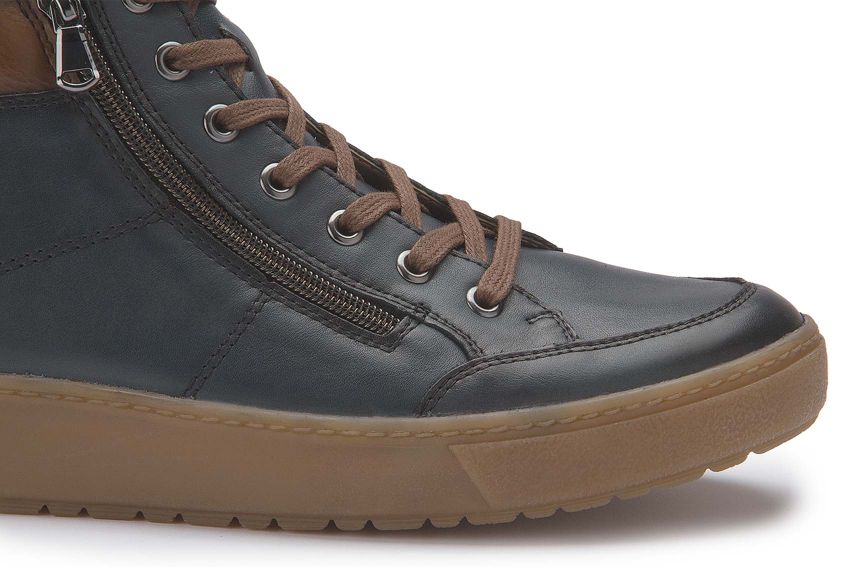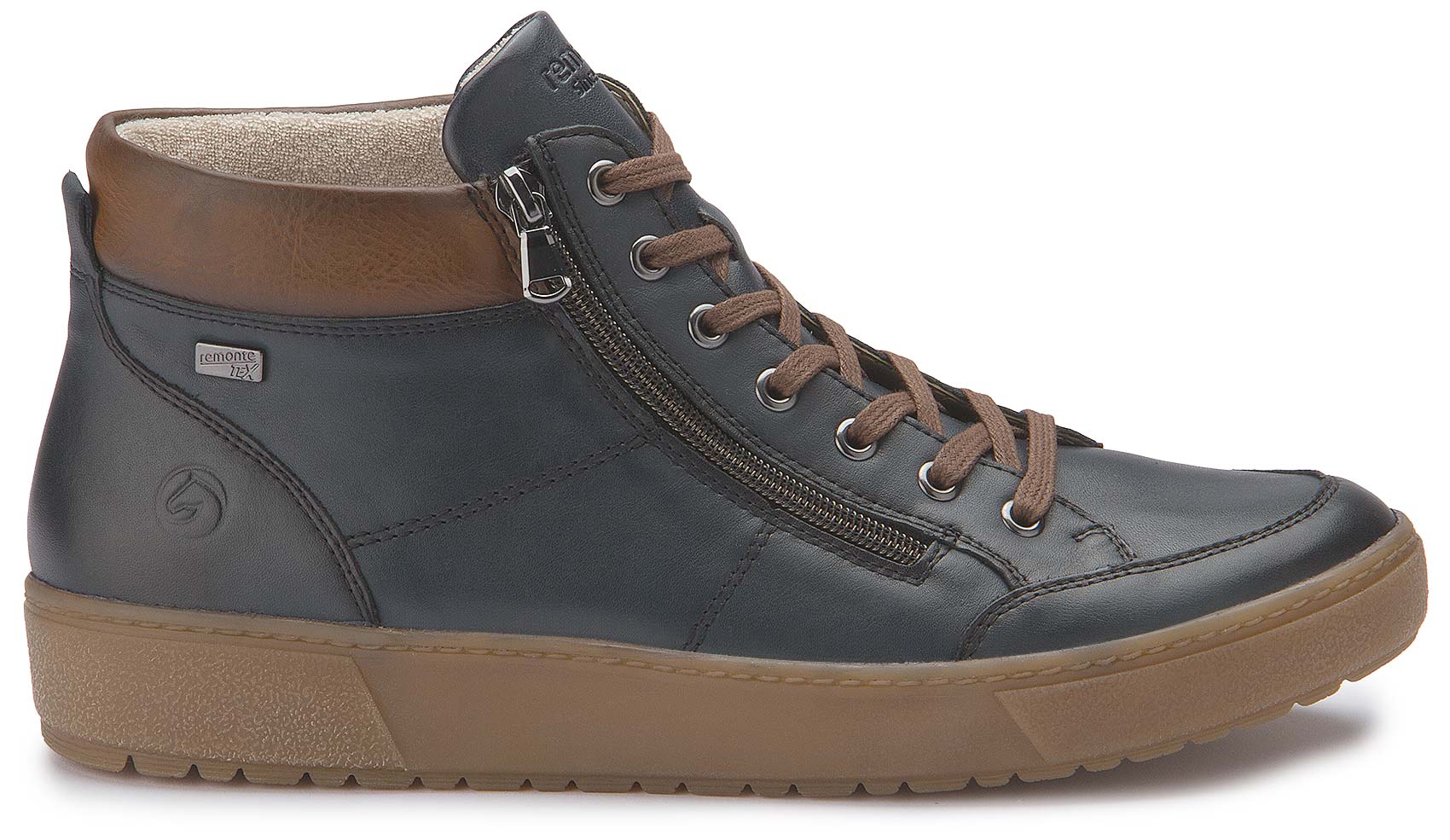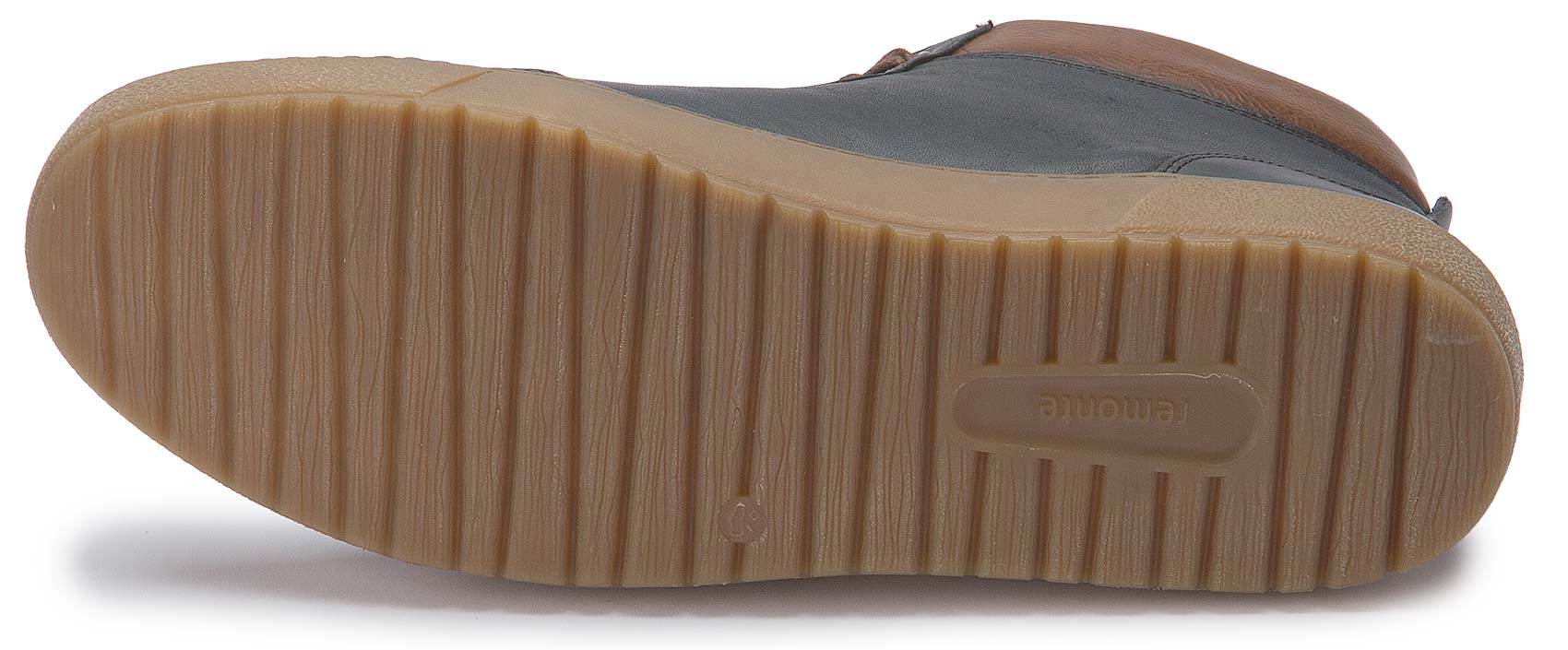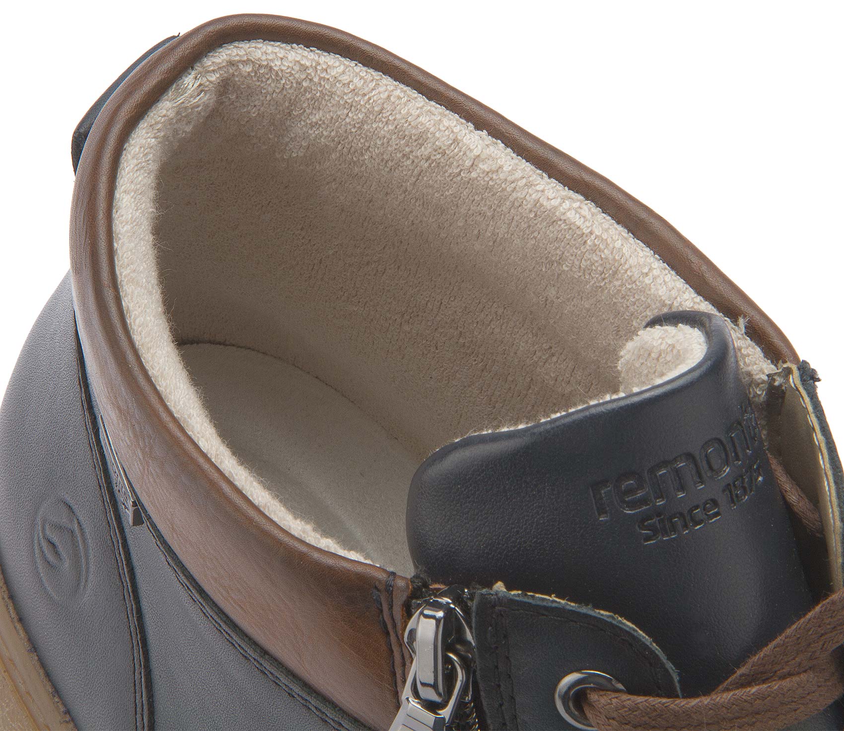 Attention, favorite shoe potential! These blue remonte ankle boots made of smooth leather are absolute all-rounders! The ingenious combination of lacing and zipper makes them easy to put on and take off. The grippy and flexible sole, together with the padded and removable insole, creates a pleasant feeling underfoot. Thanks to the comfort width, there is plenty of room in the forefoot area. The water-repellent upper ensures dry feet even on wet and cold days. This means: endless strolling is no problem at all!