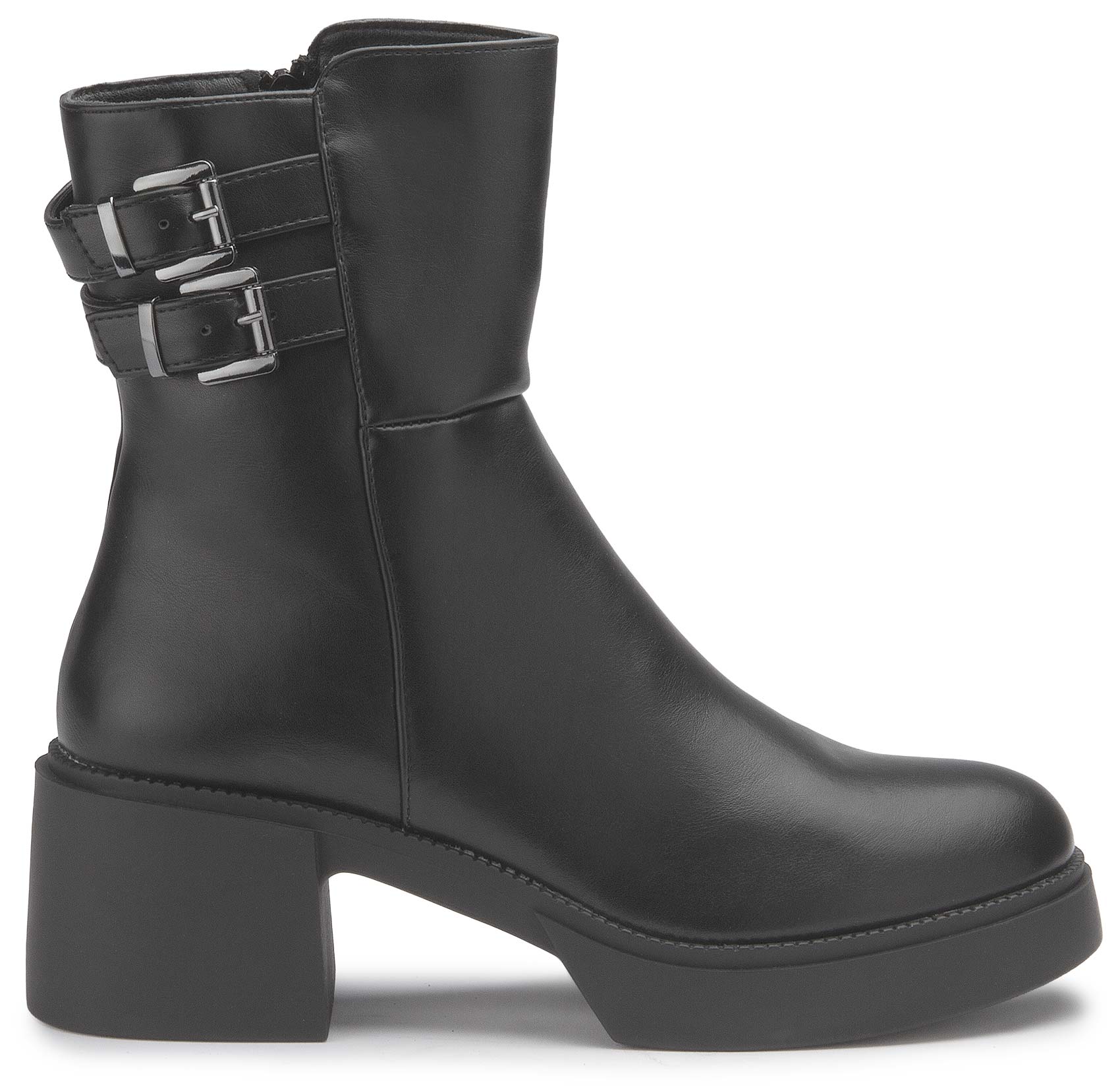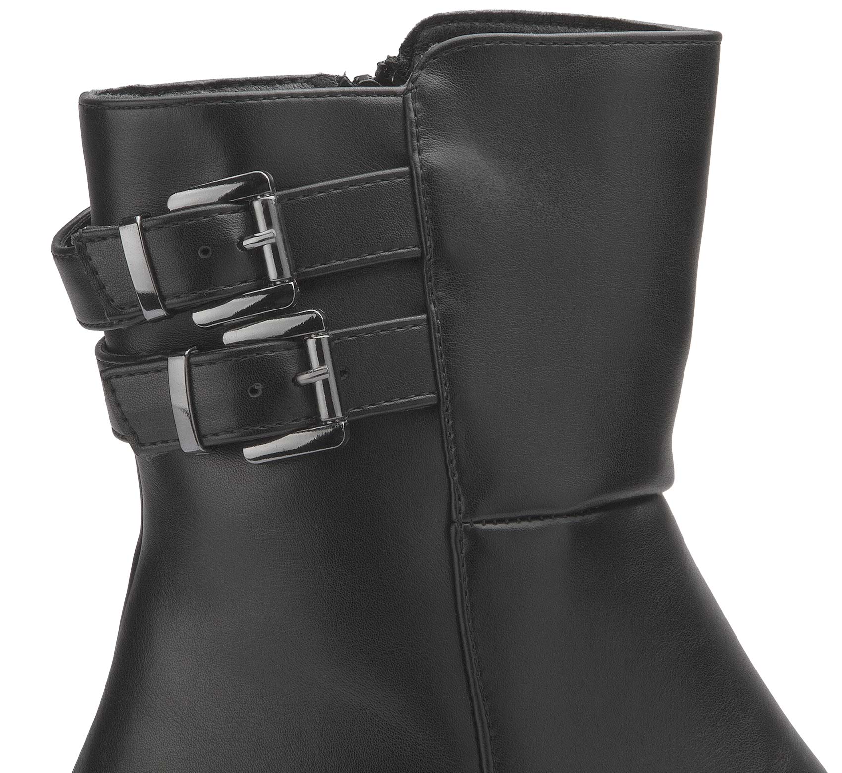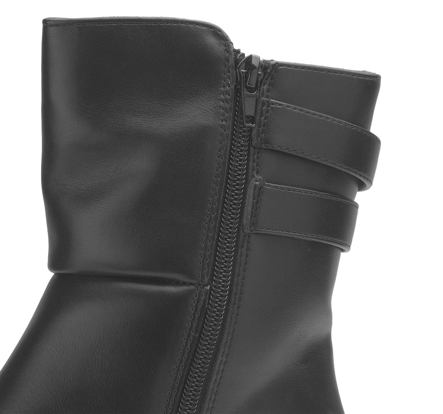 These trendy ankle boots set stylish accents with their striking block heel and decorative double straps. The smooth black upper material creates a modern, sophisticated look, while the sturdy sole and side zipper offer a high level of comfort. A fashion statement for confident appearances.