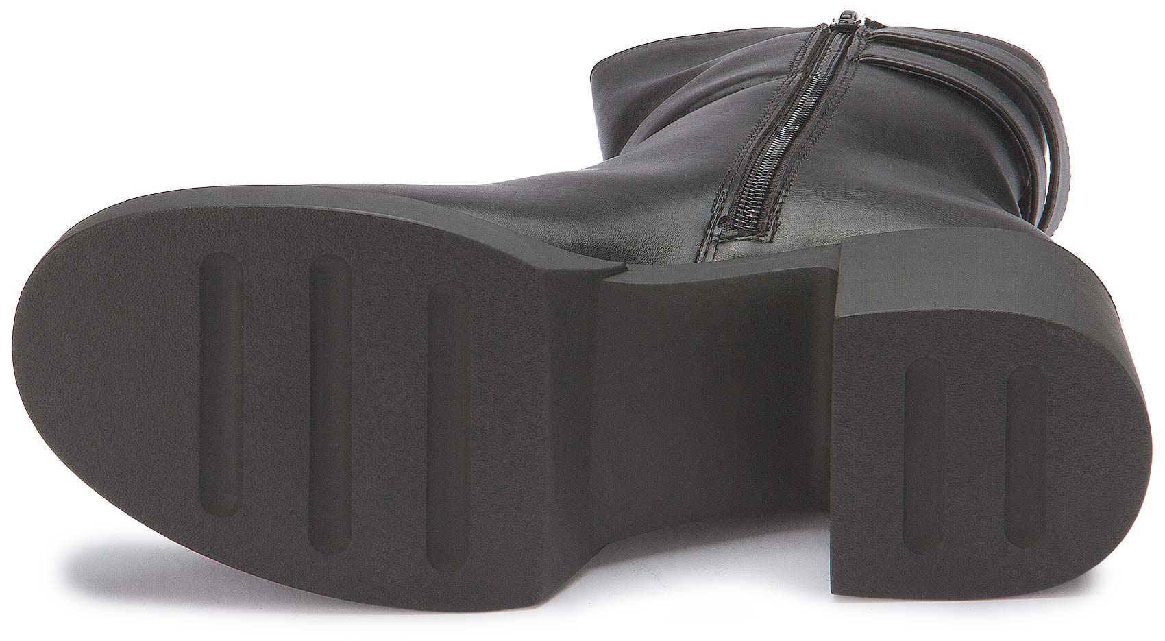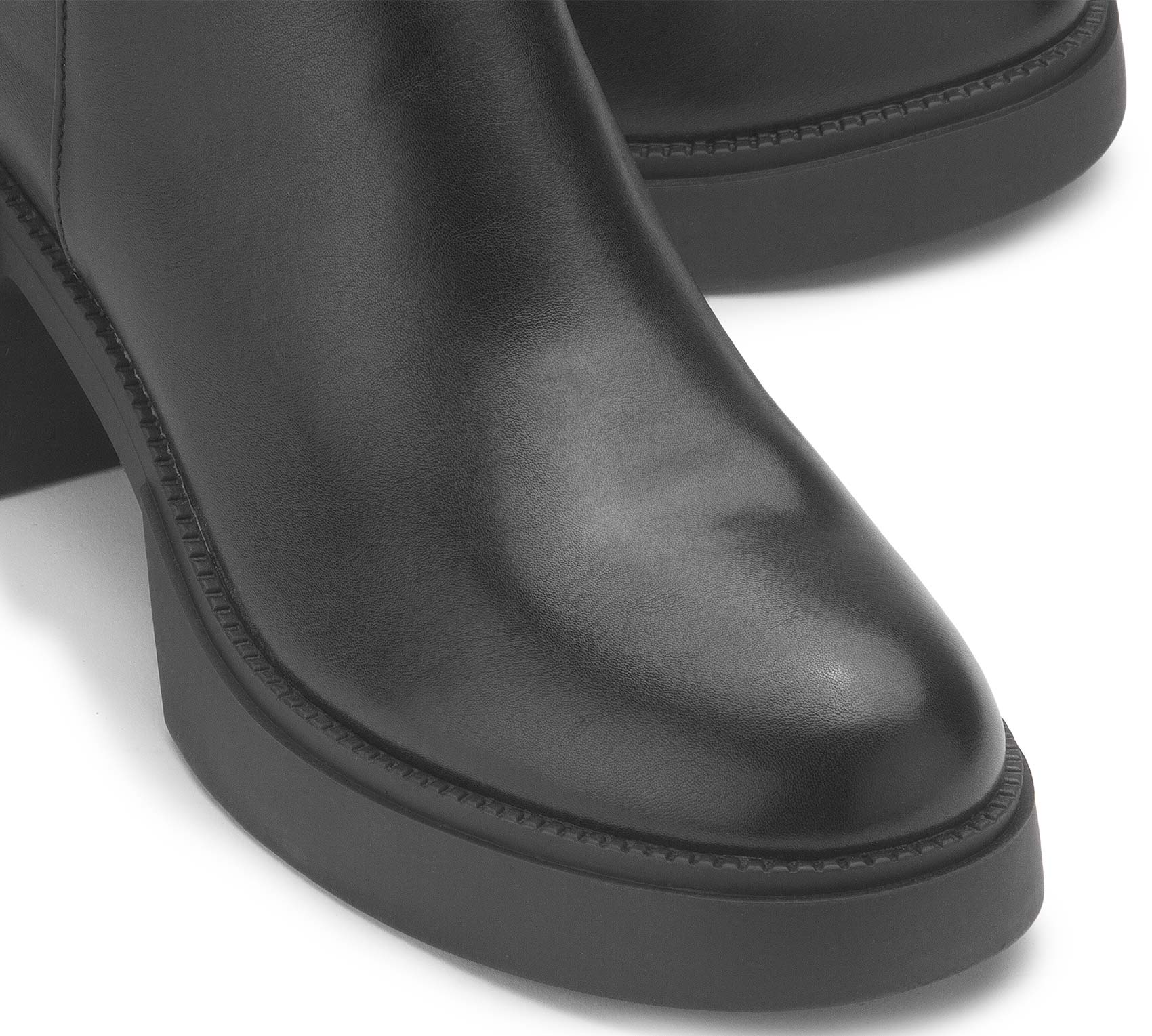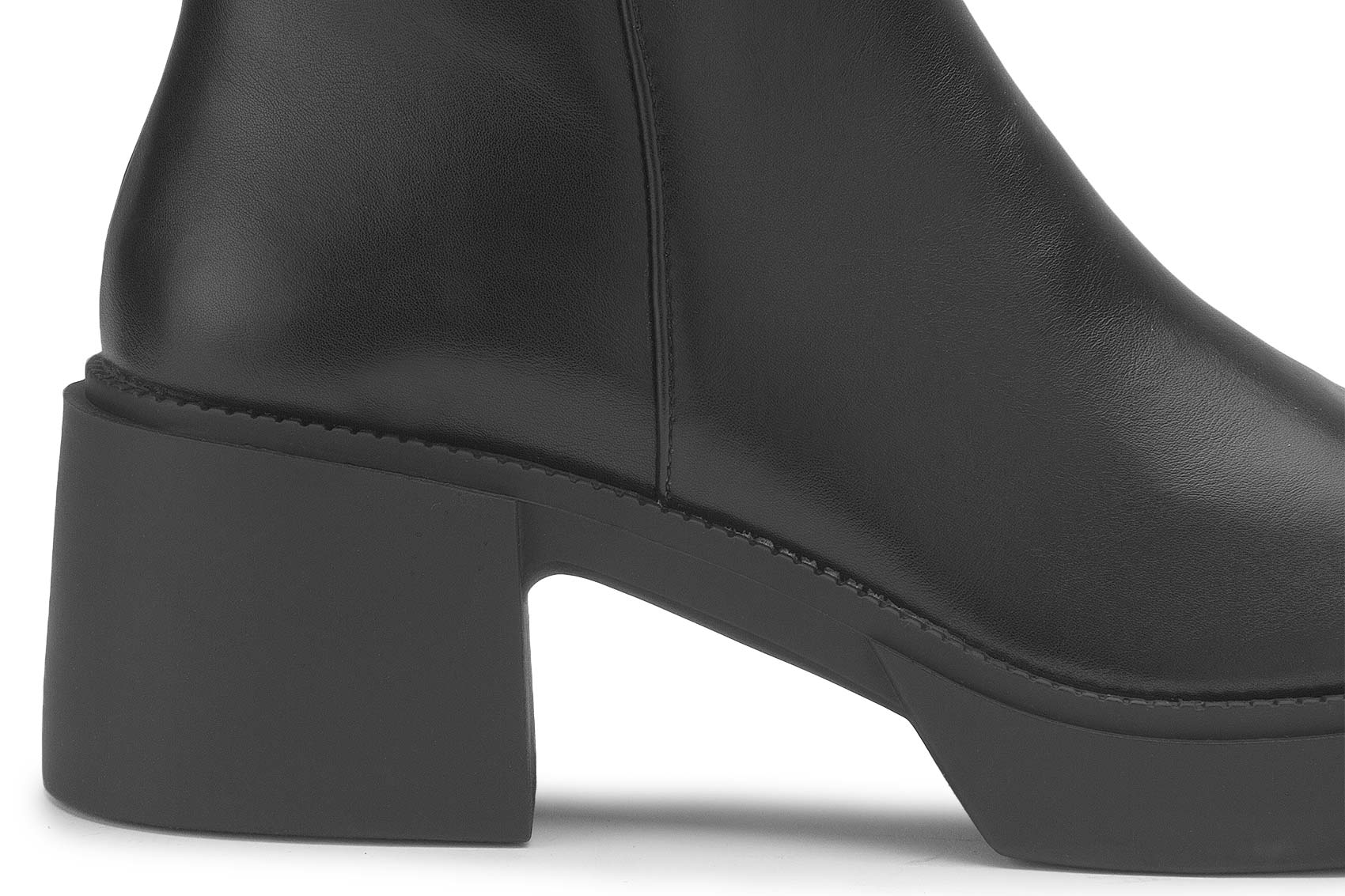 These trendy ankle boots set stylish accents with their striking block heel and decorative double straps. The smooth black upper material creates a modern, sophisticated look, while the sturdy sole and side zipper offer a high level of comfort. A fashion statement for confident appearances.