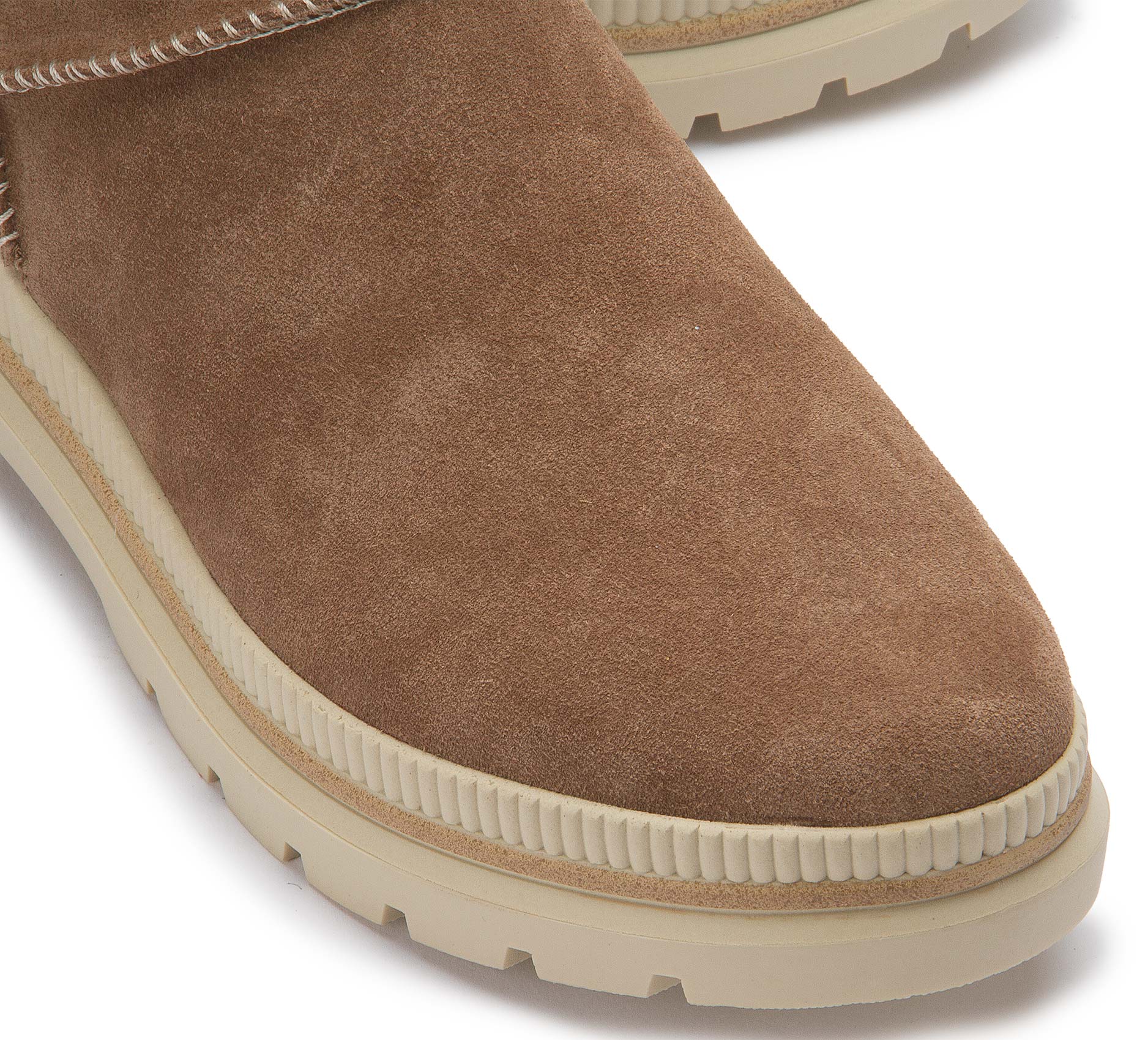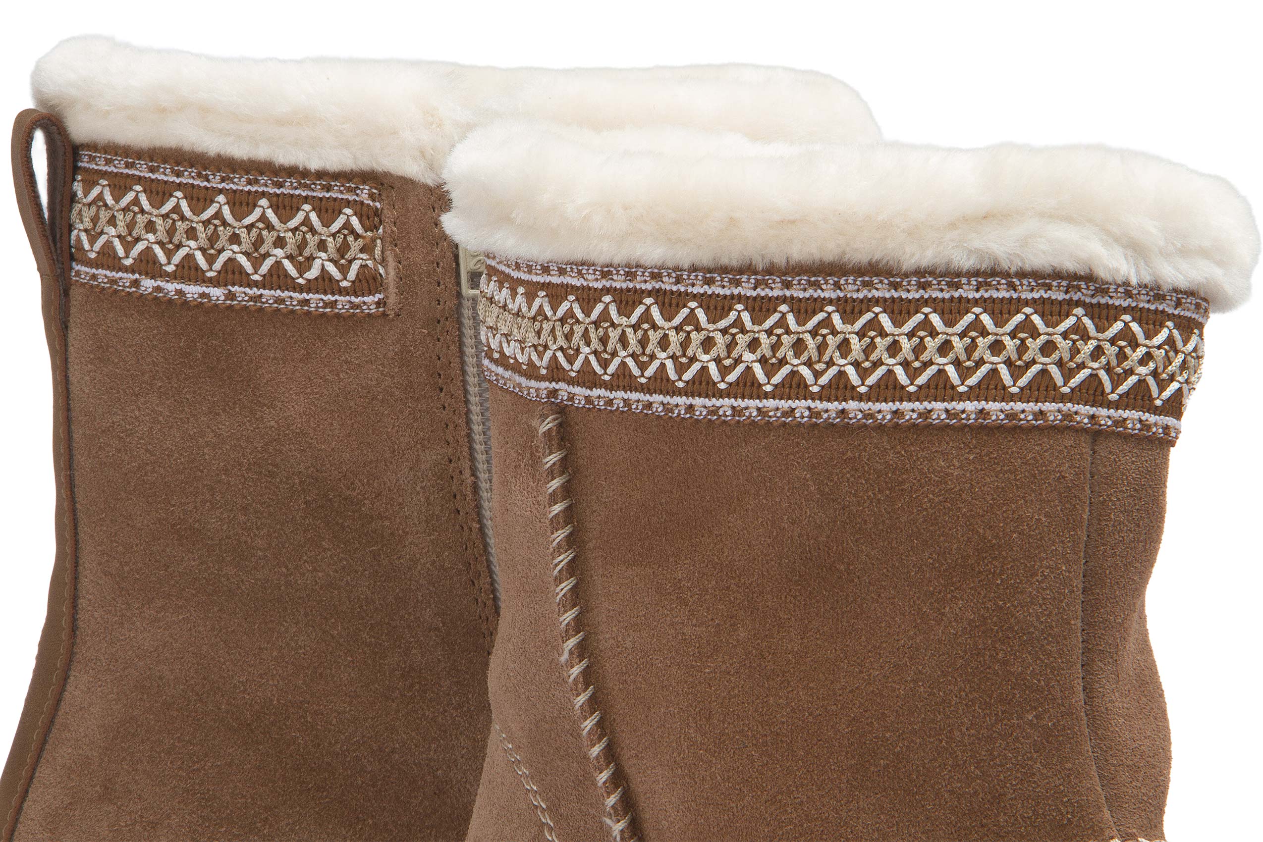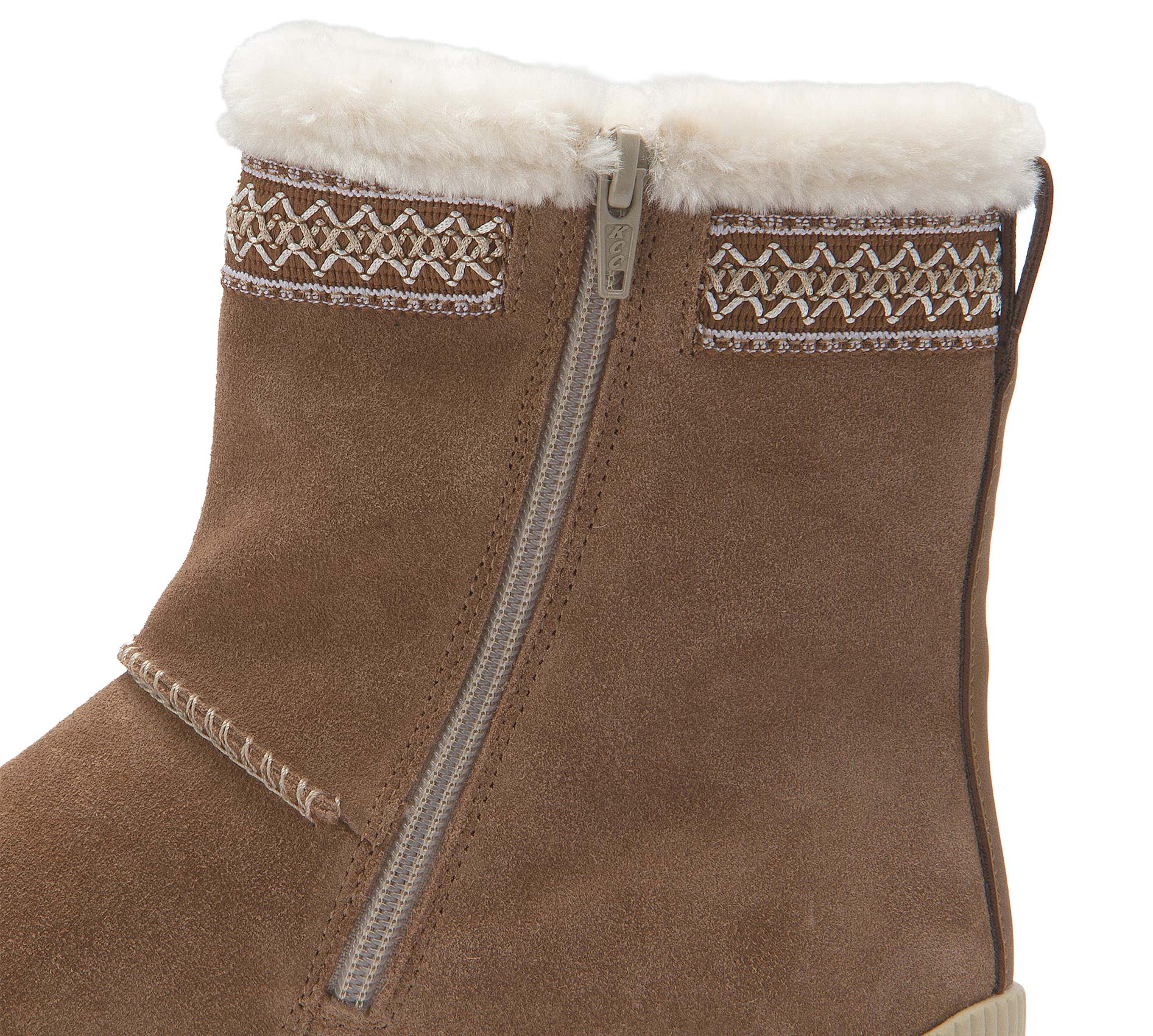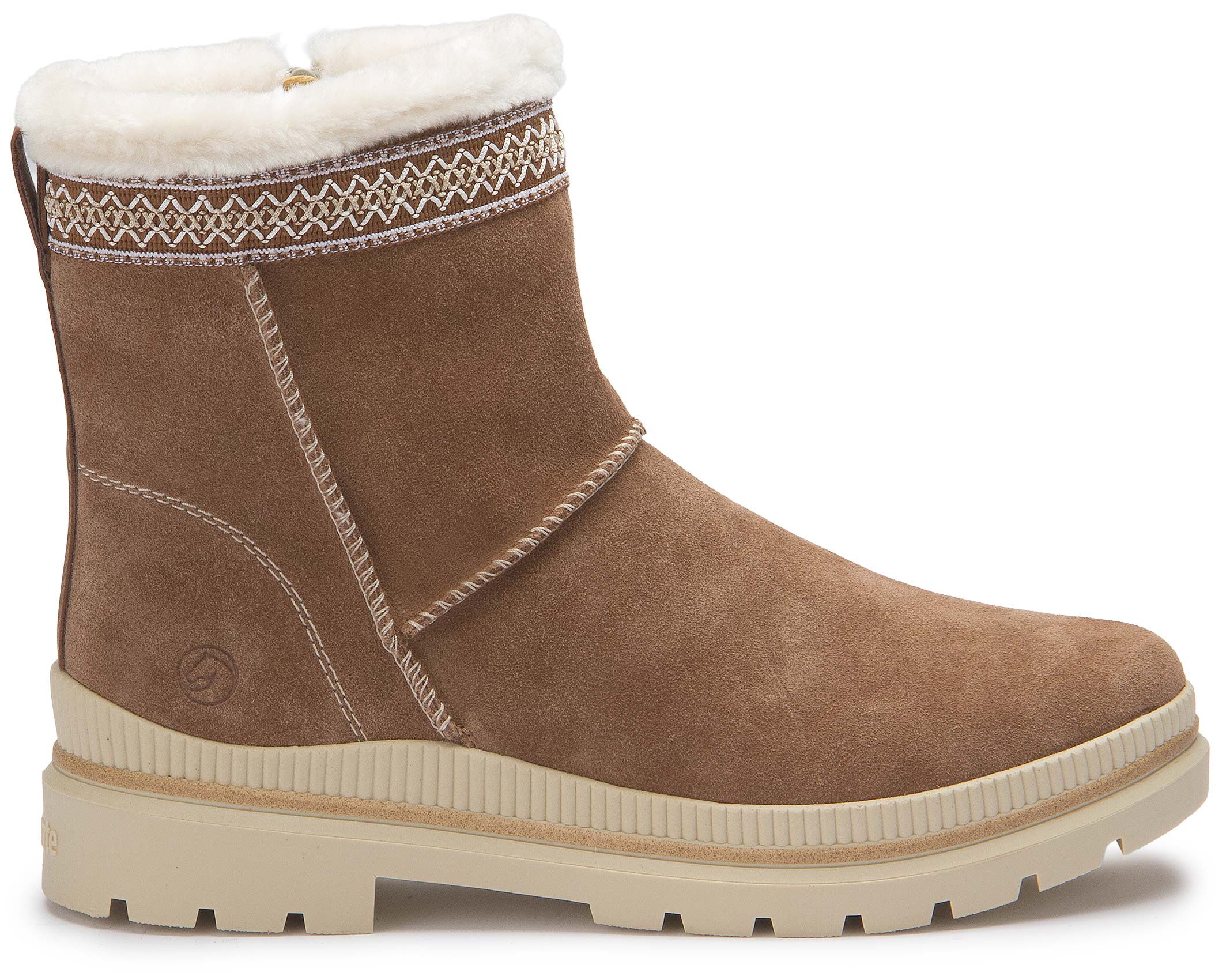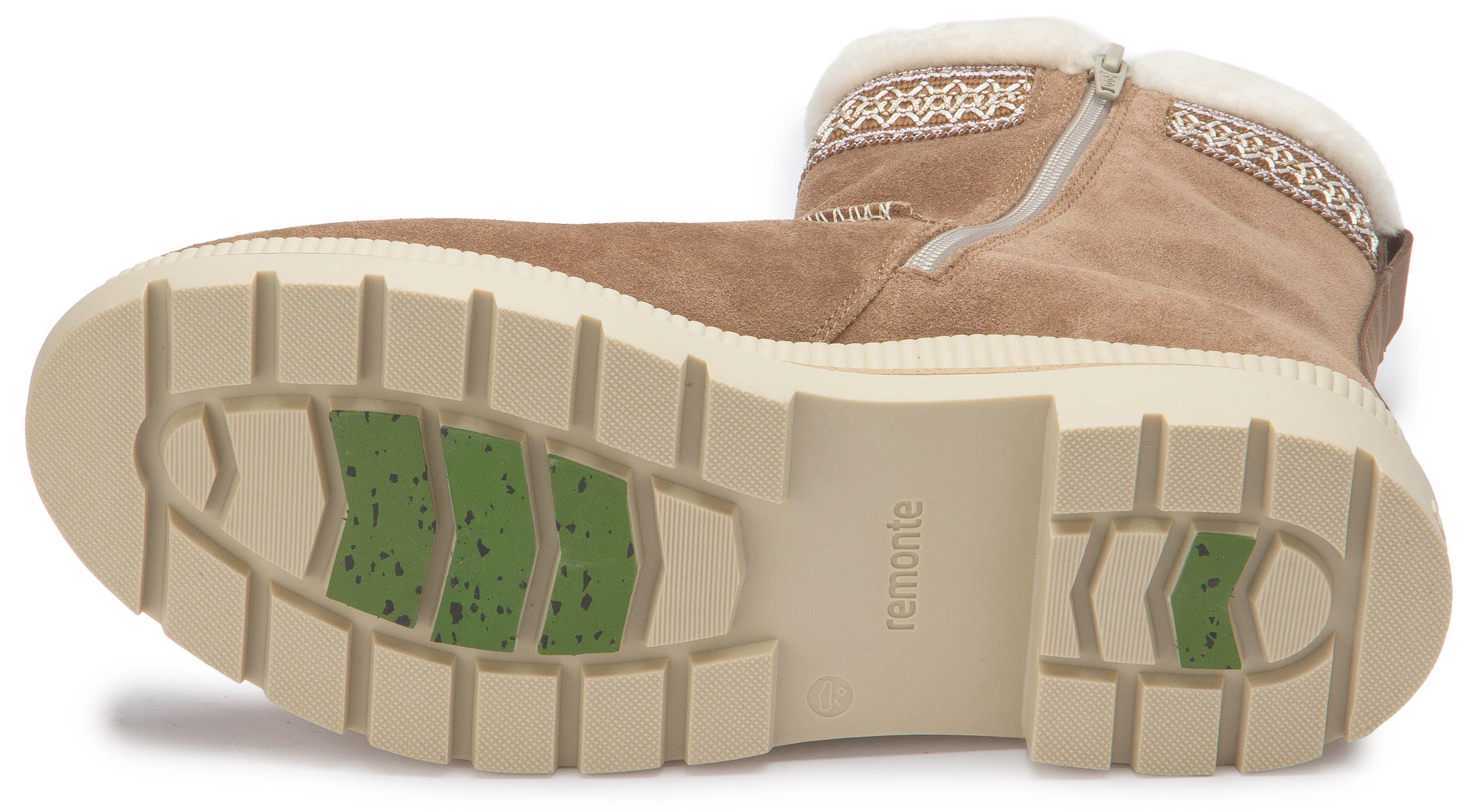 The cold days are getting hot! These brown remonte short boots for women made of suede are not only ultra stylish, they also score points with their comfort features. A zipper makes them easy and comfortable to put on. The shaft collar in a Norwegian pattern is a beautiful eye-catcher. The lightweight, non-slip sole ensures a good grip. The model is cut in a comfort width and provides the foot with enough space. Fiberglass elements incorporated into the outsole provide extra safety on icy floors, while the insole with thermal effect ensures good protection against the cold. Jackpot!