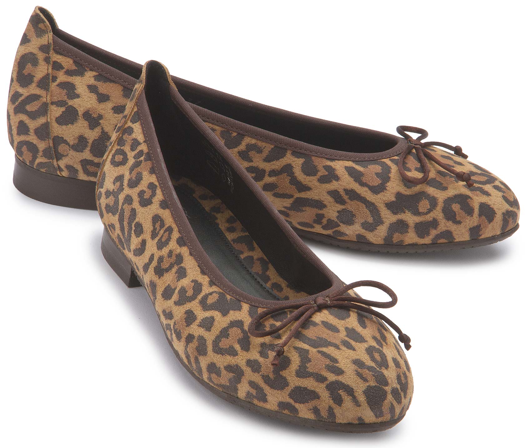 These ballerinas will take you to your destination in style. This feminine model features an elegant leopard print and a decorative brown bow that gives the shoe a special touch. Thanks to the comfortable fit and flexible rubber sole, they are extremely comfortable to wear - a perfect pair to add to your wardrobe.