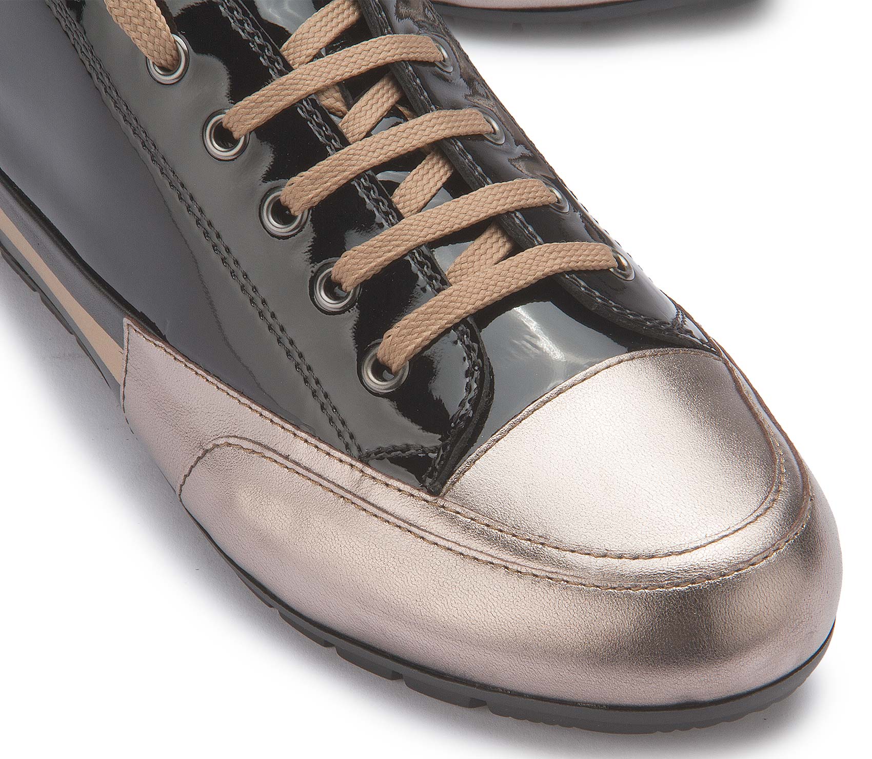 Low-top sneakers with lines inspired by the basketball models of the 90s. The patent leather upper is complemented by leather inserts on the toe and heel as well as the welt with visible topstitching and the laminated underside. The removable insole and thin rubber sole round off the design.