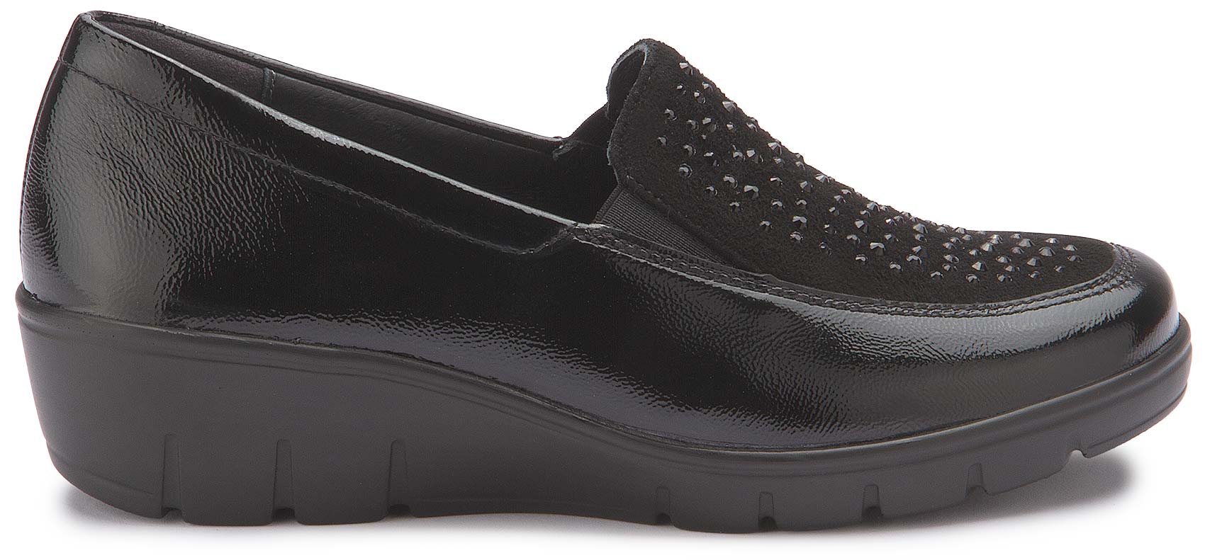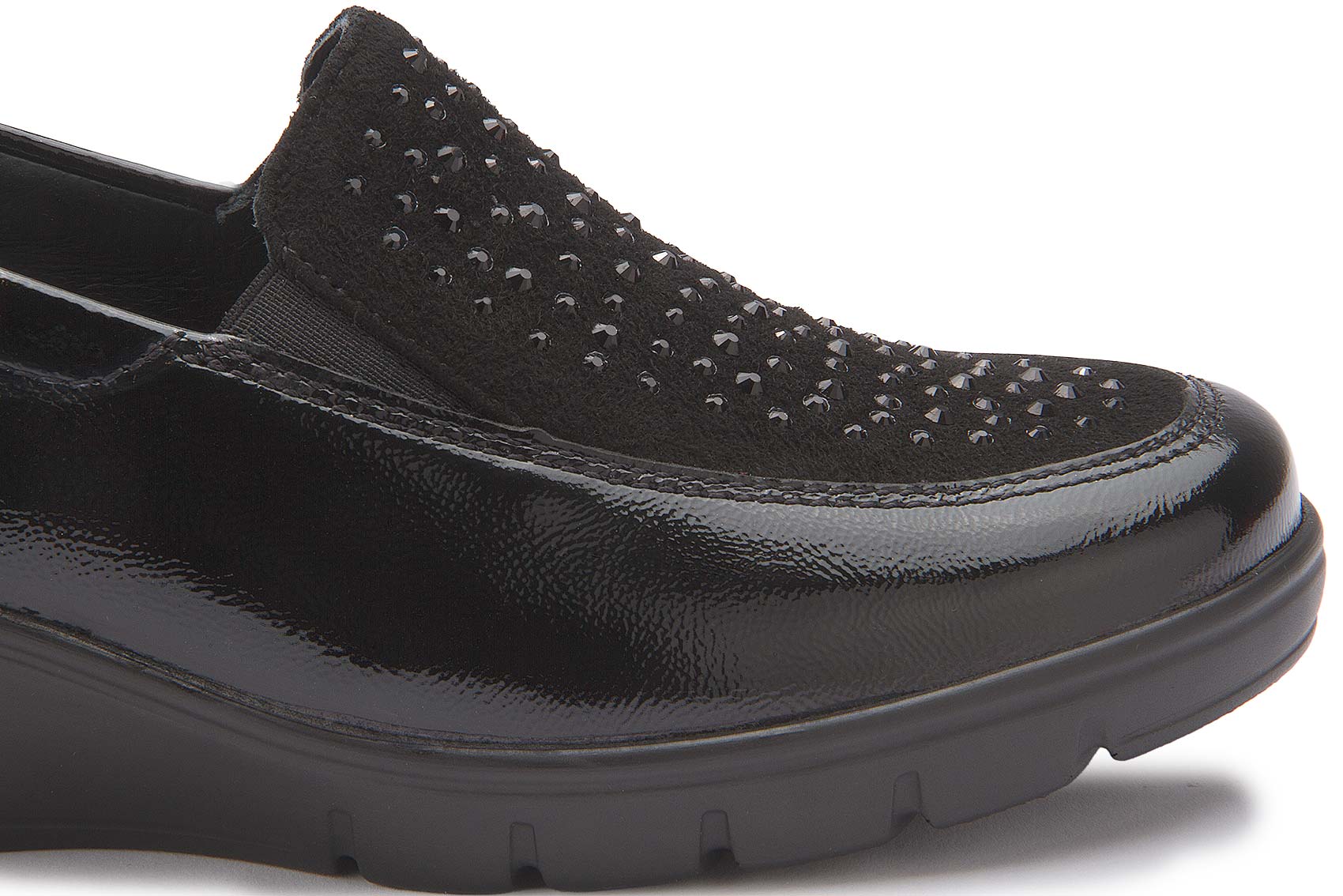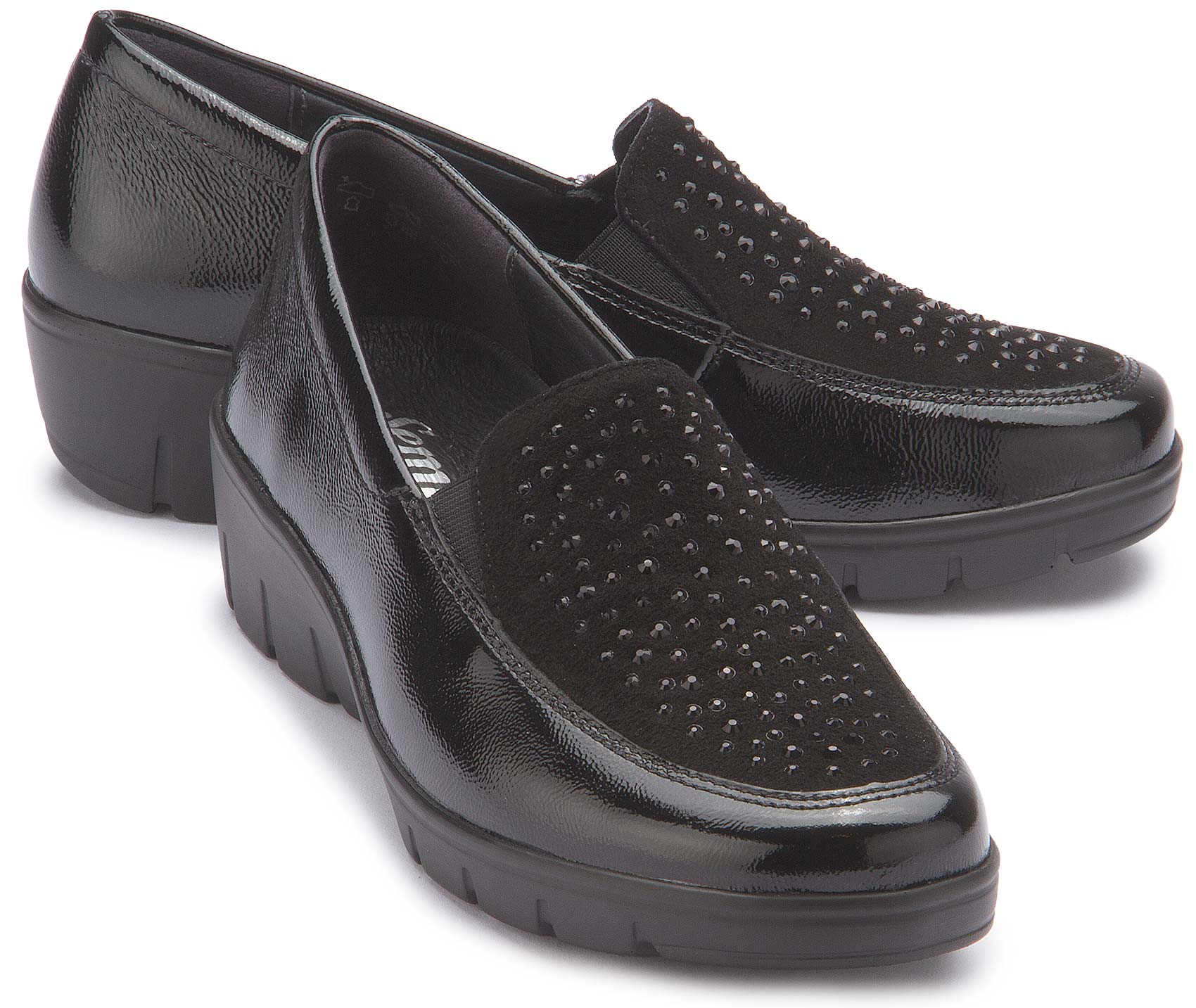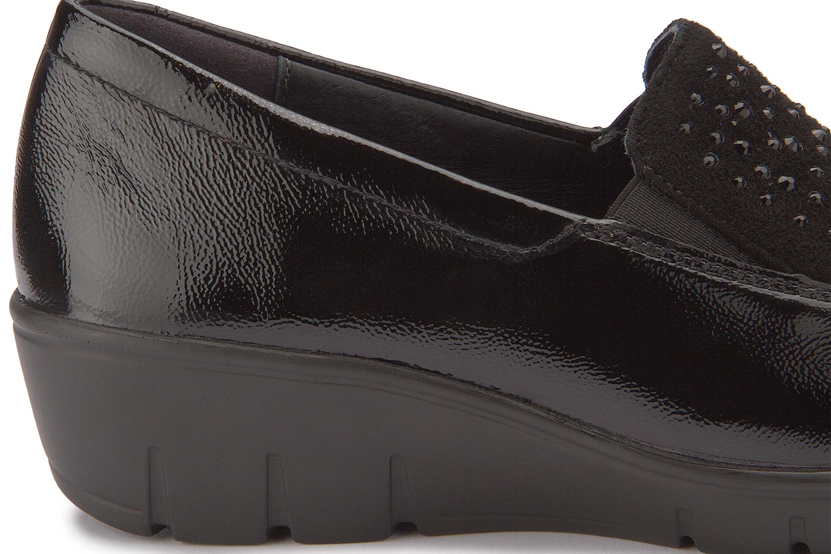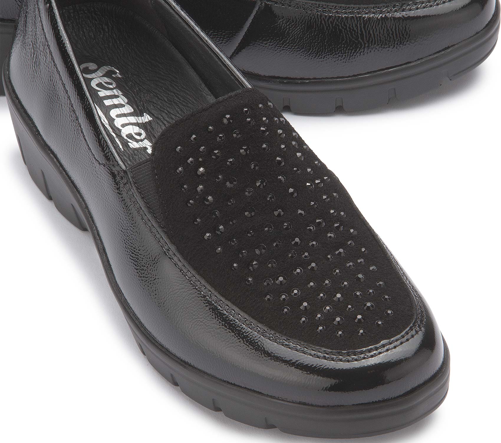 Eleganter Komfort trifft auf stilvolle Details: Dieser Slipper von Semler überzeugt mit hochwertigem, glänzendem Leder und funkelnden Applikationen auf dem Vorderblatt. Die flexible Laufsohle und die bequeme Passform sorgen für ein angenehmes Tragegefühl – ideal für den Alltag und besondere Anlässe. Ein zeitloser Schuh, der Komfort und modisches Design perfekt vereint.