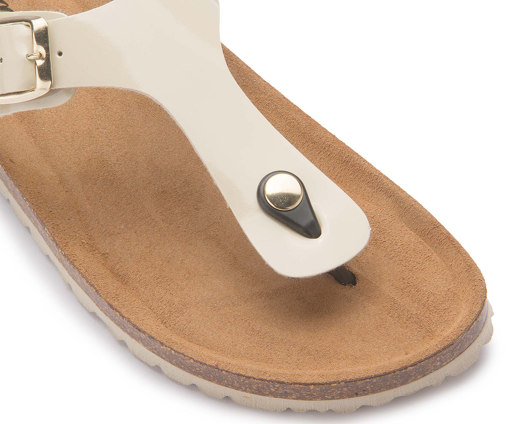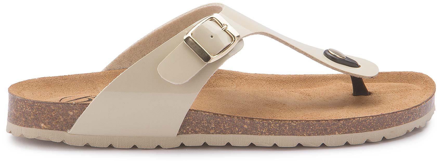 Der schlichte Zehentrenner von Bariello in dezentem Beige überzeugt mit einem hochwertigen Lederriemen und komfortabler Korksohle. Die ergonomisch geformte Fußbettung sowie der verstellbare Riemen mit goldfarbener Schnalle sorgen für optimalen Halt und angenehmen Tragekomfort. Ideal für warme Tage – stilvoll und bequem zugleich.