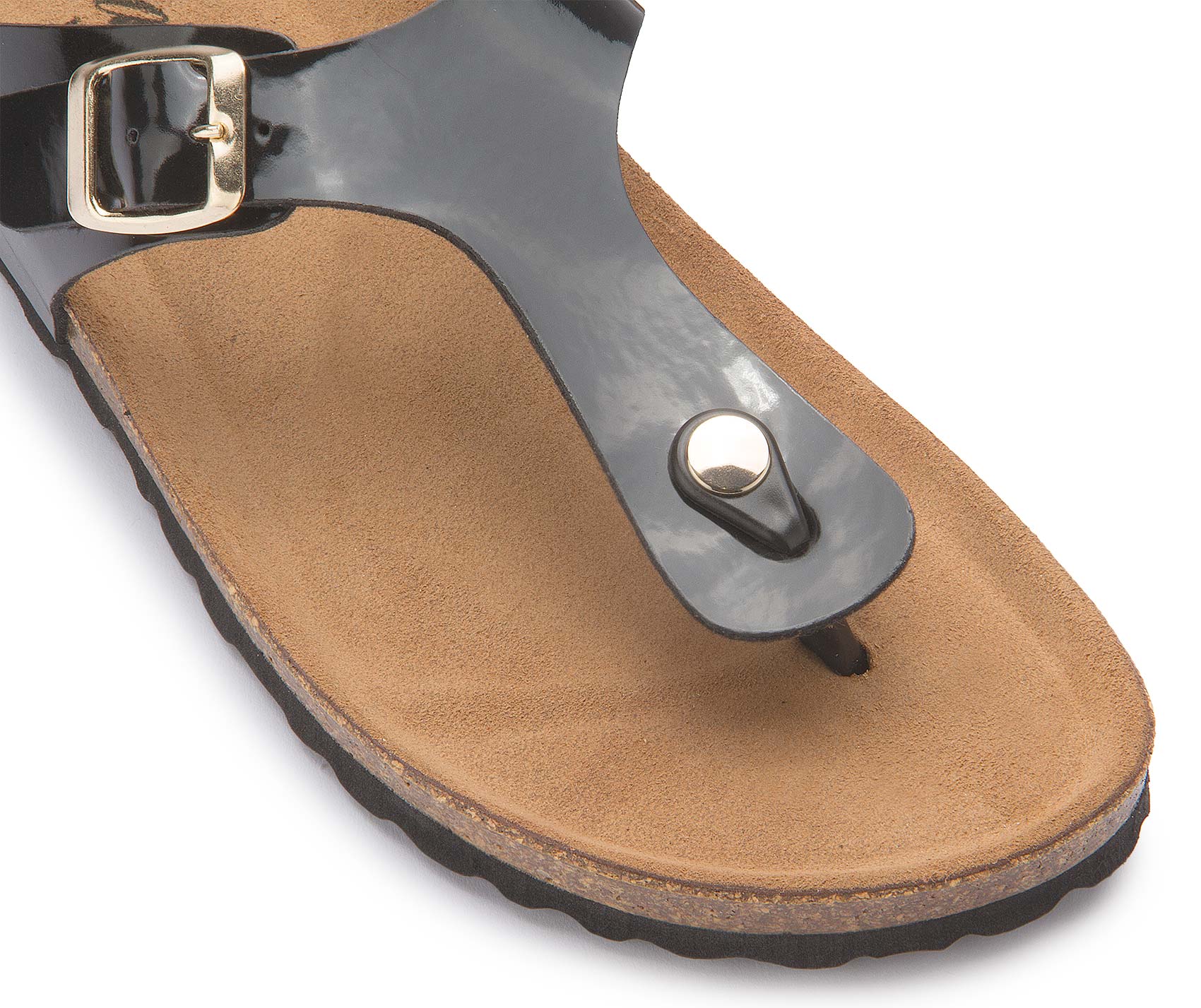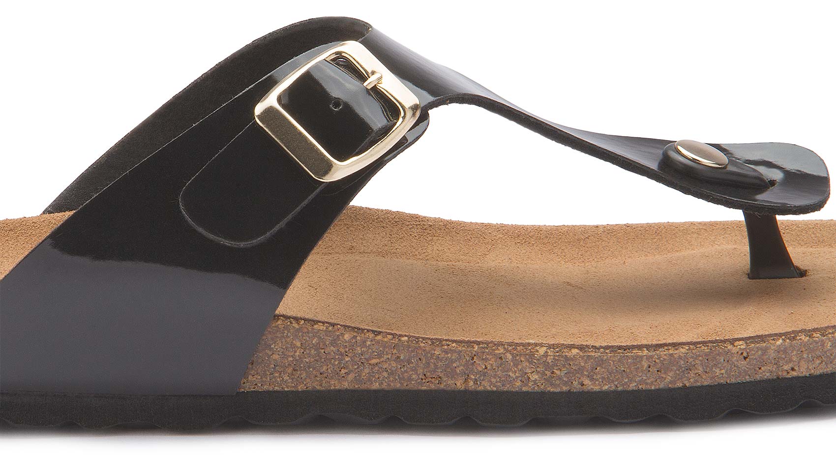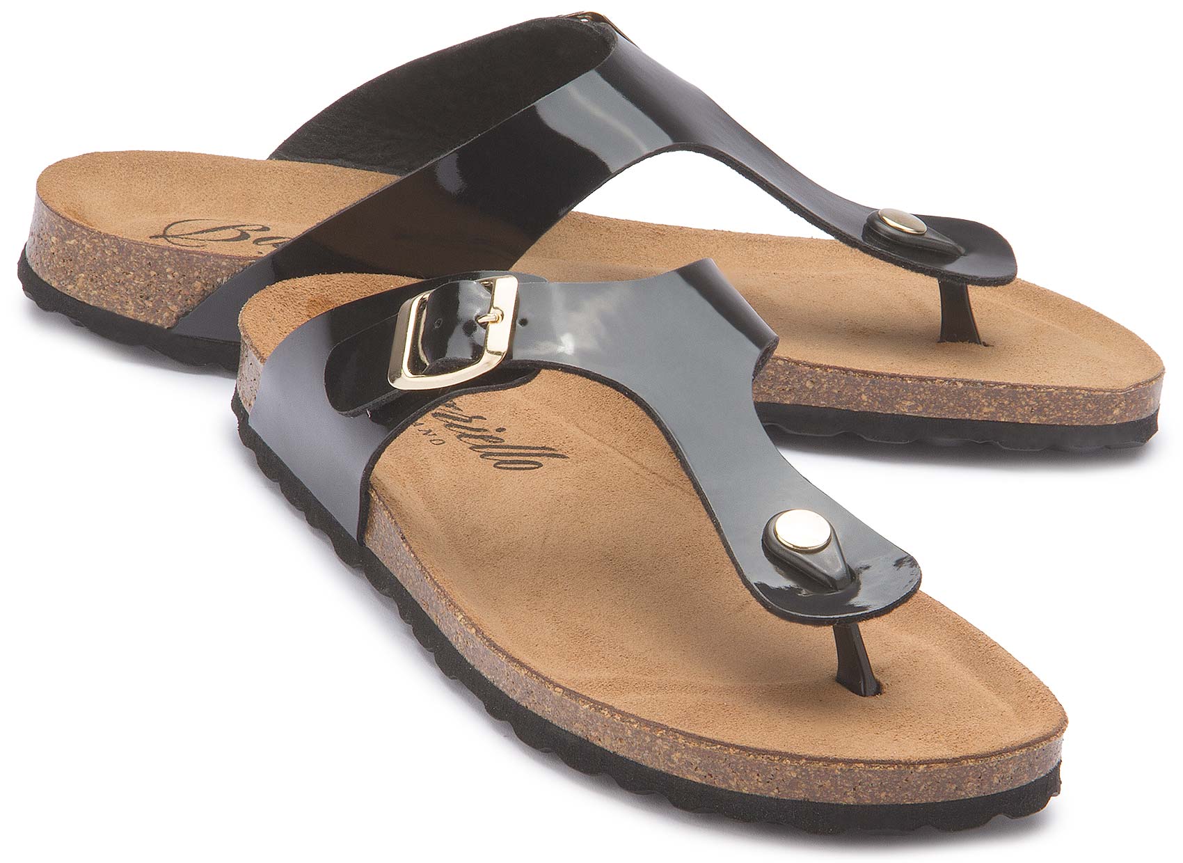 Der schlichte Zehentrenner von Bariello in elegantem Schwarz überzeugt mit einem hochwertigen Lederriemen und komfortabler Korksohle. Die ergonomisch geformte Fußbettung sowie der verstellbare Riemen mit goldfarbener Schnalle sorgen für optimalen Halt und angenehmen Tragekomfort. Ideal für warme Tage – stilvoll und bequem zugleich.