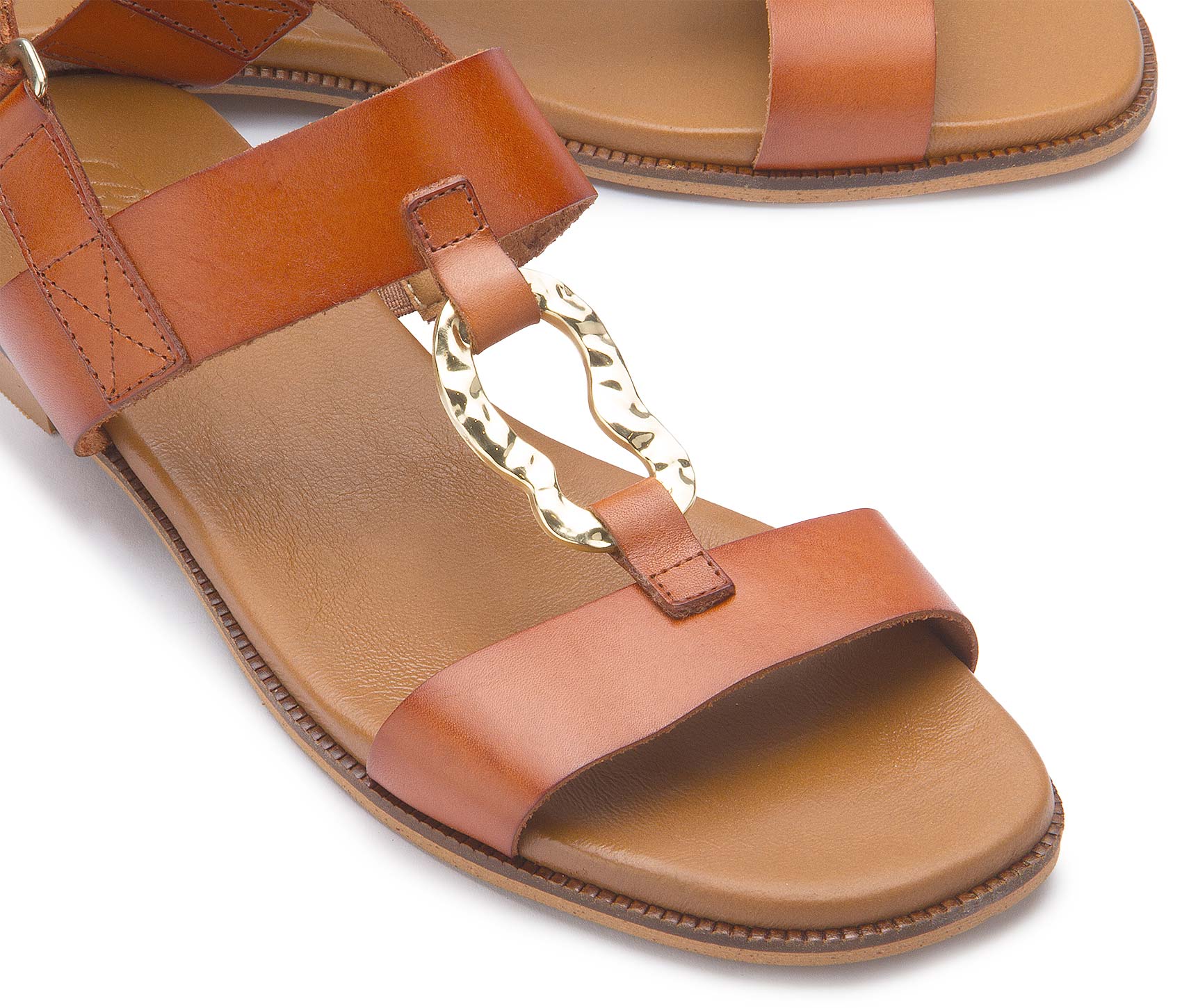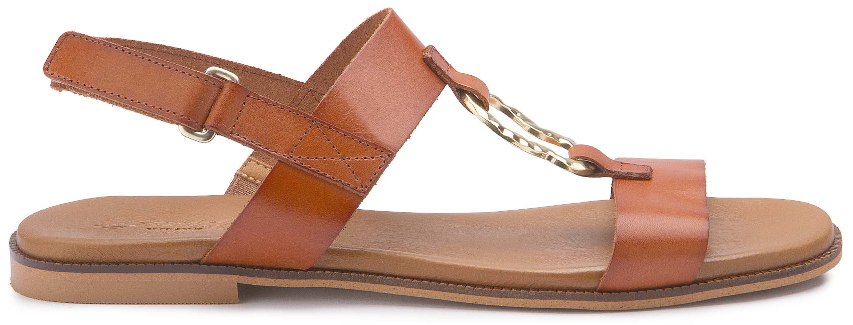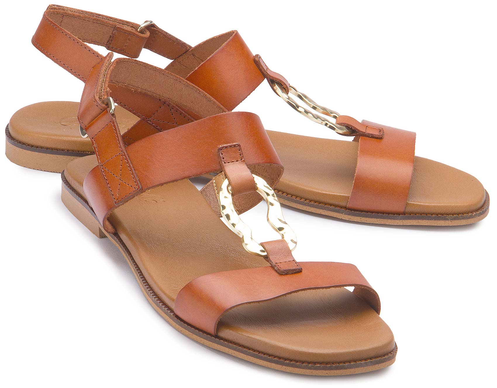Diese Sandale überzeugt durch hochwertiges Leder und ein dekoratives Metallelement, das dem Design eine edle Note verleiht. Die verstellbaren Riemen sorgen für einen sicheren Sitz und individuellen Komfort. Die flache Sohle macht sie zum idealen Begleiter für warme Tage und stilvolle Sommerlooks.