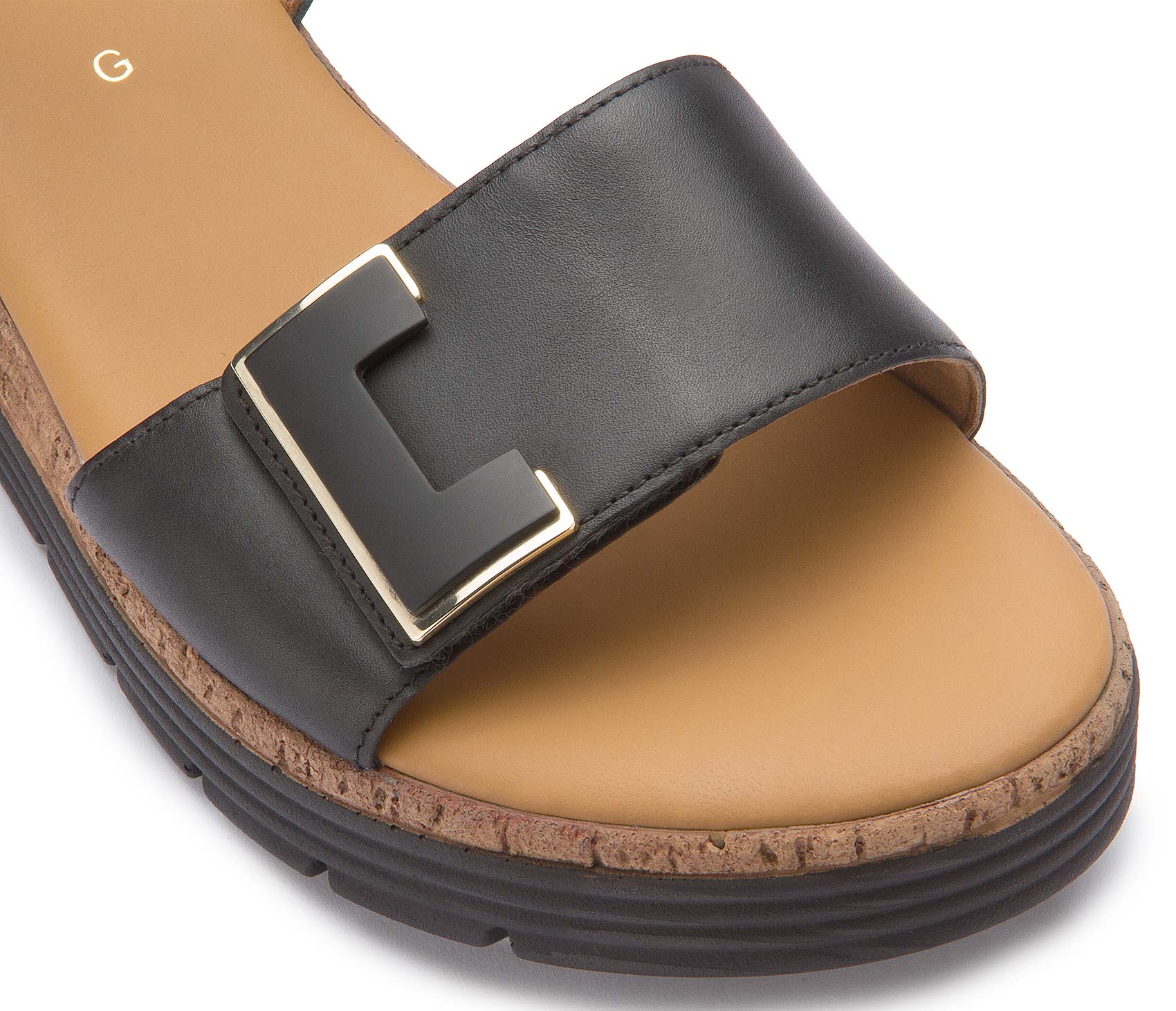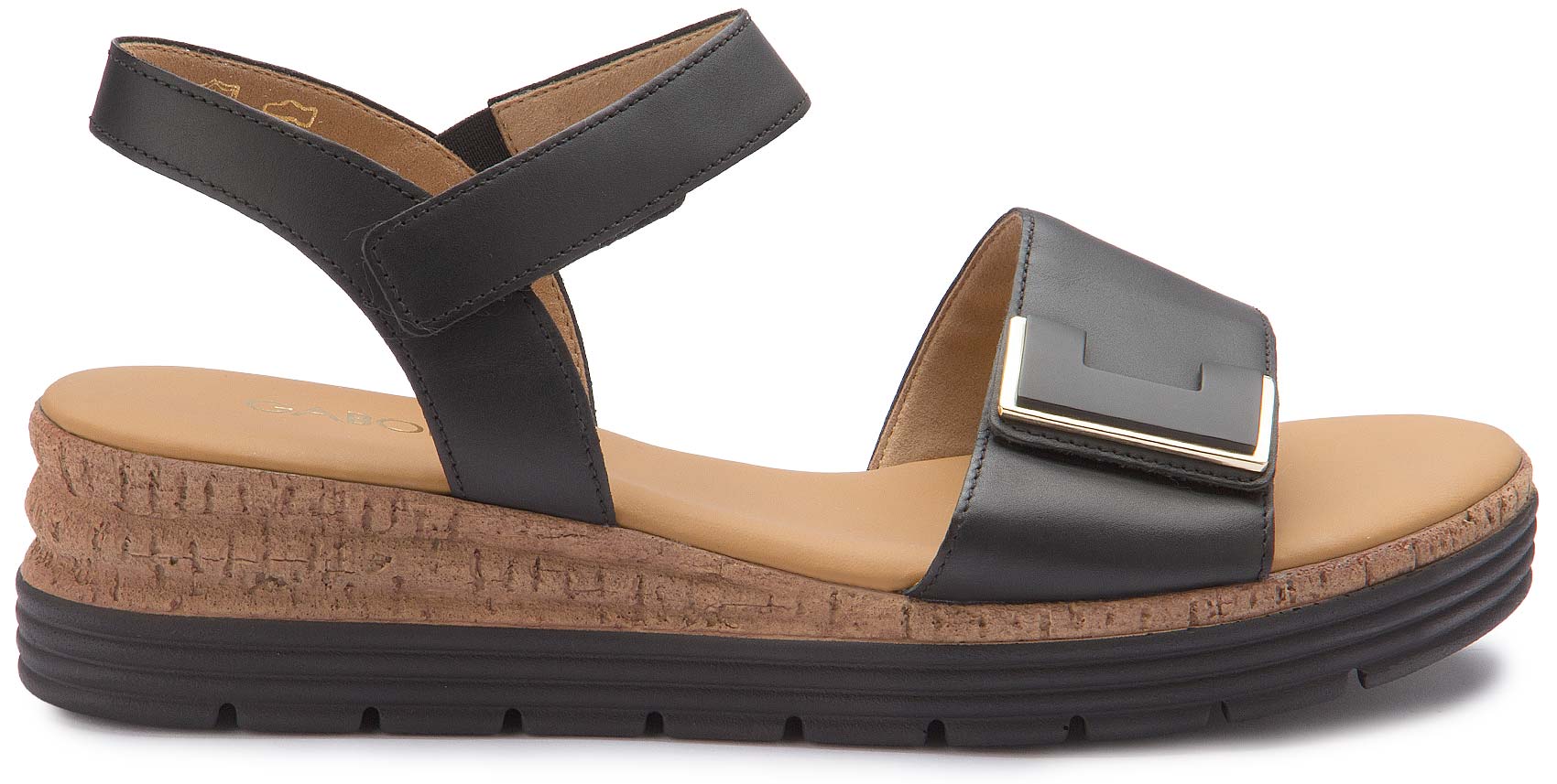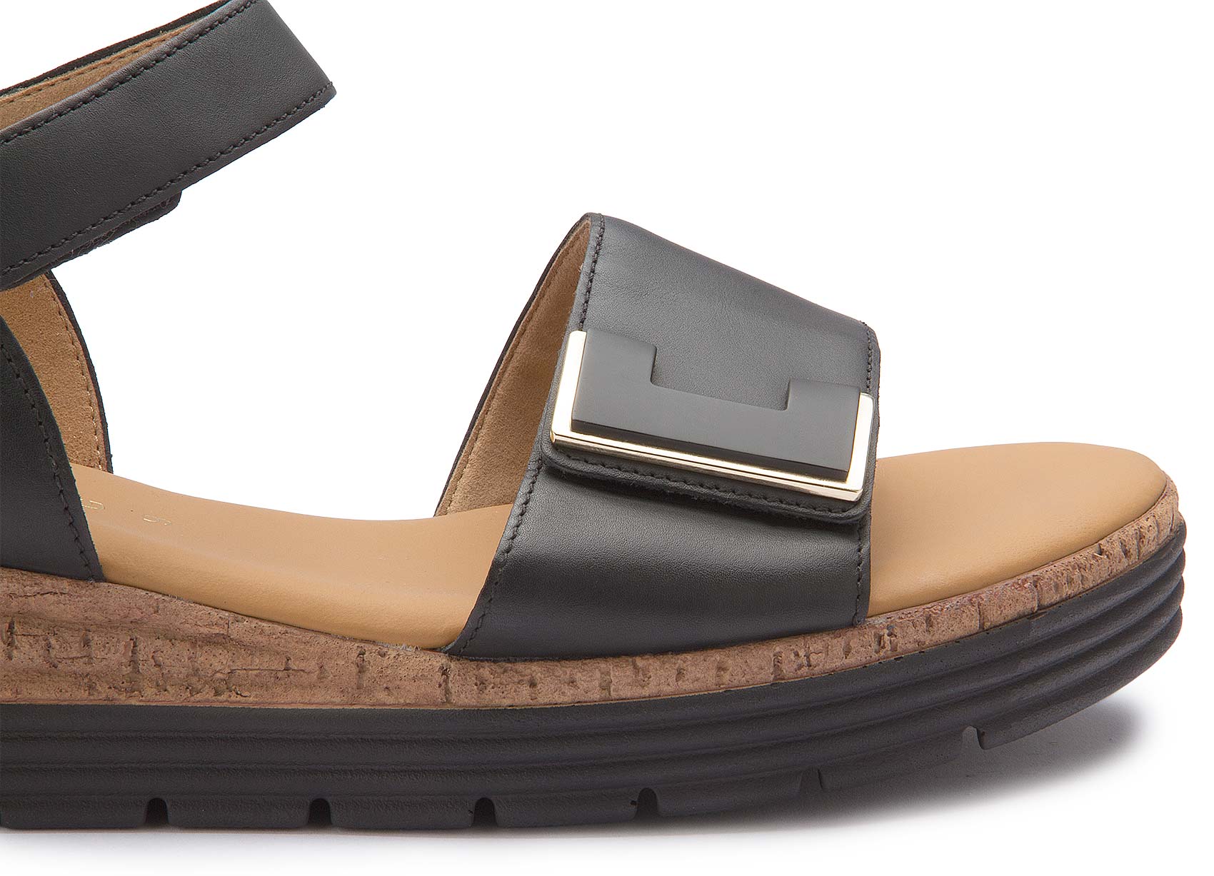 Diese Sandale von Gabor kombiniert hochwertiges Leder mit einem markanten Schmuckelement als stilvollem Highlight. Die verstellbaren Riemen sorgen für optimalen Halt und angenehmen Tragekomfort. Die leichte Plateausohle in Korkoptik rundet das Design ab und macht den Schuh zum idealen Begleiter für sommerliche Looks.