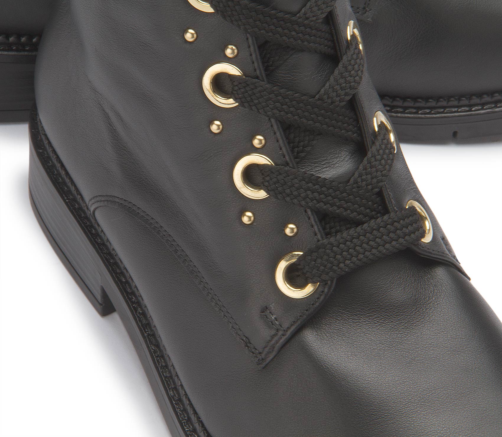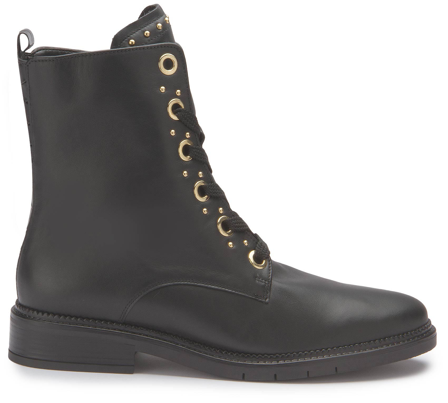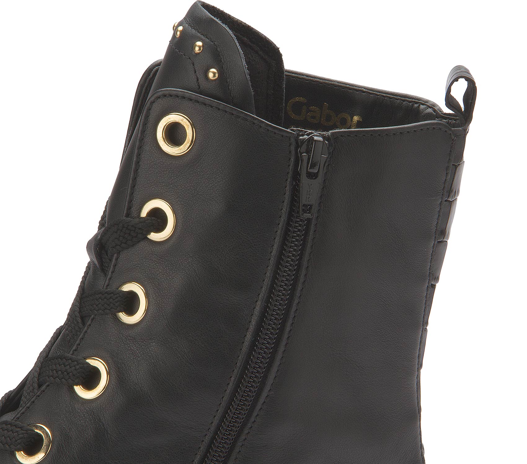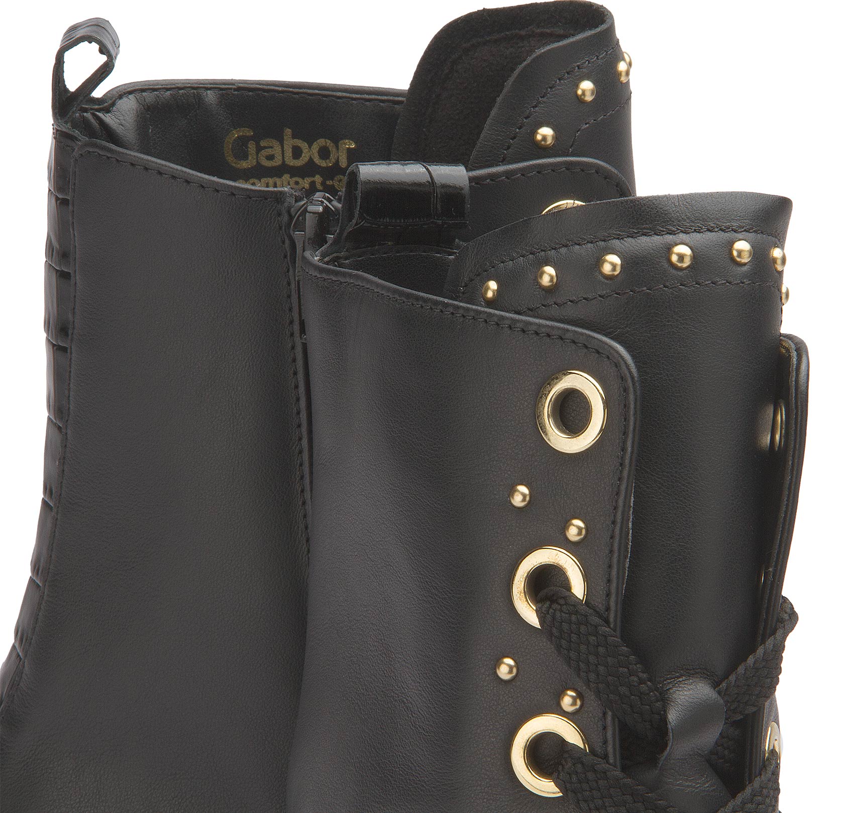 Gabor presents a lace-up boot in black leather with a fashionable look. The casual boot design with chic eyelets in gold is perfectly rounded off by the matching small studs all around. A real gem!