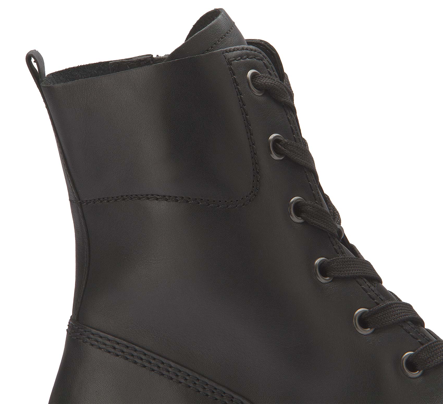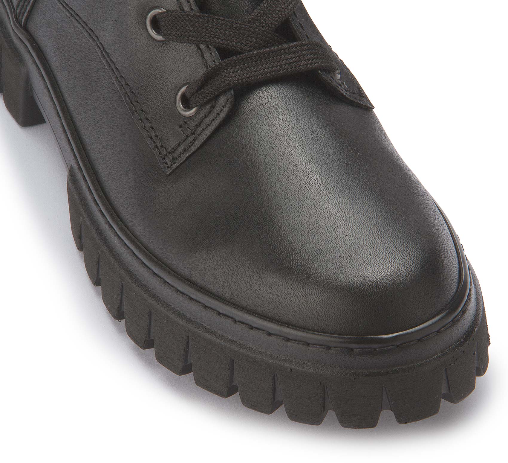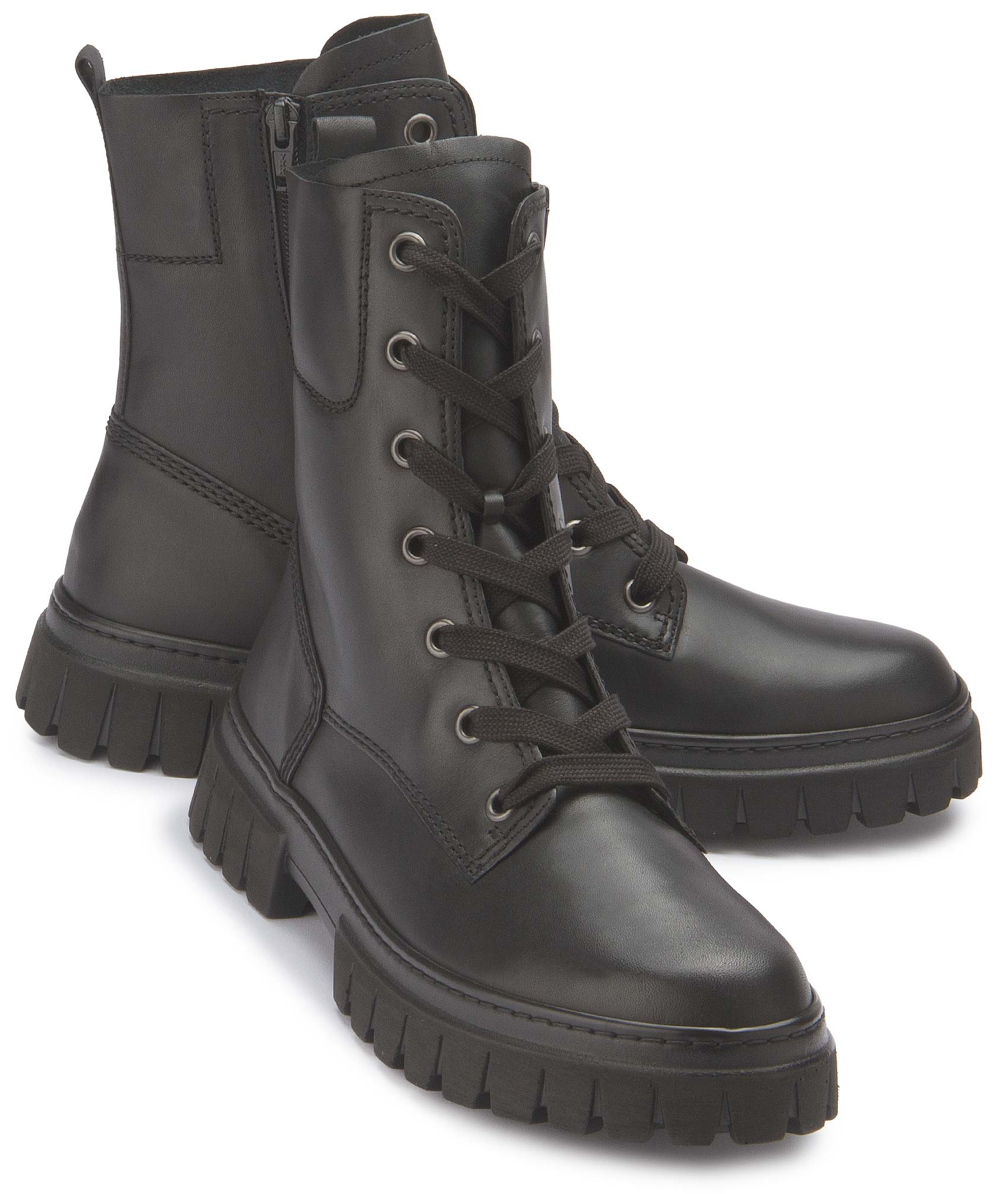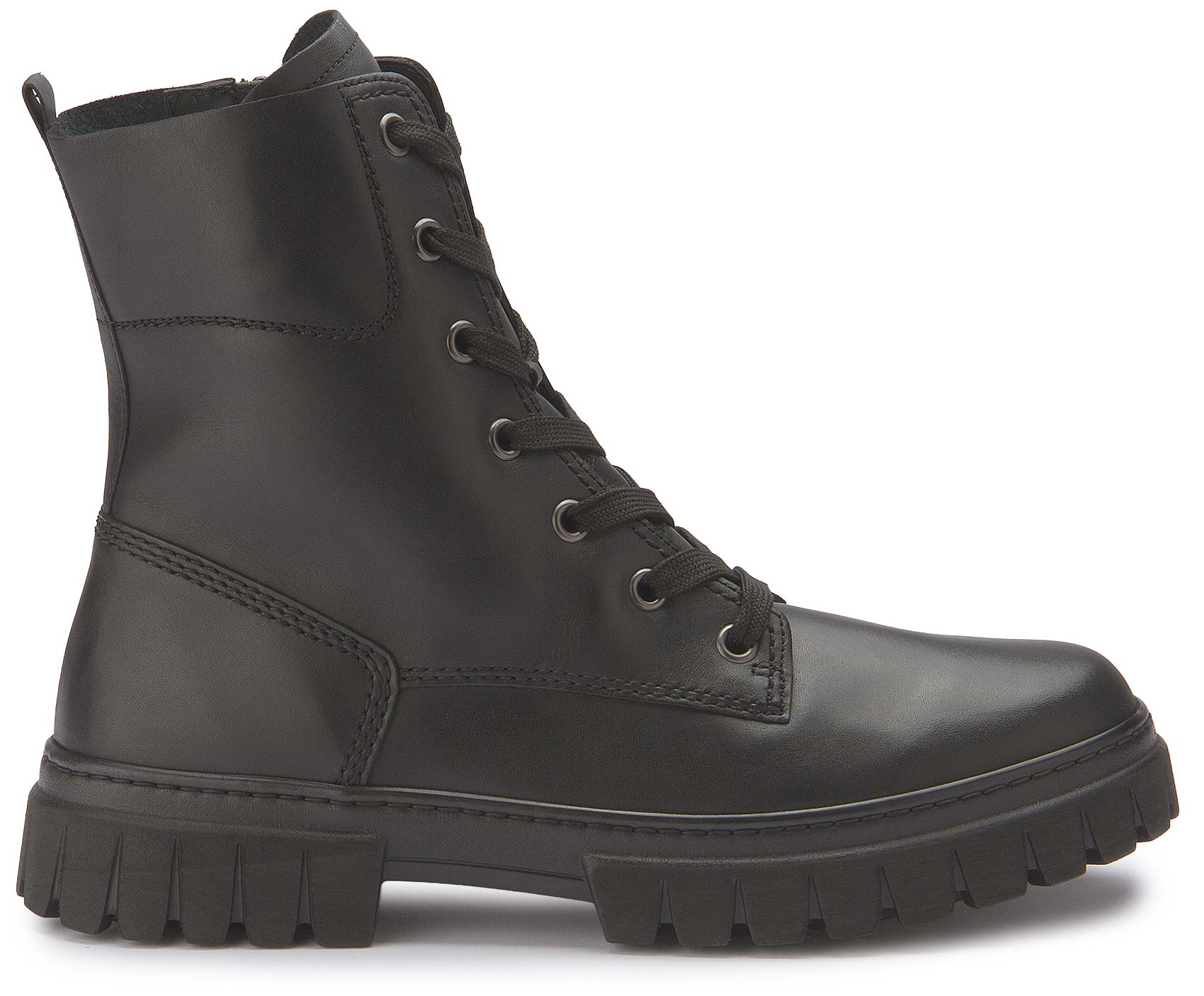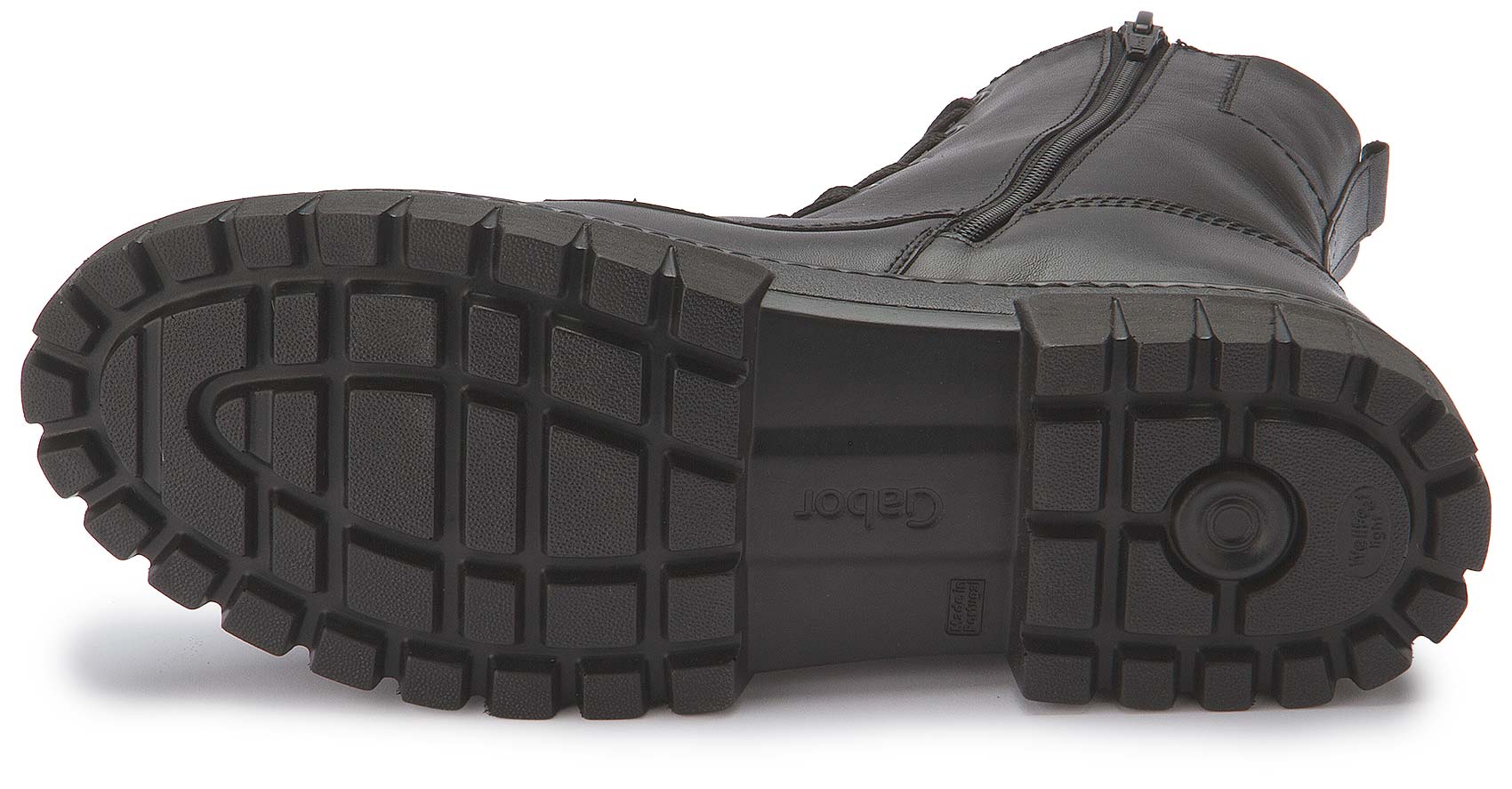 Gabor presents this elegant black lace-up boot made from smooth leather. The timeless design can be combined in a variety of ways. The laces and side zipper ensure an optimal fit and are easy to put on. Thanks to the comfortable G width, the lace-up boot is perfect for stylish everyday looks with extra comfort.