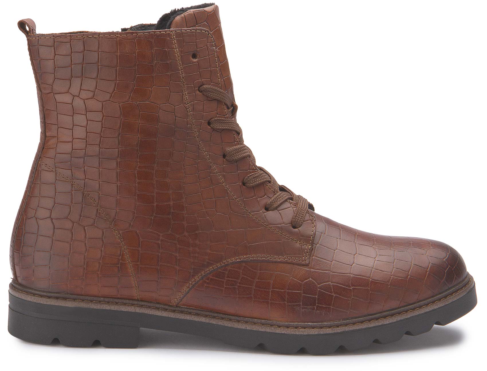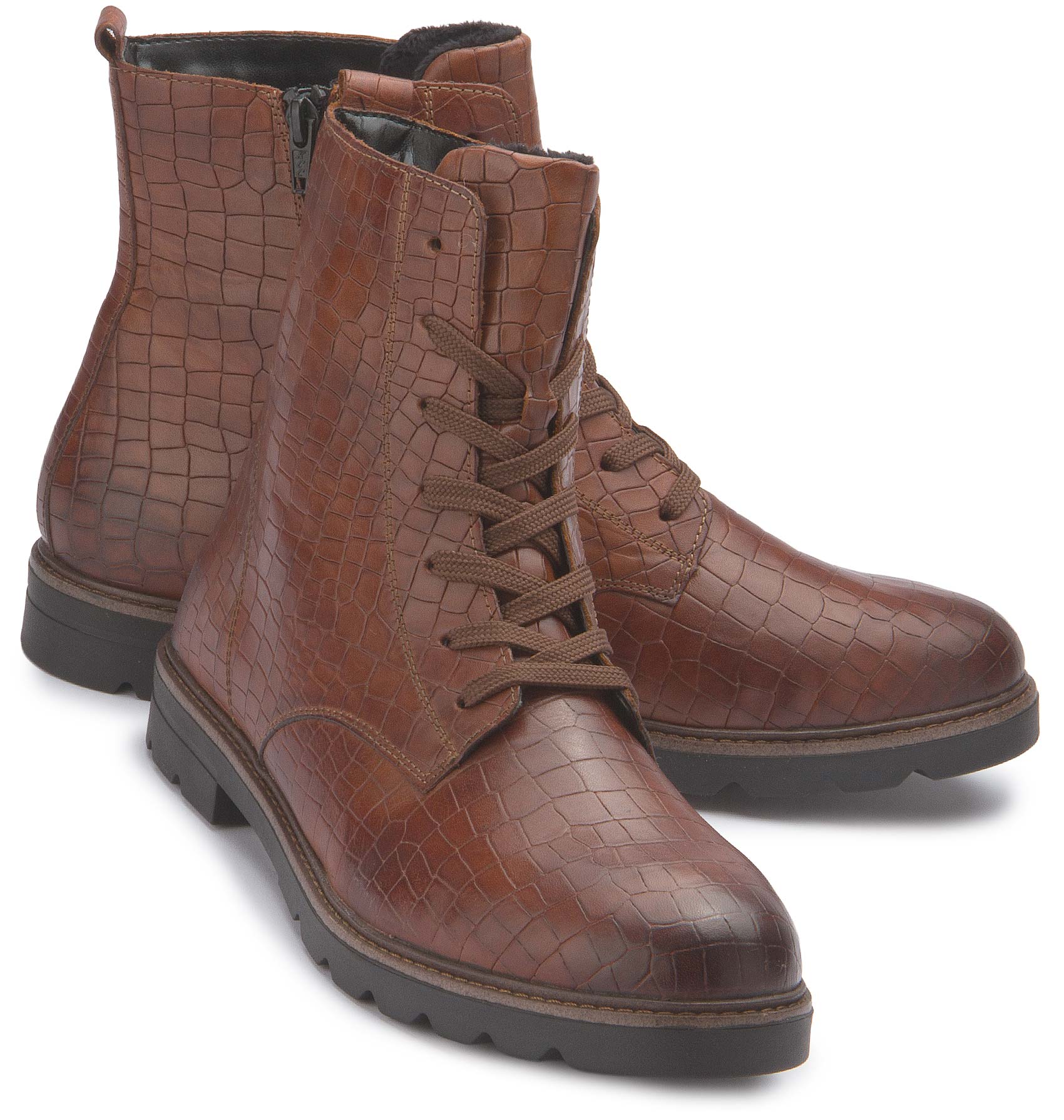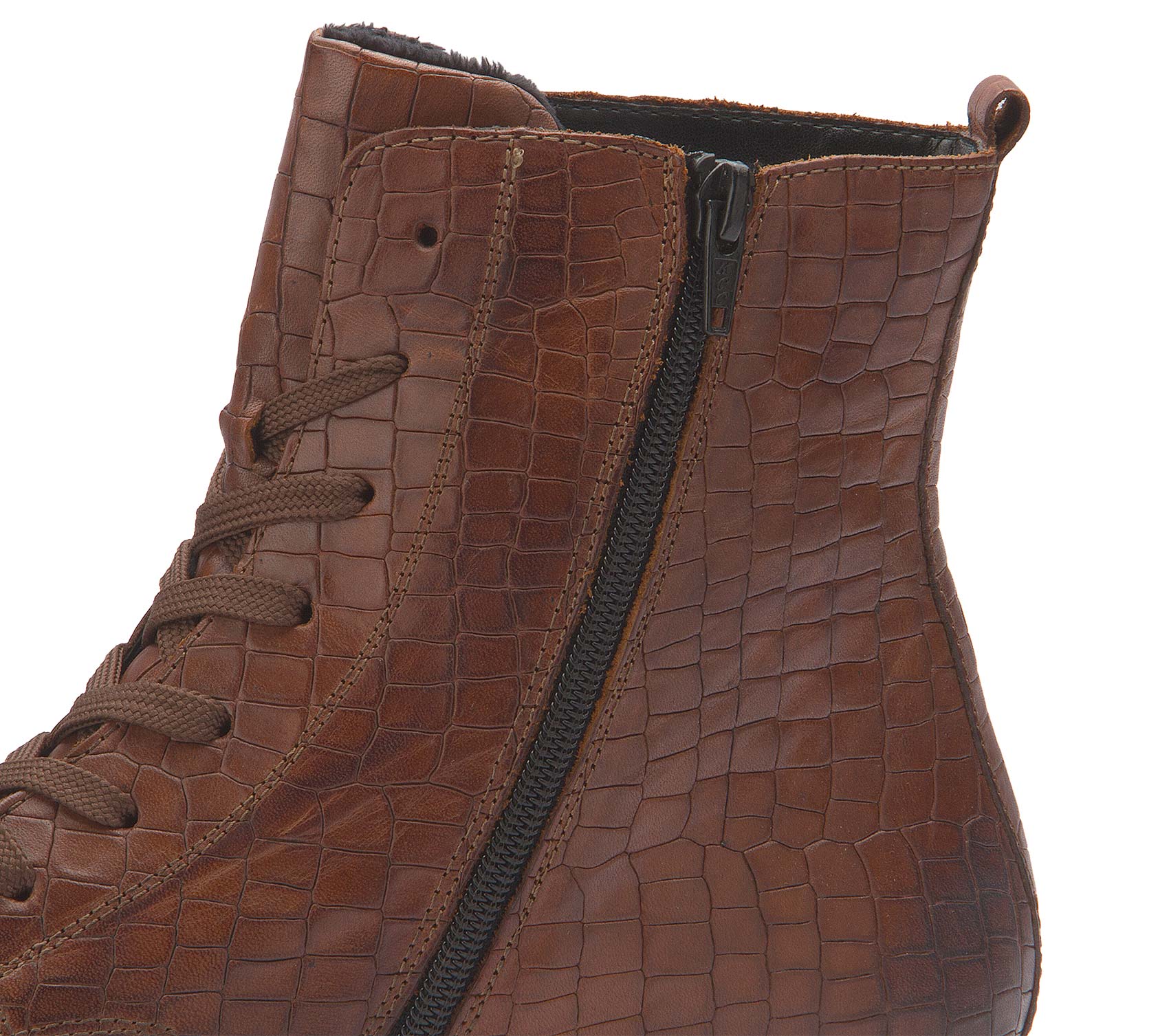 This fashionable lace-up boot impresses with its elegant crocodile embossing, which gives the warm brown shade a particularly high-quality and trendy look. The robust treaded sole ensures a firm grip, while the side zipper makes it easy to put on and take off. A stylish companion that adds a striking touch to any outfit.
