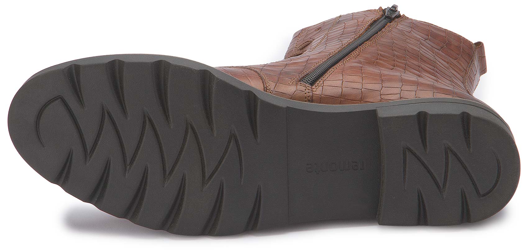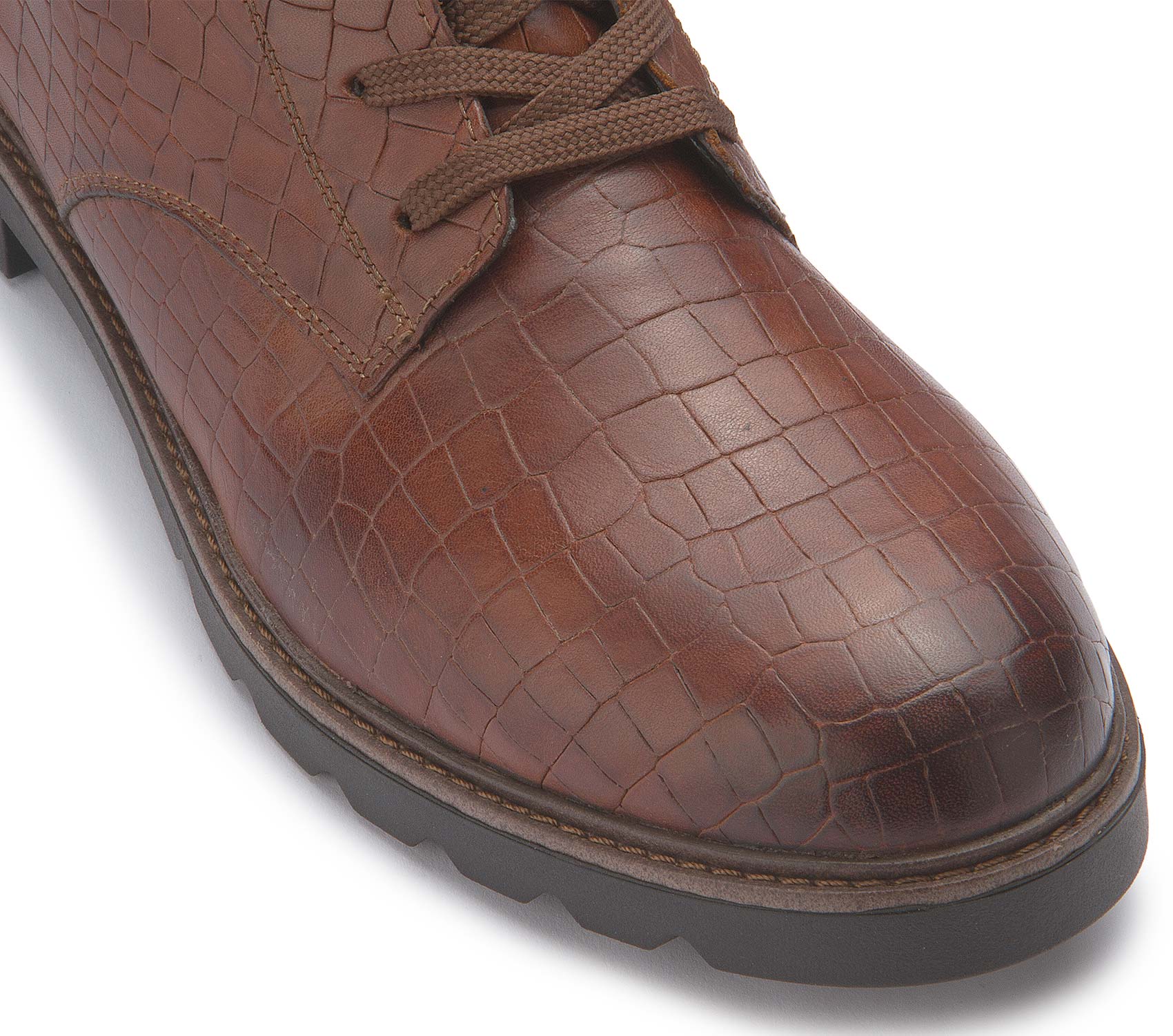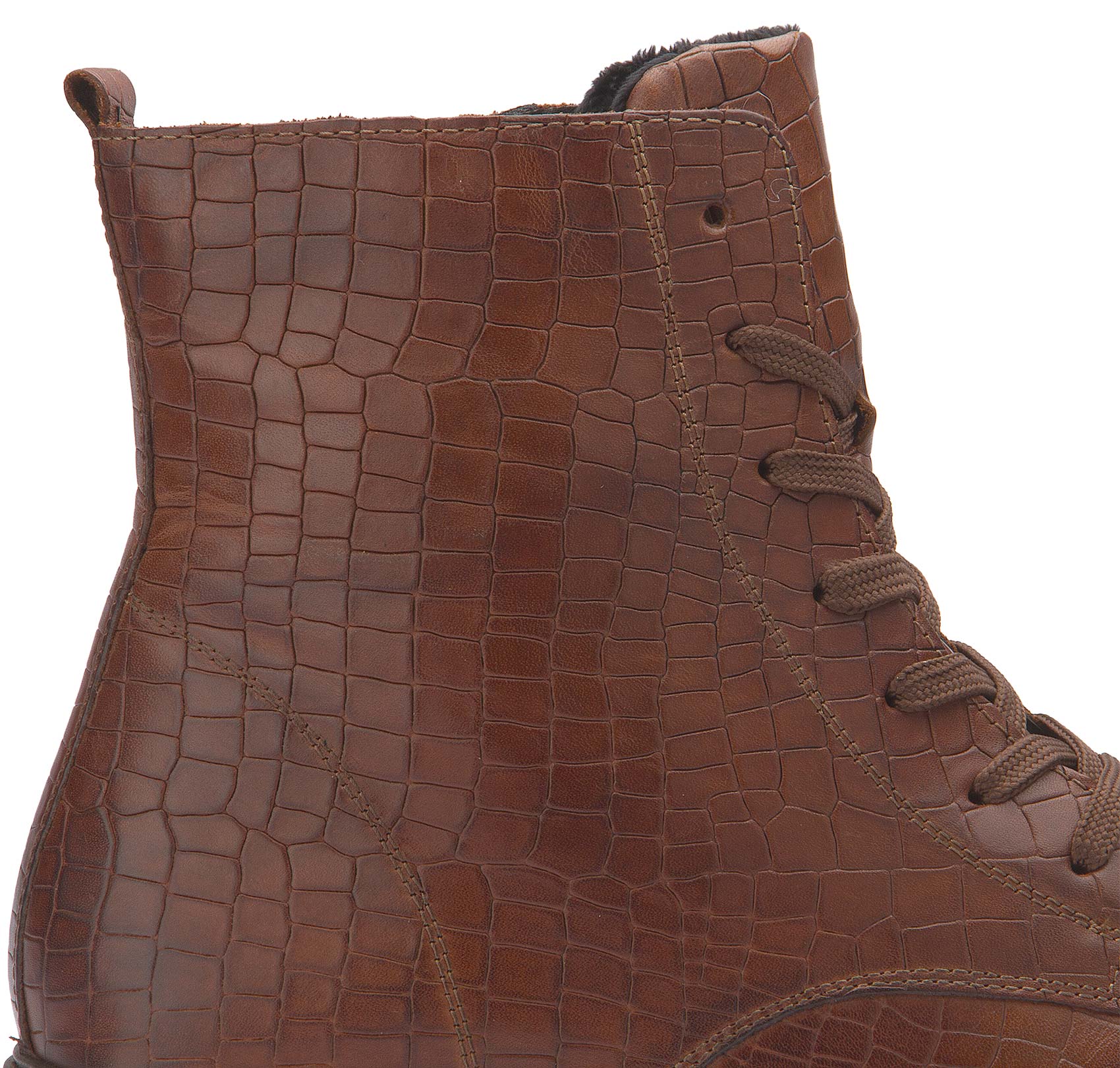 This fashionable lace-up boot impresses with its elegant crocodile embossing, which gives the warm brown shade a particularly high-quality and trendy look. The robust treaded sole ensures a firm grip, while the side zipper makes it easy to put on and take off. A stylish companion that adds a striking touch to any outfit.