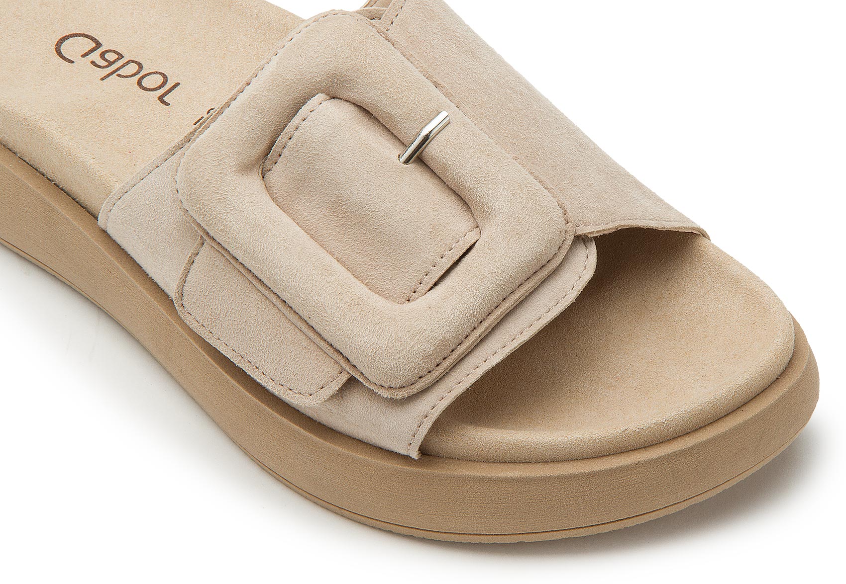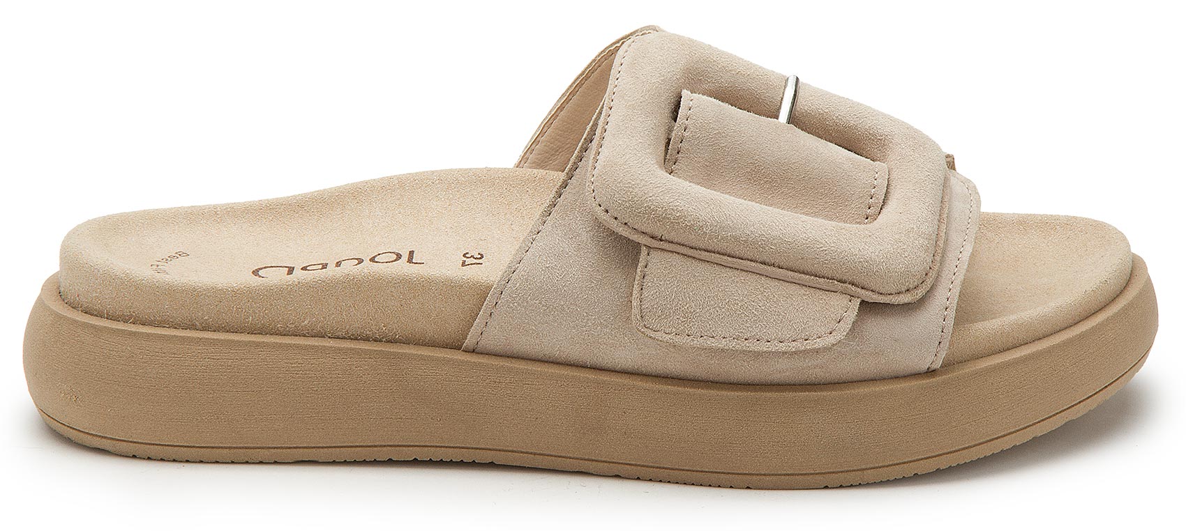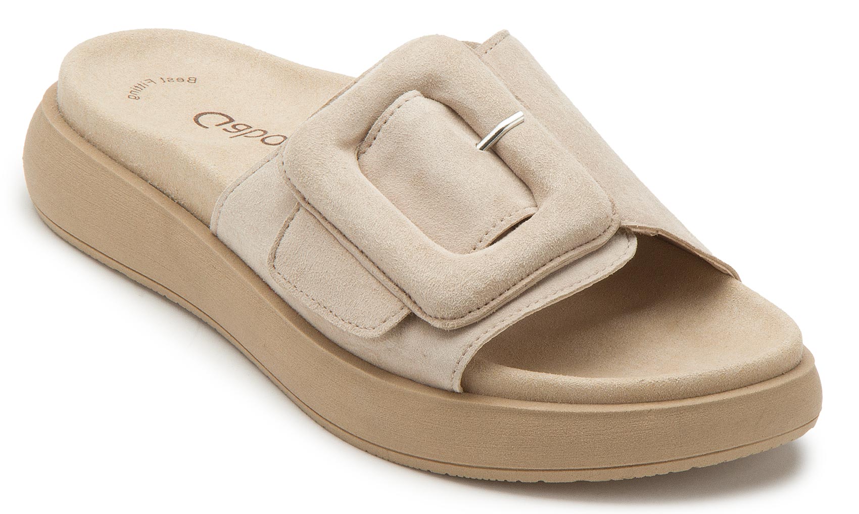 The new mule from Gabor is the perfect companion for the summer! With its timeless design and high-quality workmanship, it is not only fashionable, but also particularly comfortable. The shoe is made of soft leather, which gently nestles against the foot and provides a comfortable feeling. The mule features a large buckle that not only makes a fashion statement, but also has a practical use. This is because the buckle hides a Velcro closure that provides an individual adjustment to the foot, ensuring a secure fit while wearing. Try the Gabor mule now and see for yourself its comfort and style!