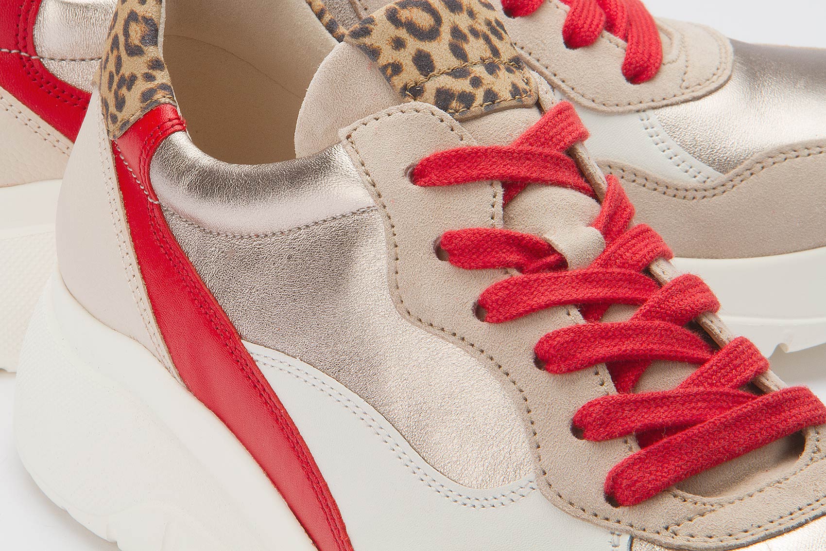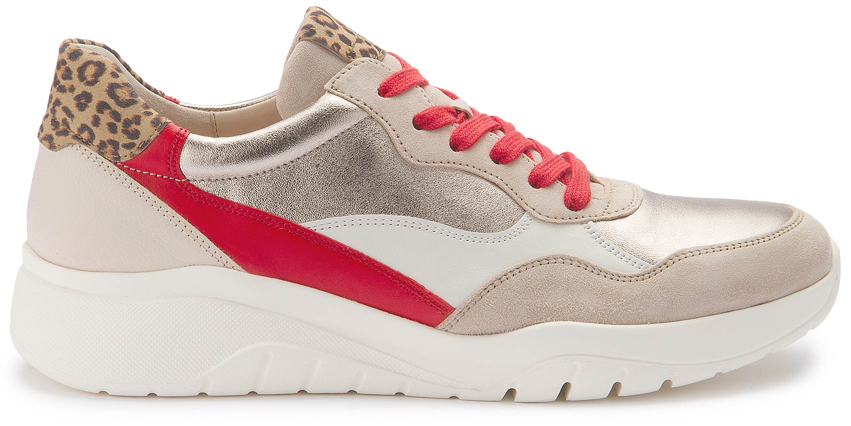 These light beige trainers from Gabor combine stylish design with first-class comfort. A special highlight of this model is the attractive leopard print, which gives the sneaker a trendy and fashionable look. Another highlight is the red lacing. Whether for everyday wear or special occasions, these trainers from Gabor are the perfect choice for fashion-conscious women who don't want to compromise on comfort.