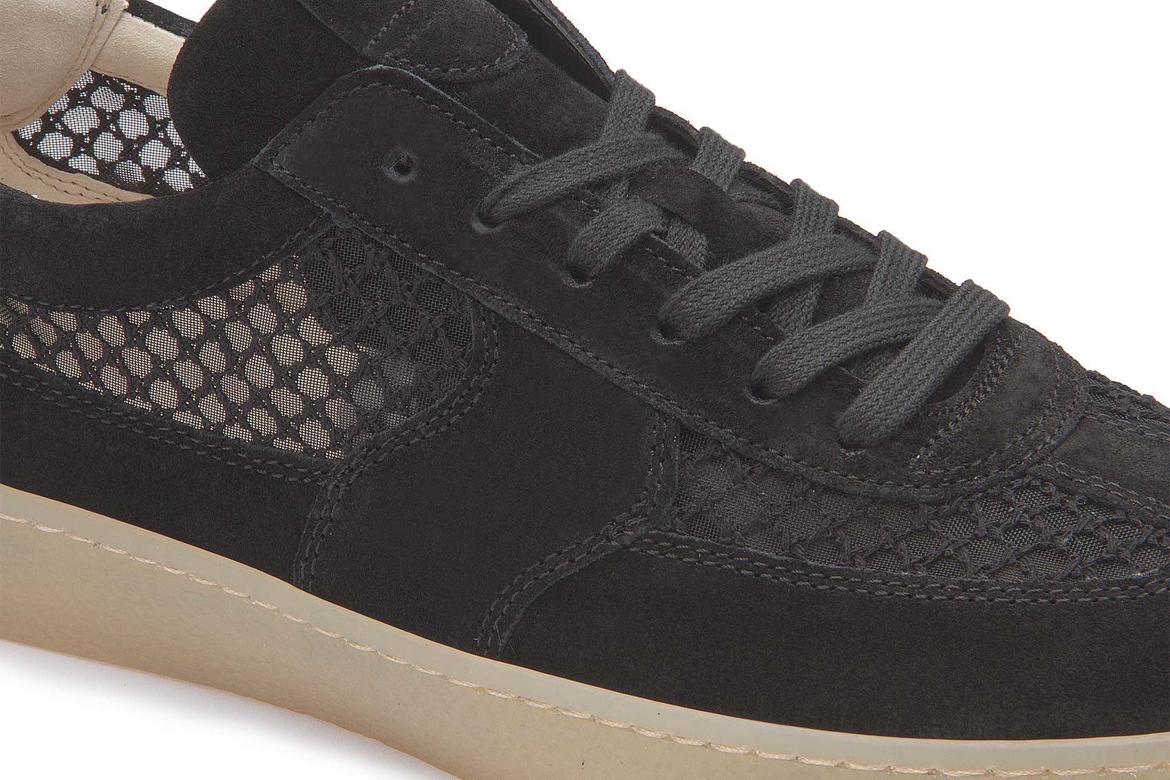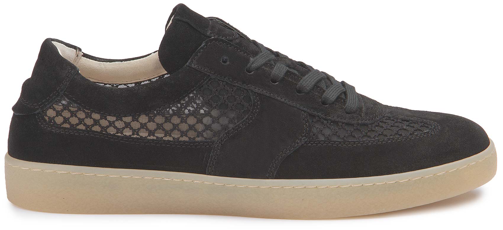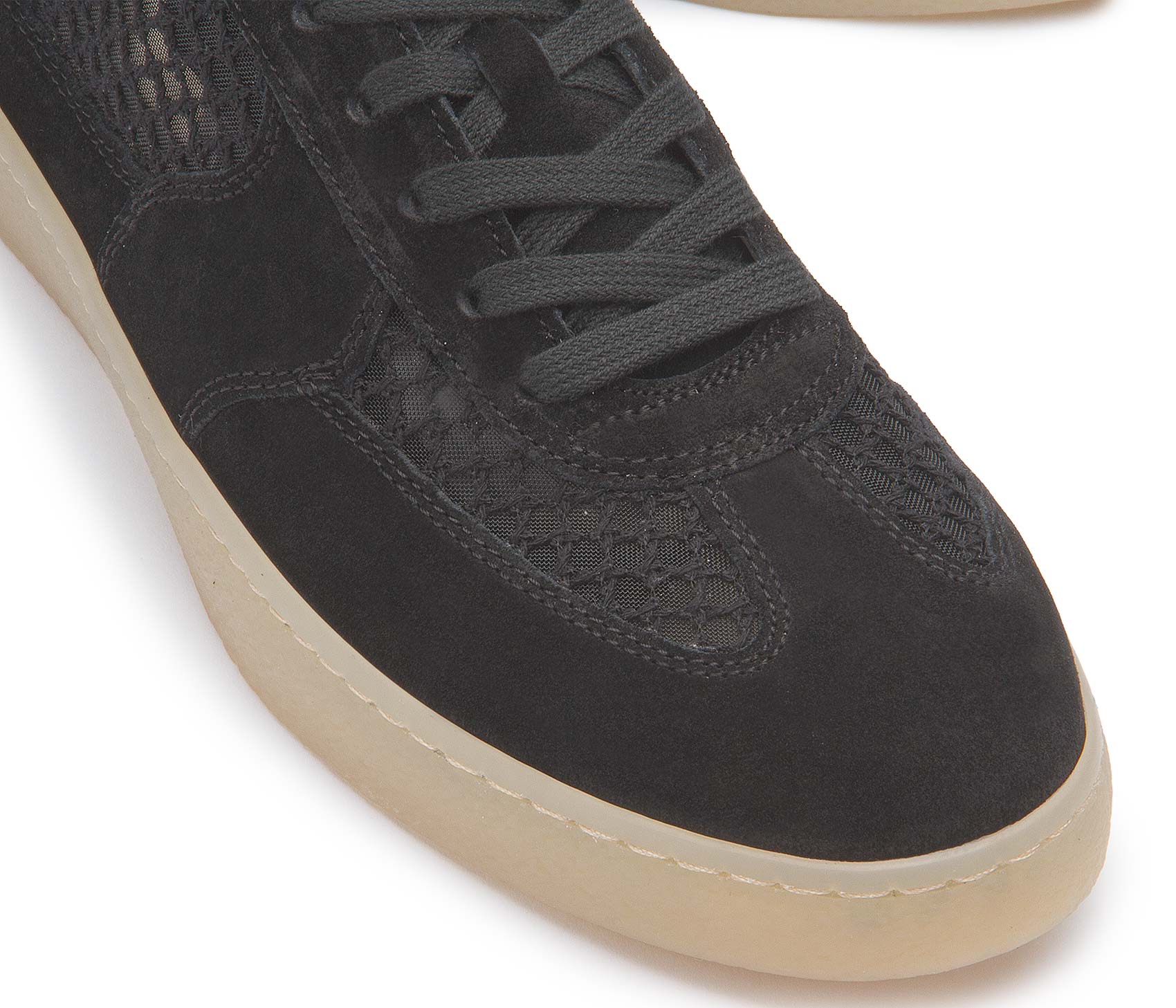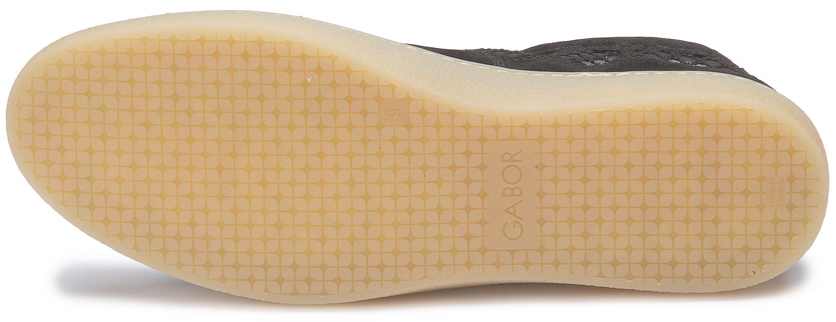 These black trainers from Gabor impress with a stylish combination of suede and transparent mesh inserts with a pattern. The light-colored, slightly raised sole creates a modern contrast and is comfortable to wear at the same time. A fashionable companion for urban everyday looks with a special detail.