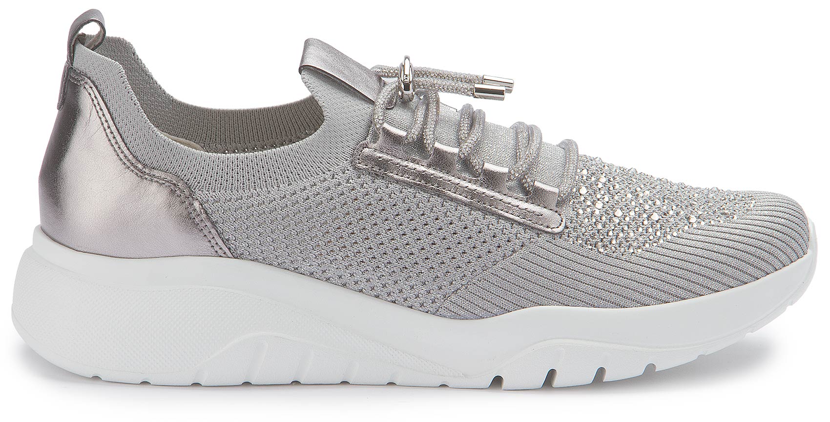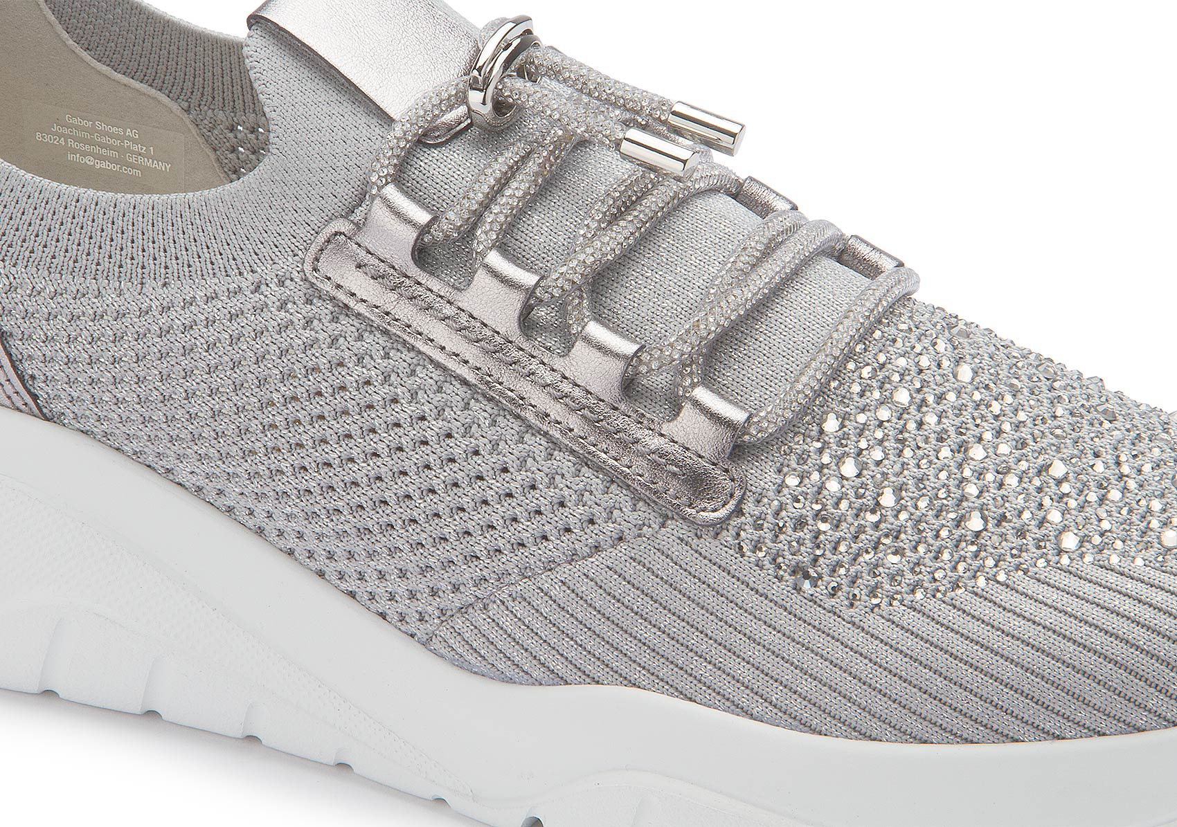 This silver sneaker from Gabor guarantees style and comfort. The mesh material is not only breathable, but also adapts perfectly to the foot. The little stones on the toe guarantee a grand entrance.