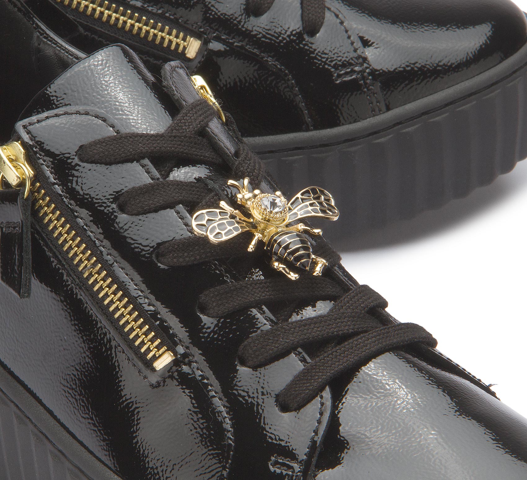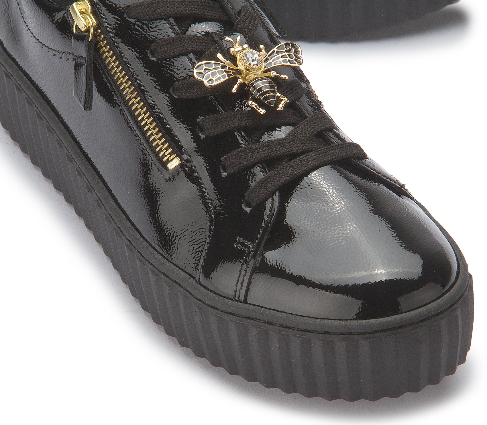 These fashionable trainers feature a trendy design with a shiny patent leather look. The eye-catching platform sole gives the model a modern touch while ensuring a comfortable fit. Stylish details such as the gold-coloured zipper on the side and decorative decorative elements make these trainers a real eye-catcher. Perfect for adding a sophisticated yet sporty touch to any outfit.