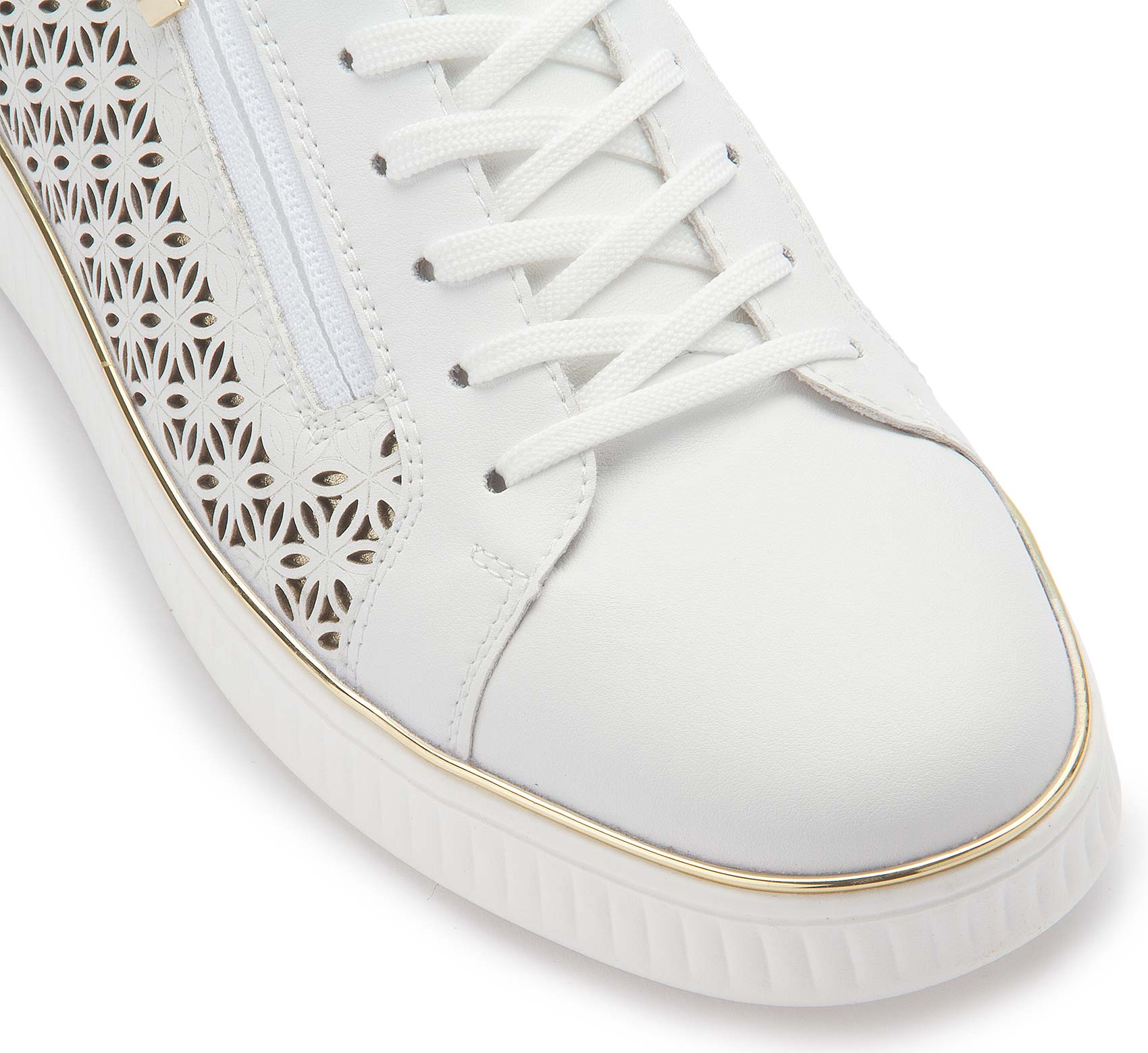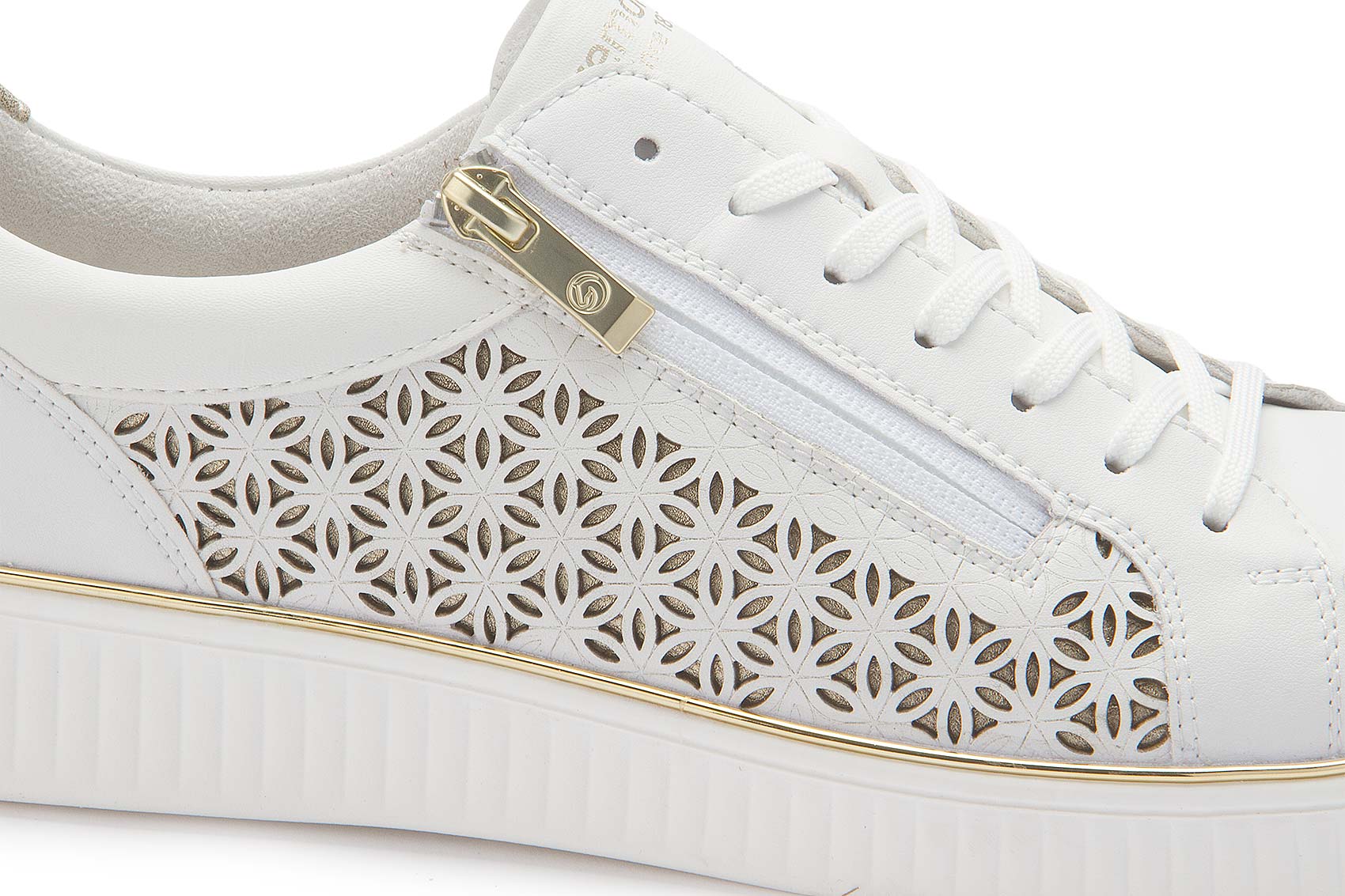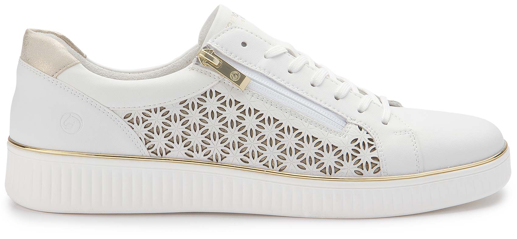 These white Remonte trainers made from smooth leather will make the hearts of fashion-conscious women beat faster. In addition to the laces, the model also has a zipper for optimum support. The Lite 'n Soft technology combines a lightweight outsole with a padded and removable insole. The shoe is also cut in a comfort width. The trainers are equipped with a breathable micro velour lining. Comfort meets style!
