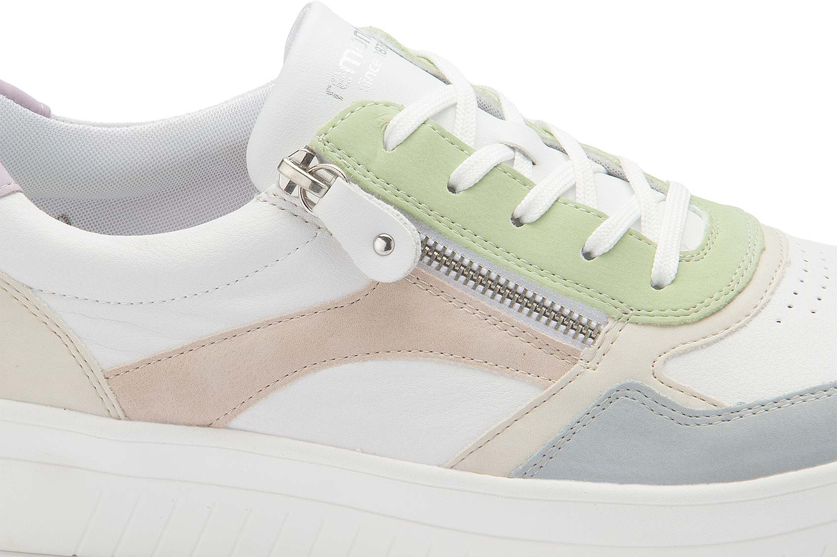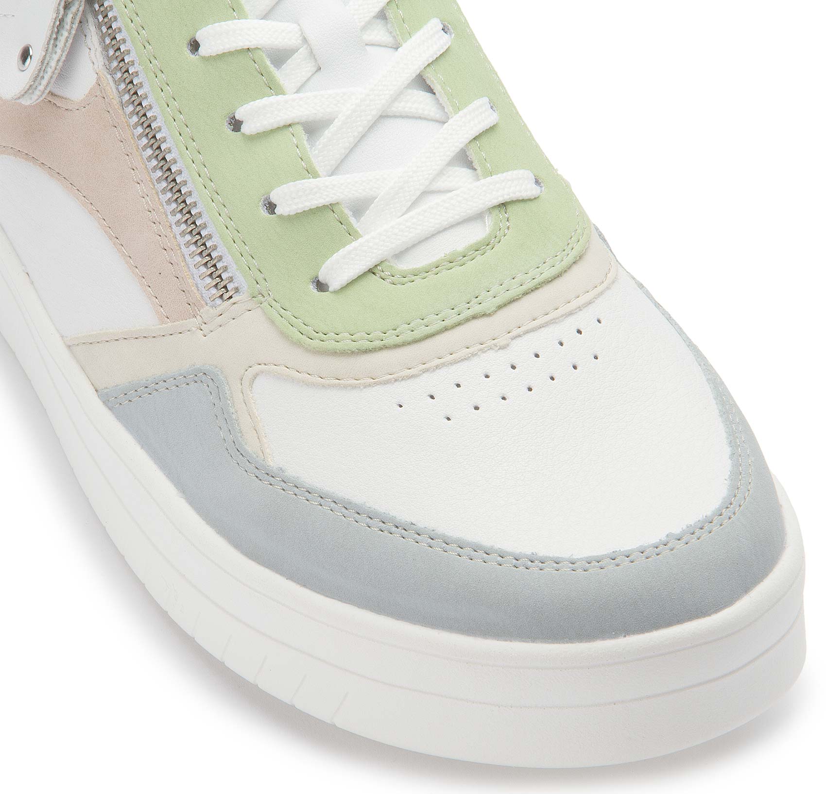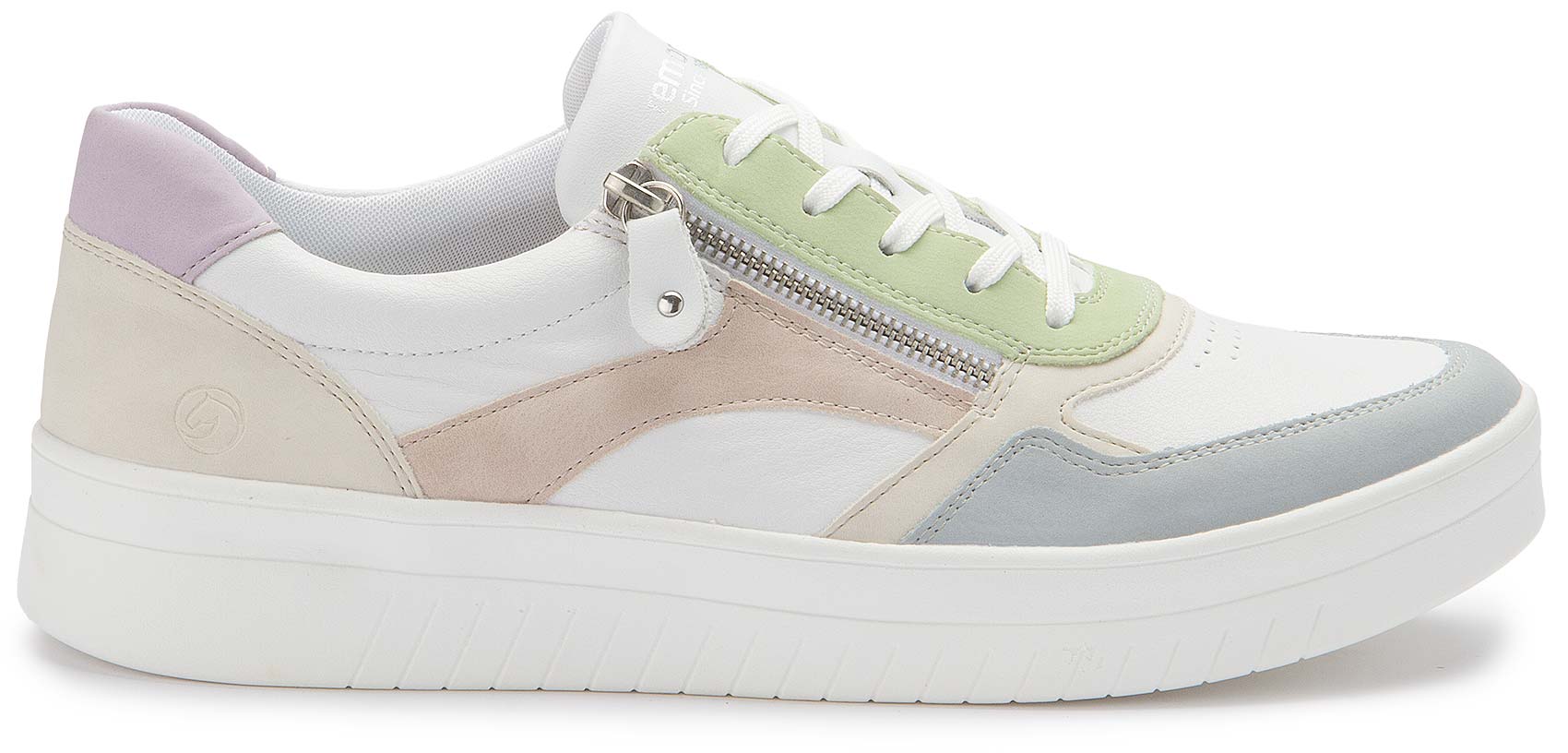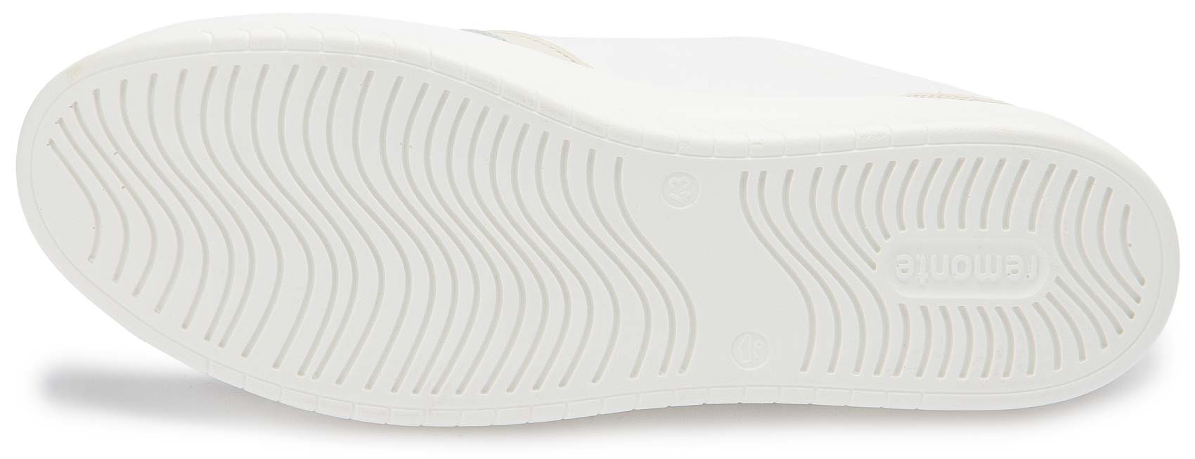 These white remonte trainers made from smooth leather are sure to impress. A lace-up fastening complements the zipper and ensures functionality and comfort. The Lite 'n Soft technology combines a lightweight outsole with a padded and removable insole. The sneakers are equipped with a breathable micro velour lining.