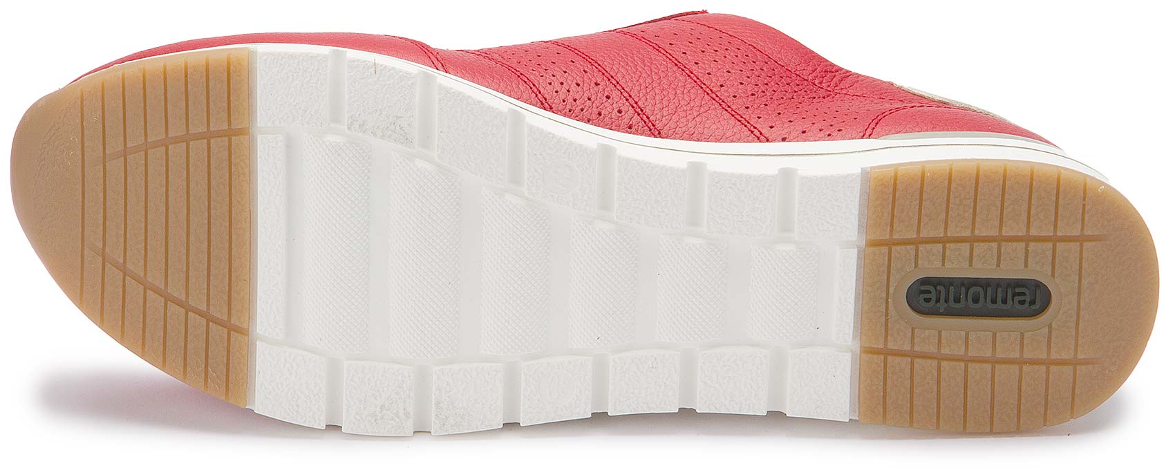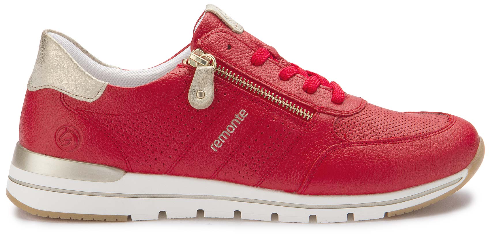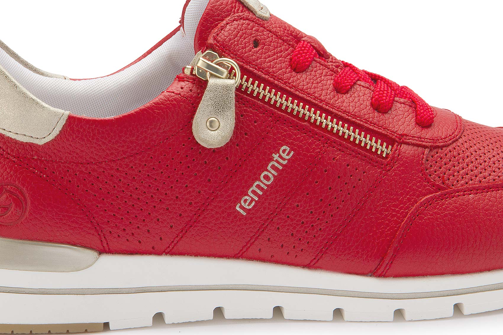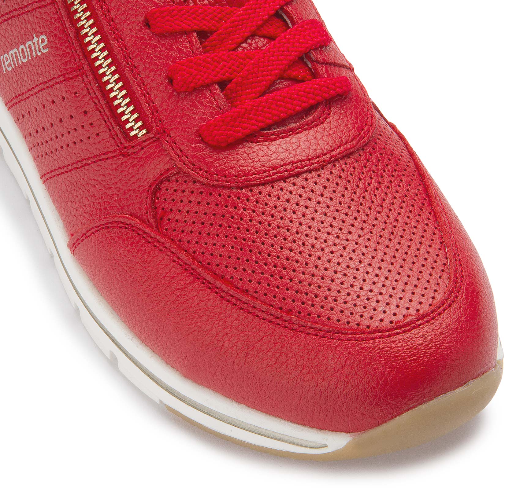 A shoe for all occasions! These red Remonte trainers made from smooth leather are sure to impress. The clever combination of lacing and zipper provides optimal support and makes them easy to put on and take off. The non-slip, lightweight sole, together with the padded and removable insole, ensures a pleasantly cushioned stride. The inner lining made of breathable micro velour offers long-lasting comfort. Comfort meets style!