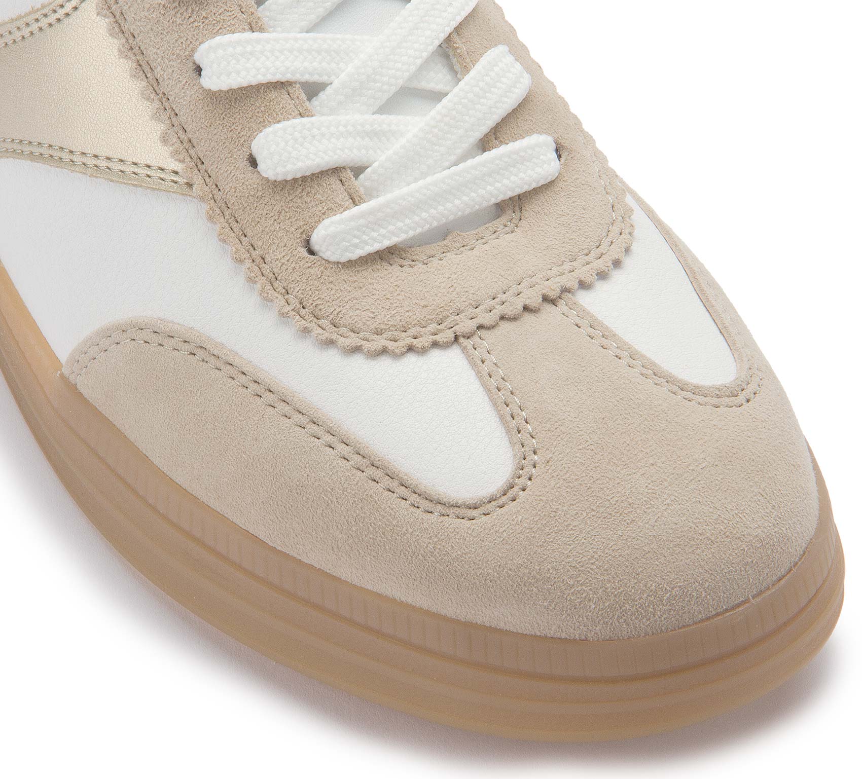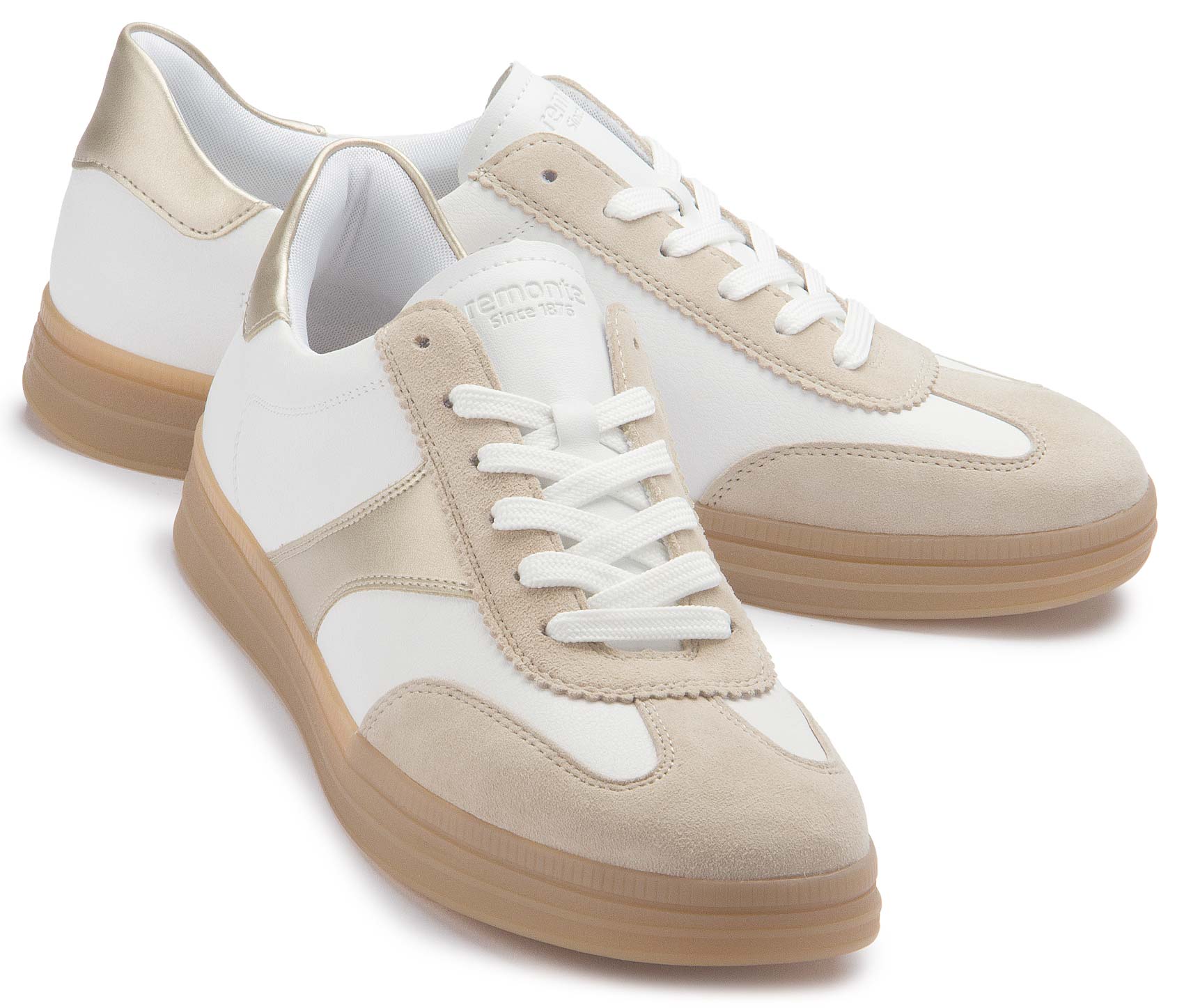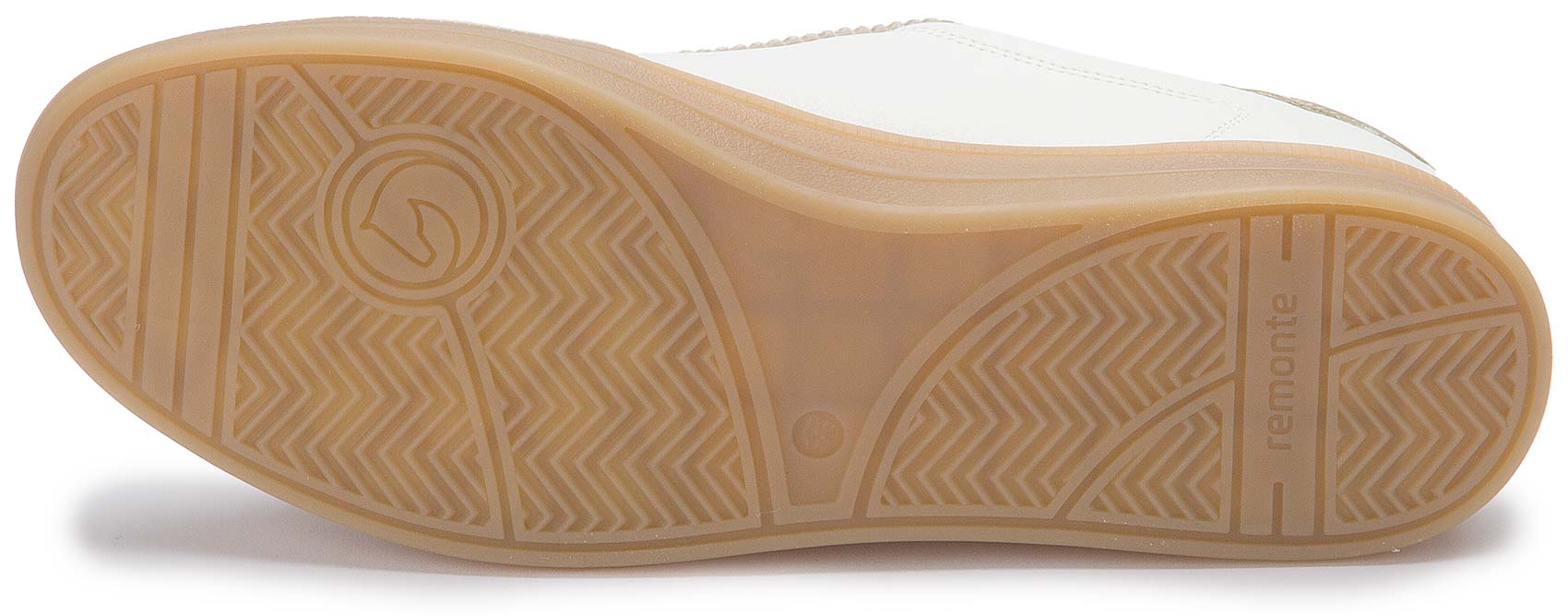 Beautiful sneaker by Remonte in white with beige nubuck appliqués. The golden details round off the design. The removable footbed and textile lining ensure optimum comfort.