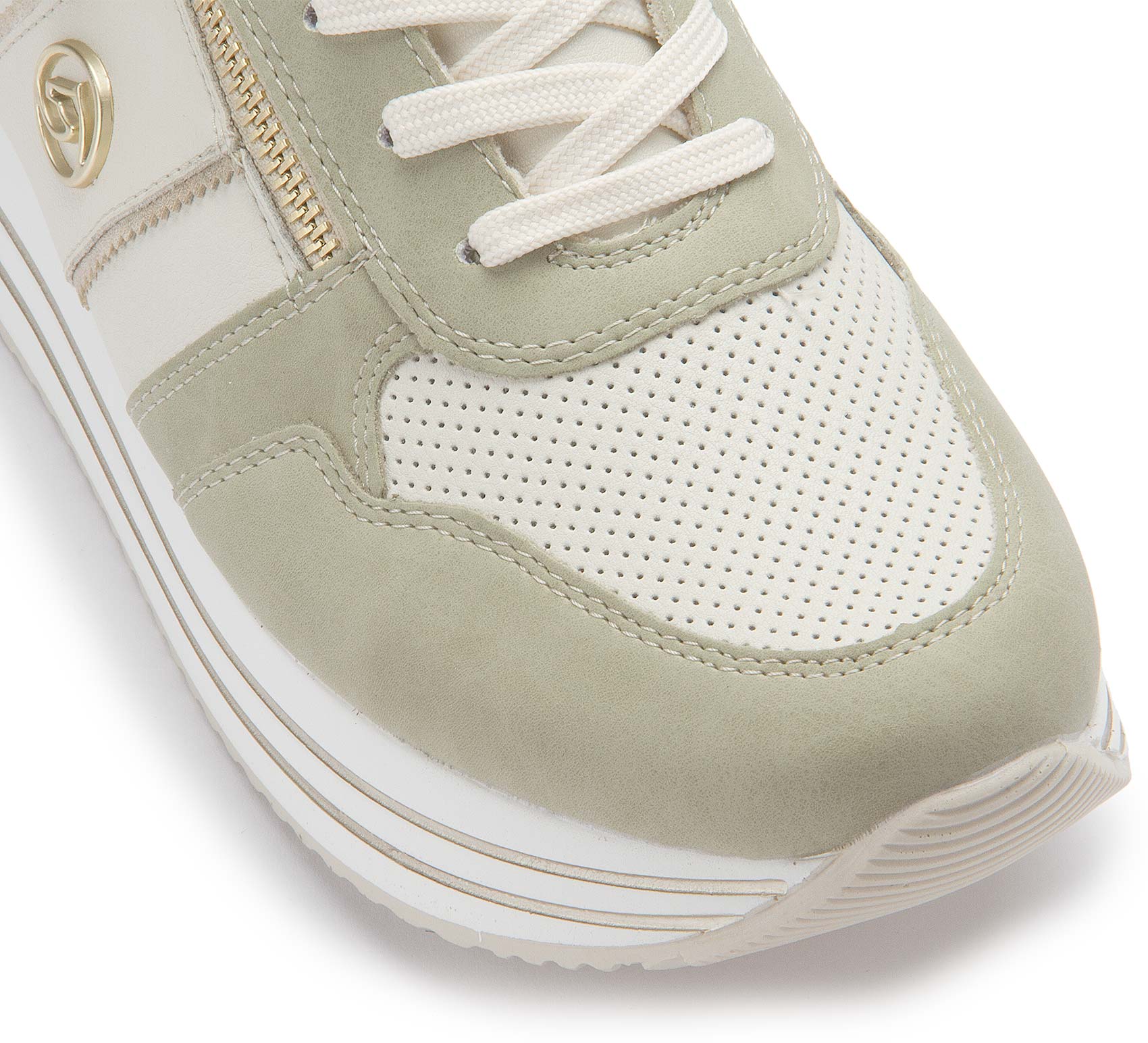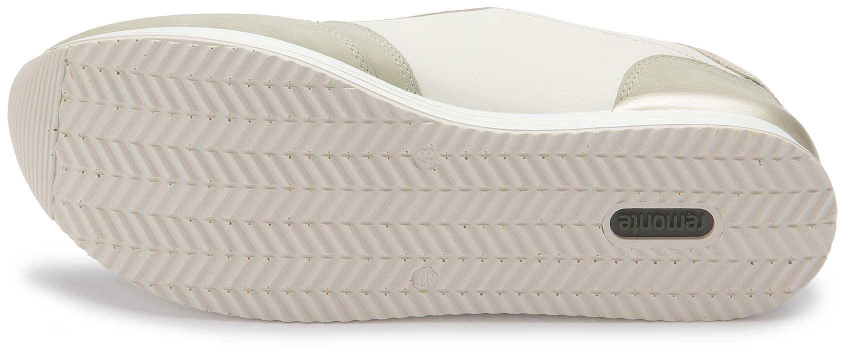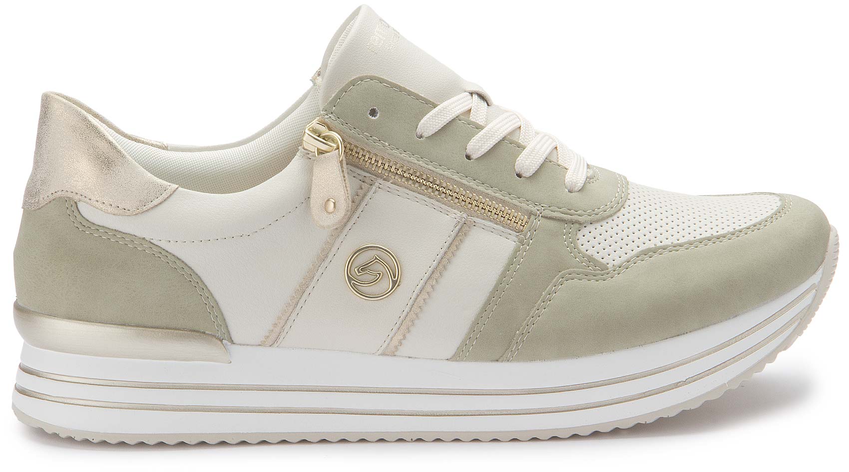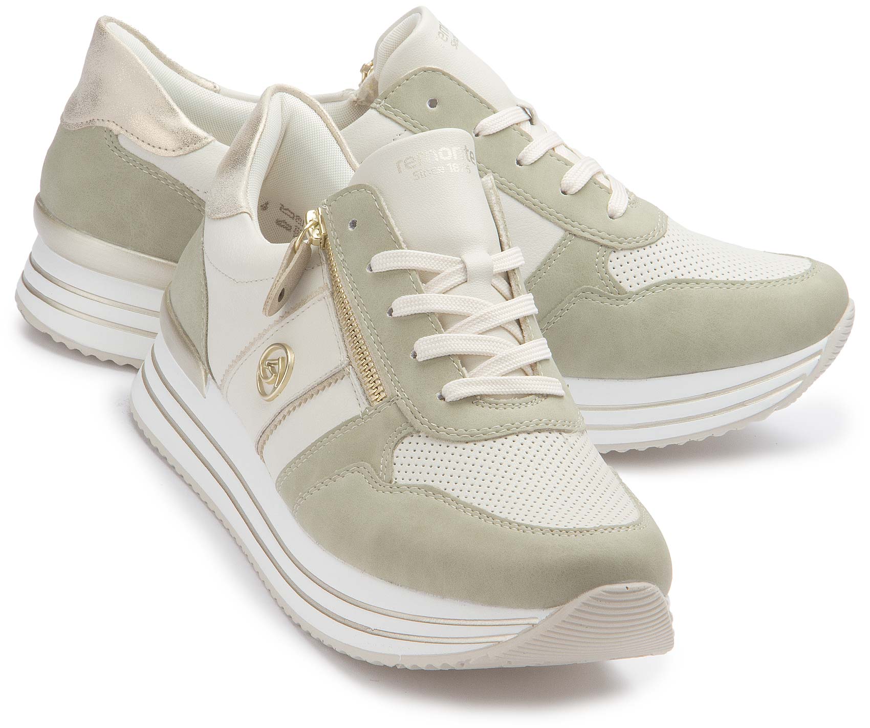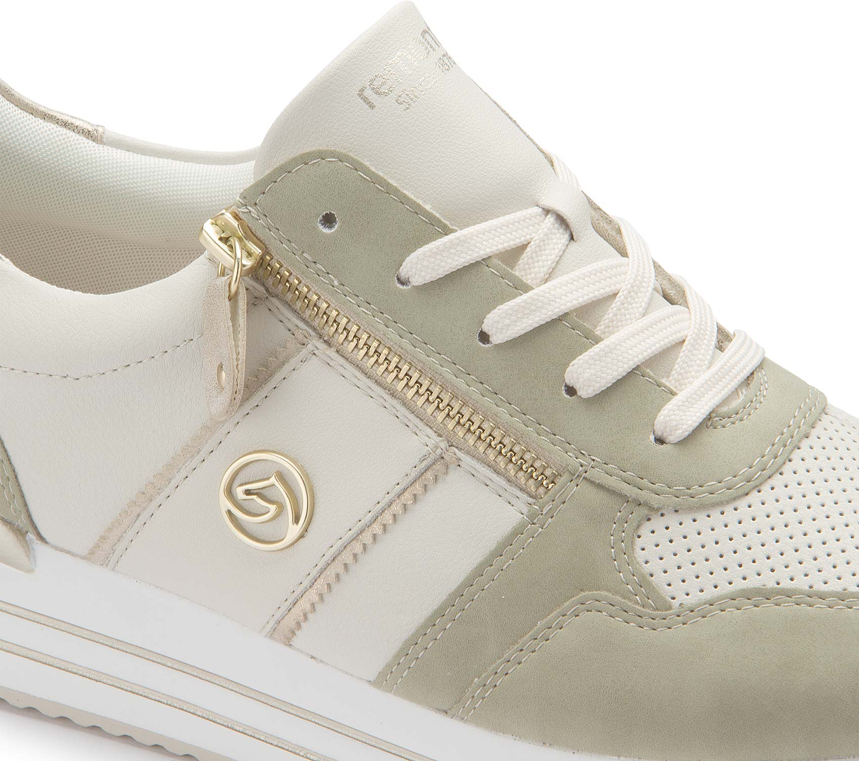 Maximum comfort every step of the way! These sage green Remonte trainers made of smooth leather will keep you cool and casual, yet stylish. The clever combination of laces and a zipper provides good support and makes them easy to put on and take off. The flexible and particularly lightweight platform sole, together with the padded and removable insole, ensures pleasantly cushioned steps. The micro velour lining is lightweight and breathable. We love it!
