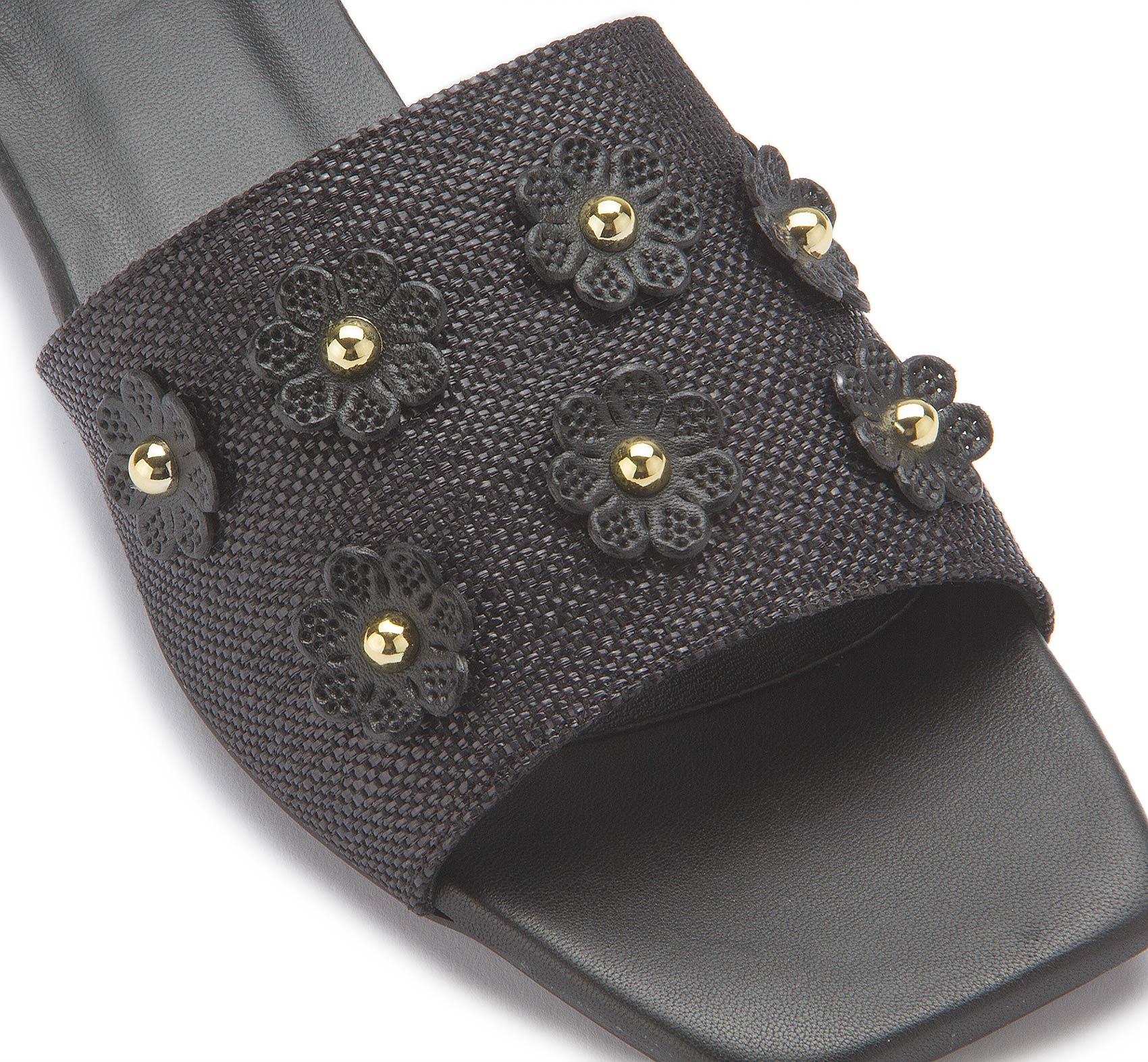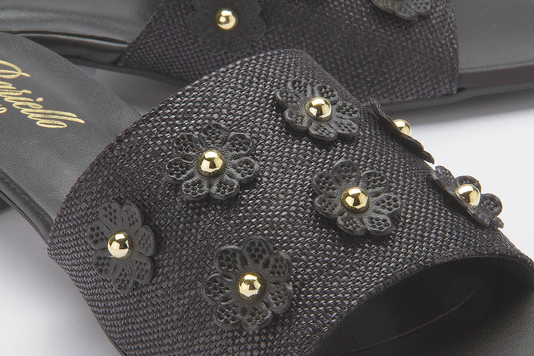 Wunderschöne Pantolette von Bariello aus hochwertigem Bast in Schwarz. Das Lederinnenfutter und die gepolsterte Lederinnensohle sorgen für Komfort den ganzen Tag über. Zum Verlieben schön sind die kleinen applizierten Blumen und die Perlen in Gold. Ein absoluter Highlight-Schuh von Bariello!