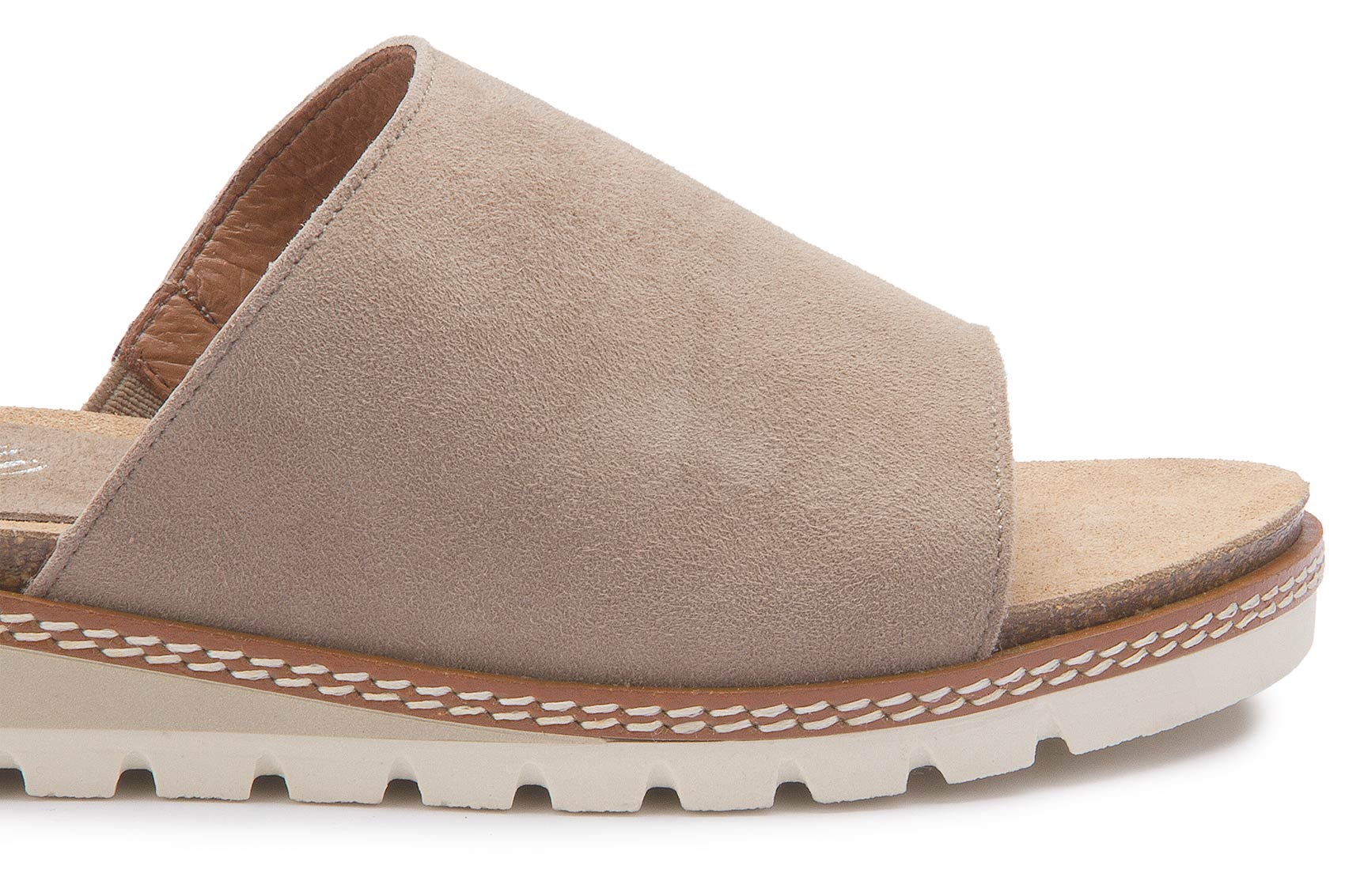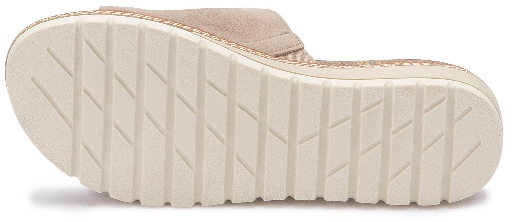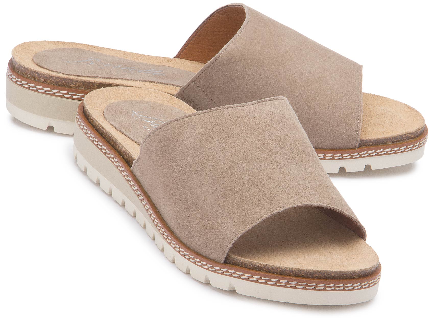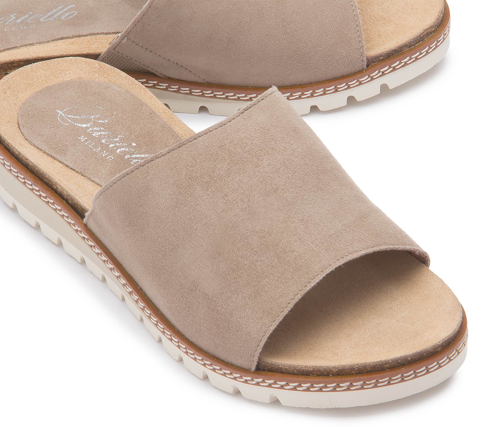 Diese lässige Pantolette von Bariello überzeugt mit ihrem cleanen Design in softem Beige und einer hochwertigen Rauleder-Optik. Die breite Bandage sorgt für angenehmen Halt, während die markante, profilierte Sohle einen modernen Look und hohen Tragekomfort bietet. Ein stilvoller Begleiter für entspannte Sommer-Outfits mit italienischem Flair.