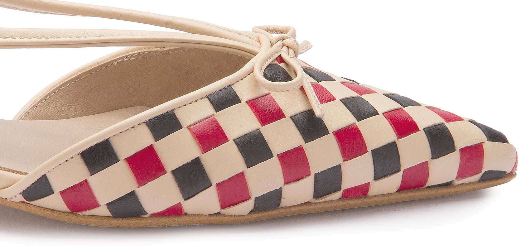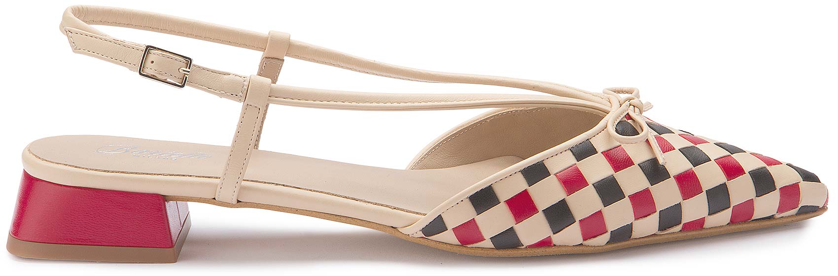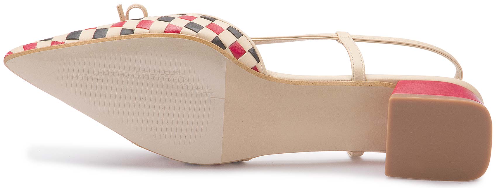 Diese stilvollen Sandalen ziehen mit ihrem geflochtenen Karomuster in Rot, Schwarz und Beige alle Blicke auf sich. Die spitz zulaufende Form und die feinen Riemchen mit zarter Schleife verleihen dem Modell eine feminine, elegante Note, während der niedrige Absatz für angenehmen Tragekomfort sorgt. Ein modischer Hingucker, der jedes Outfit raffiniert ergänzt.