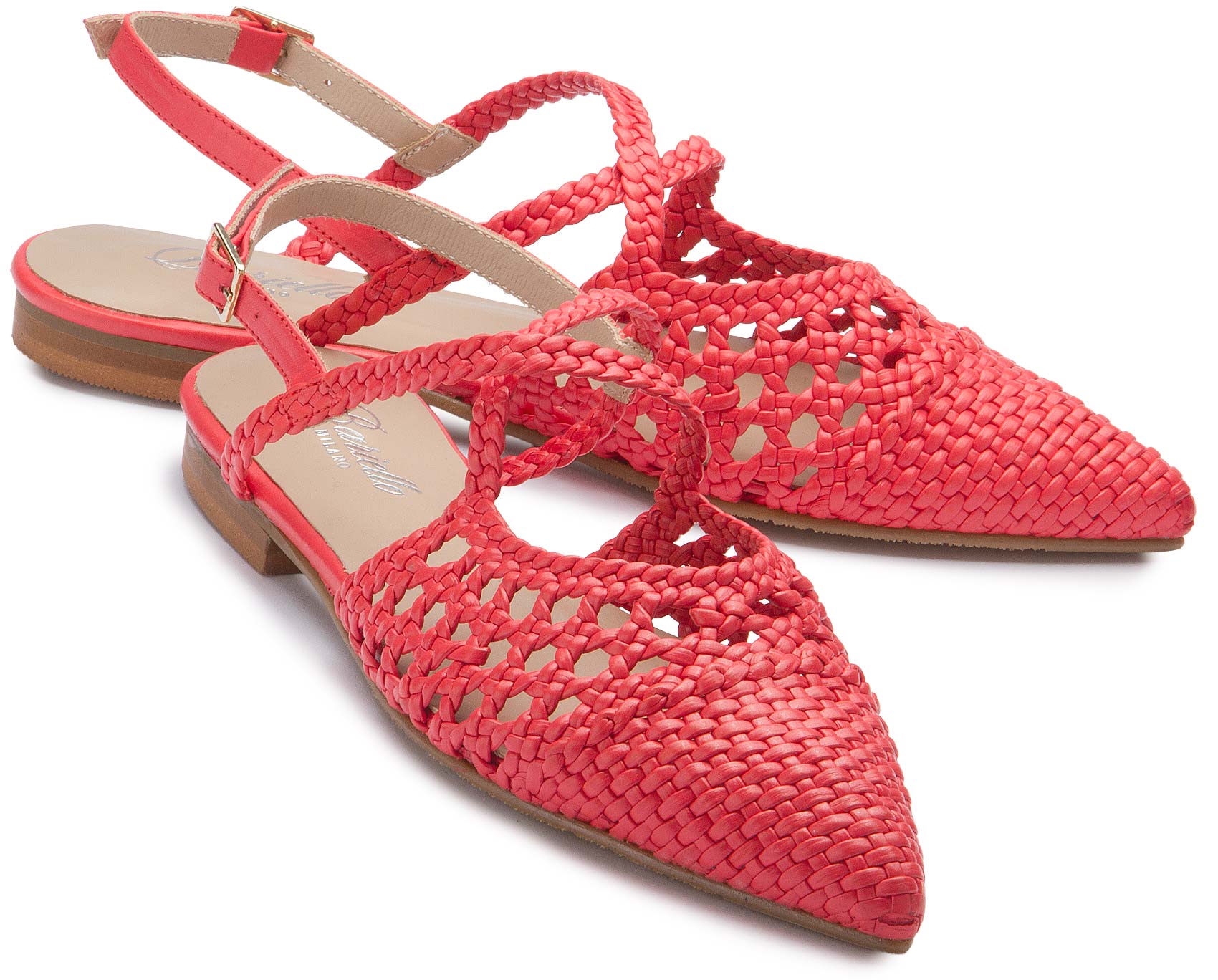 Diese Sandalette von Bariello Milano fällt mit ihrem kunstvoll geflochtenen Design und der leuchtenden Farbe sofort ins Auge. Der verstellbare Fersenriemen sorgt für sicheren Halt, während die flache Sohle angenehmen Tragekomfort bietet. Ein stilvoller Schuh, der sommerlichen Outfits eine frische und moderne Note verleiht.