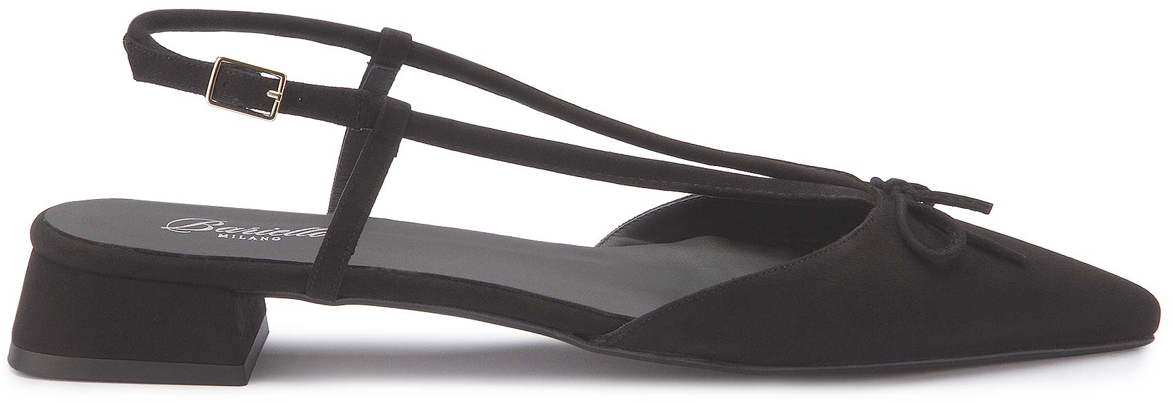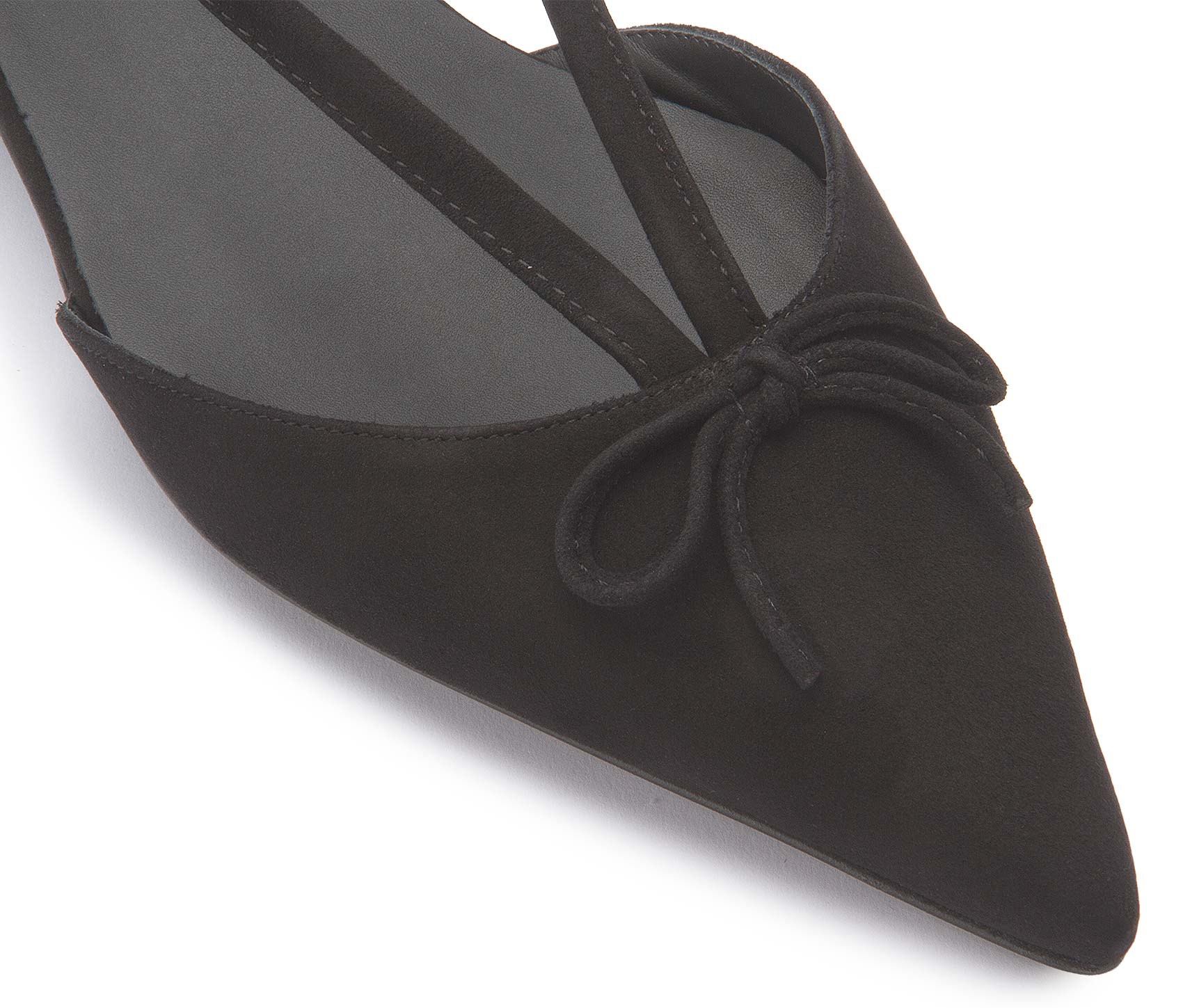 Diese eleganten Slingpumps in klassischem Schwarz überzeugen mit ihrem minimalistischen Design und feinen Details. Die spitze Silhouette, zarte Riemchen und eine kleine Schleife verleihen dem Modell eine feminine Note, während der niedrige Absatz für angenehmen Tragekomfort sorgt. Ein zeitloser Begleiter, der sich vielseitig zu eleganten und modernen Looks kombinieren lässt.