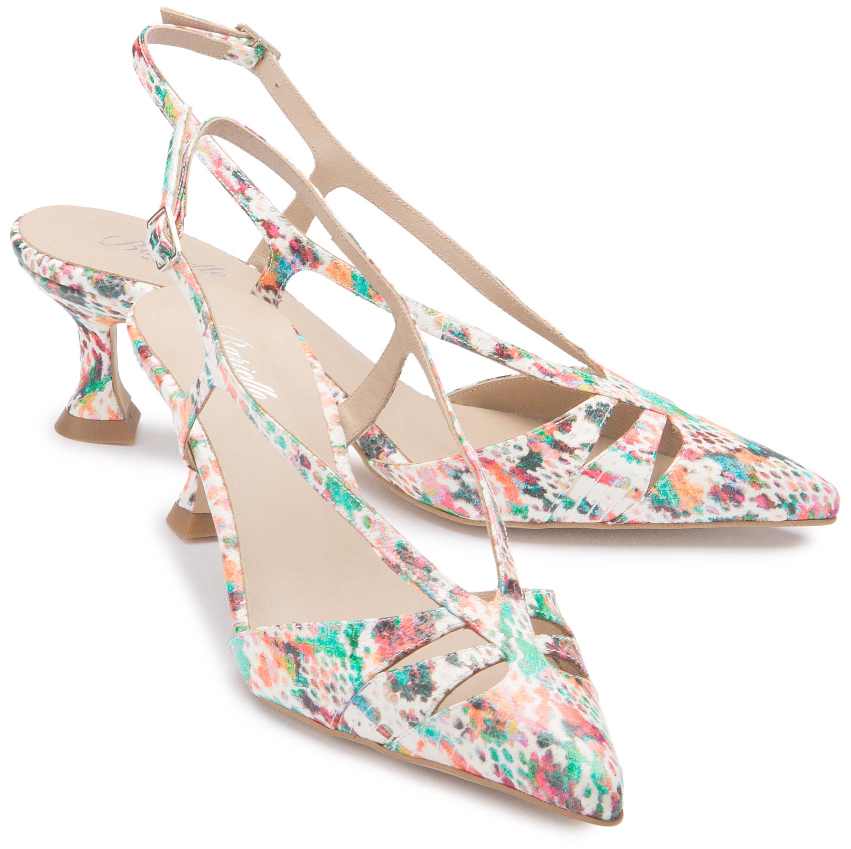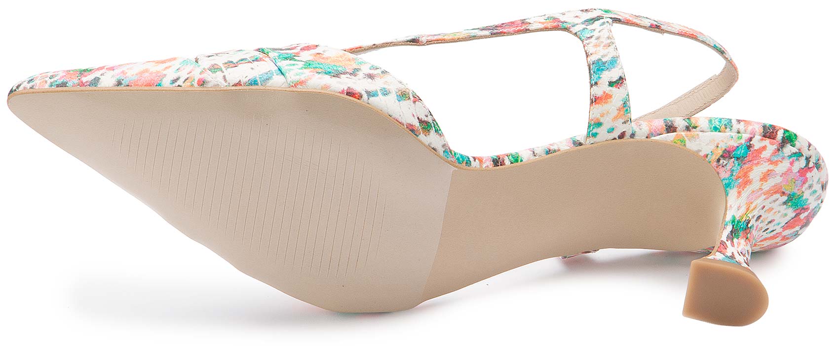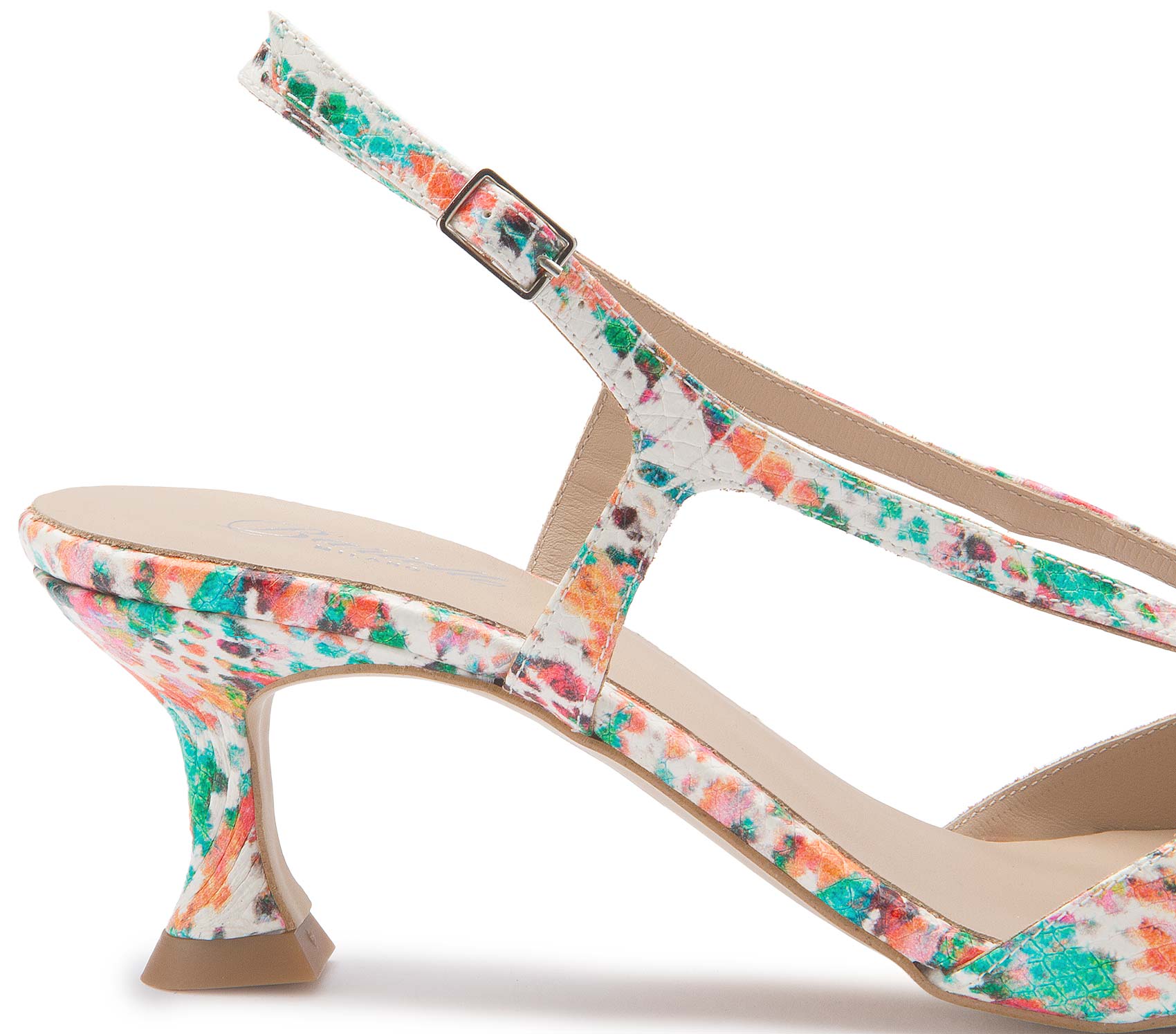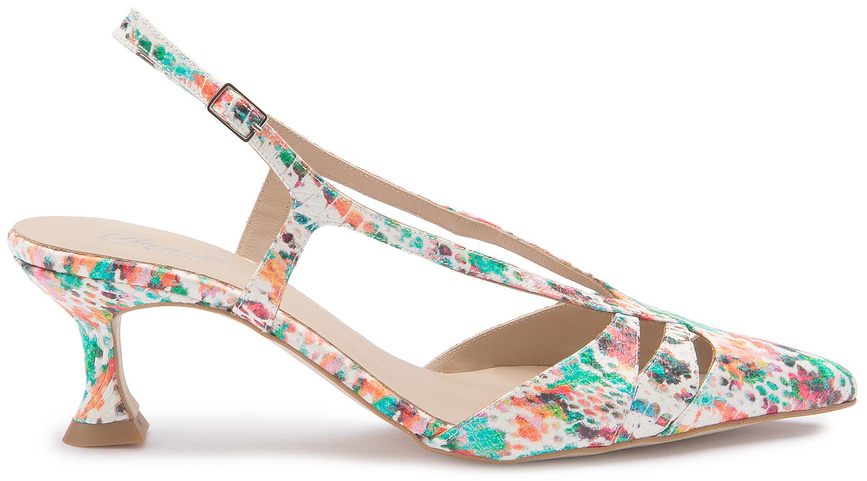 Diese eleganten Slings begeistern mit ihrem farbenfrohen, kunstvollen Muster und einer modernen Linienführung. Die spitze Form, filigrane Cut-outs und zarte Riemchen verleihen dem Schuh Leichtigkeit, während der geschwungene Absatz für einen stilvollen Auftritt sorgt. Ein besonderer Hingucker für individuelle Looks – perfekt für Events oder sommerliche Outfits.