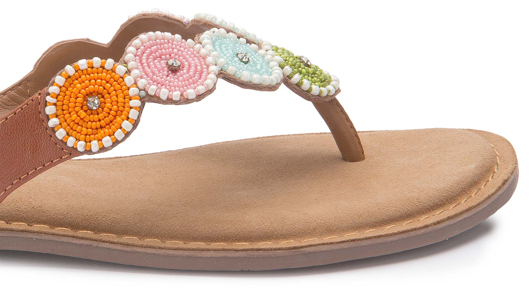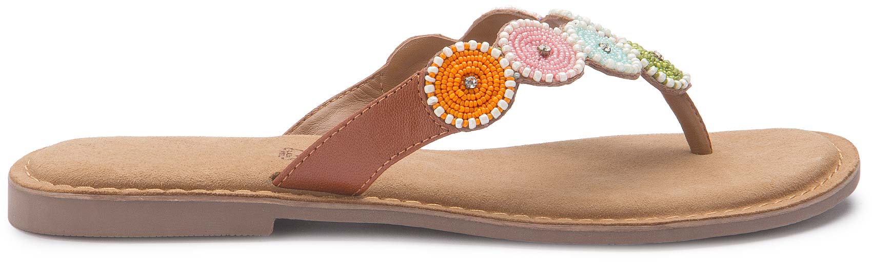 Diese stilvollen Zehentrenner überzeugen mit ihrem sommerlichen Design und liebevoll gearbeiteten Perlenapplikationen in frischen Farben. Das weiche Fußbett sorgt für angenehmen Tragekomfort, während die flache Sohle ideal für entspannte Spaziergänge ist. Ein modischer Begleiter für warme Tage – leicht und vielseitig kombinierbar.