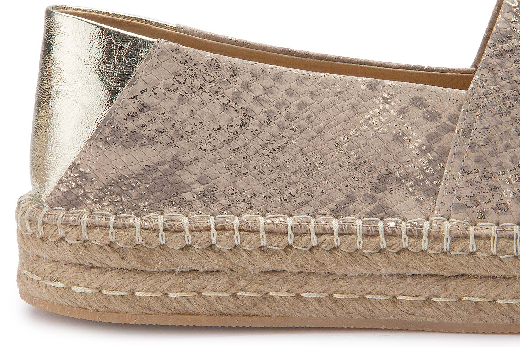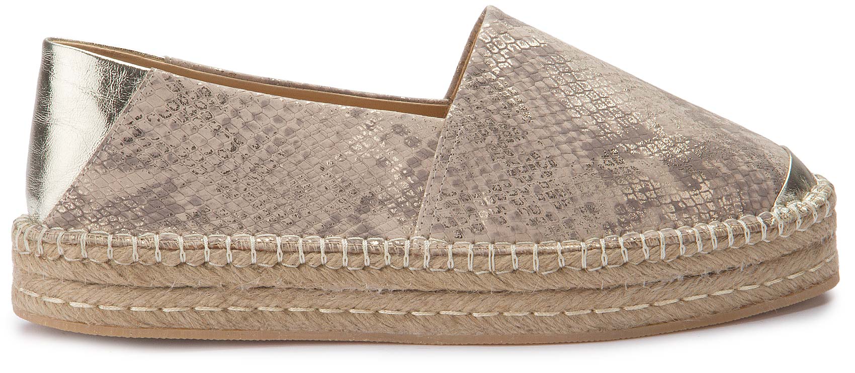 Verleihe deinem Sommeroutfit ein stilvolles Upgrade mit diesen eleganten Espadrilles. In edlem Schlangen-Optik-Design und schimmerndem Beigeton ziehen sie alle Blicke auf sich. Das hochwertige Rauleder außen und das weiche Lederfutter innen sorgen für ein angenehmes Tragegefühl – den ganzen Tag über. Spürst du schon die Vorfreude auf sonnige Tage, an denen du diese modischen Lieblingsstücke endlich ausführen kannst?