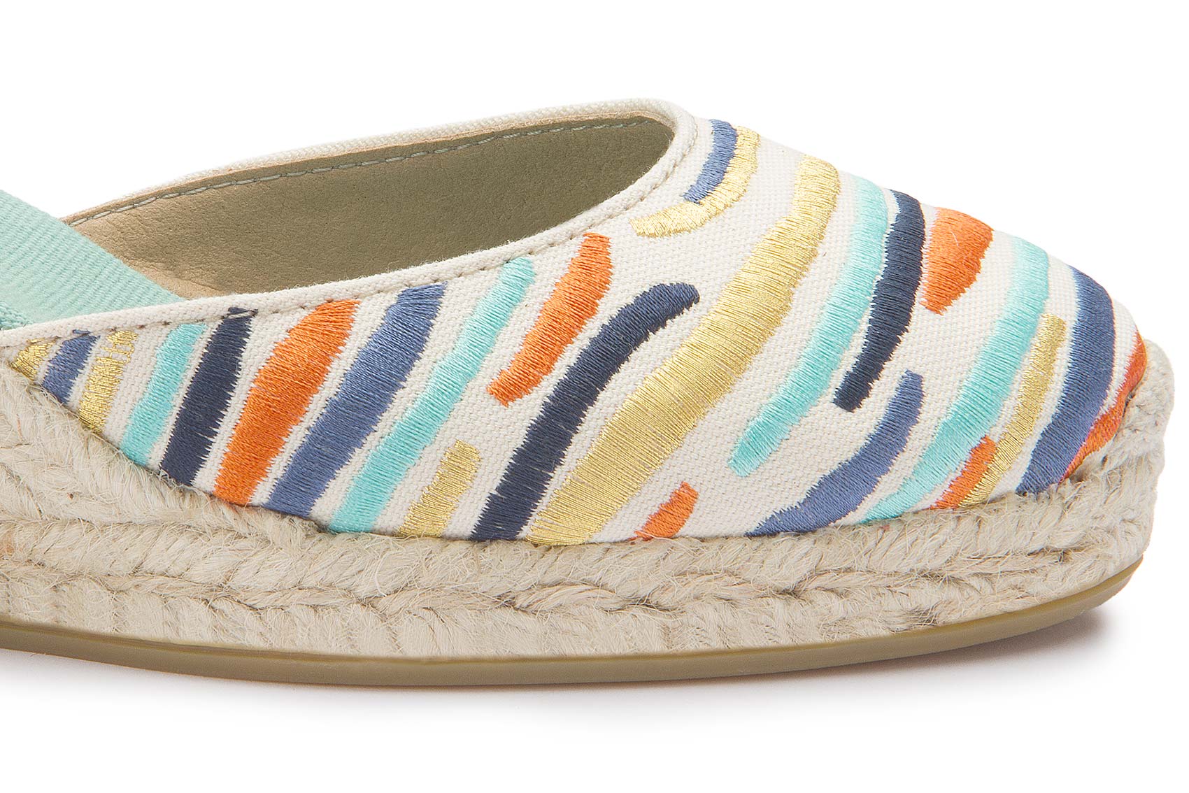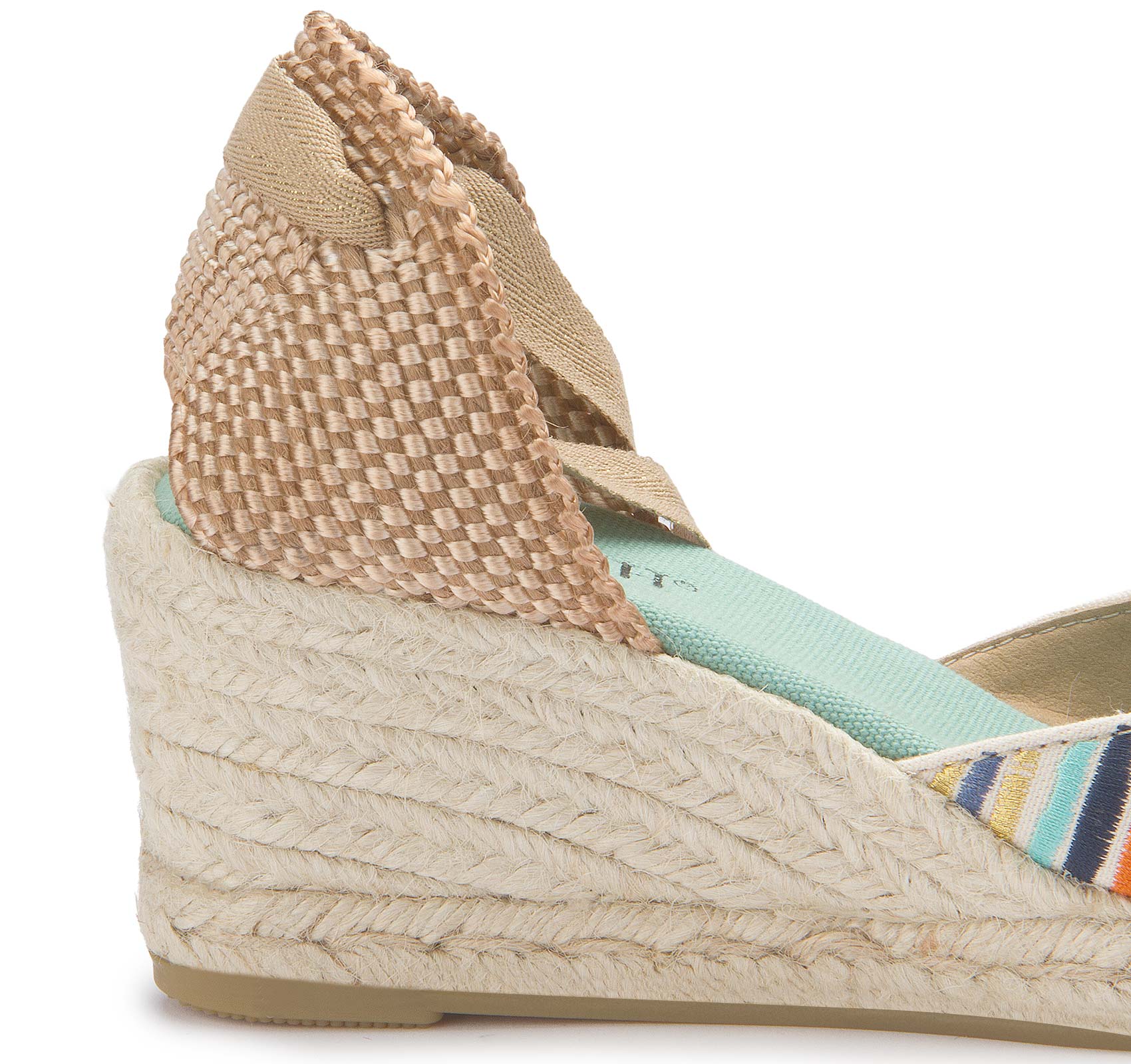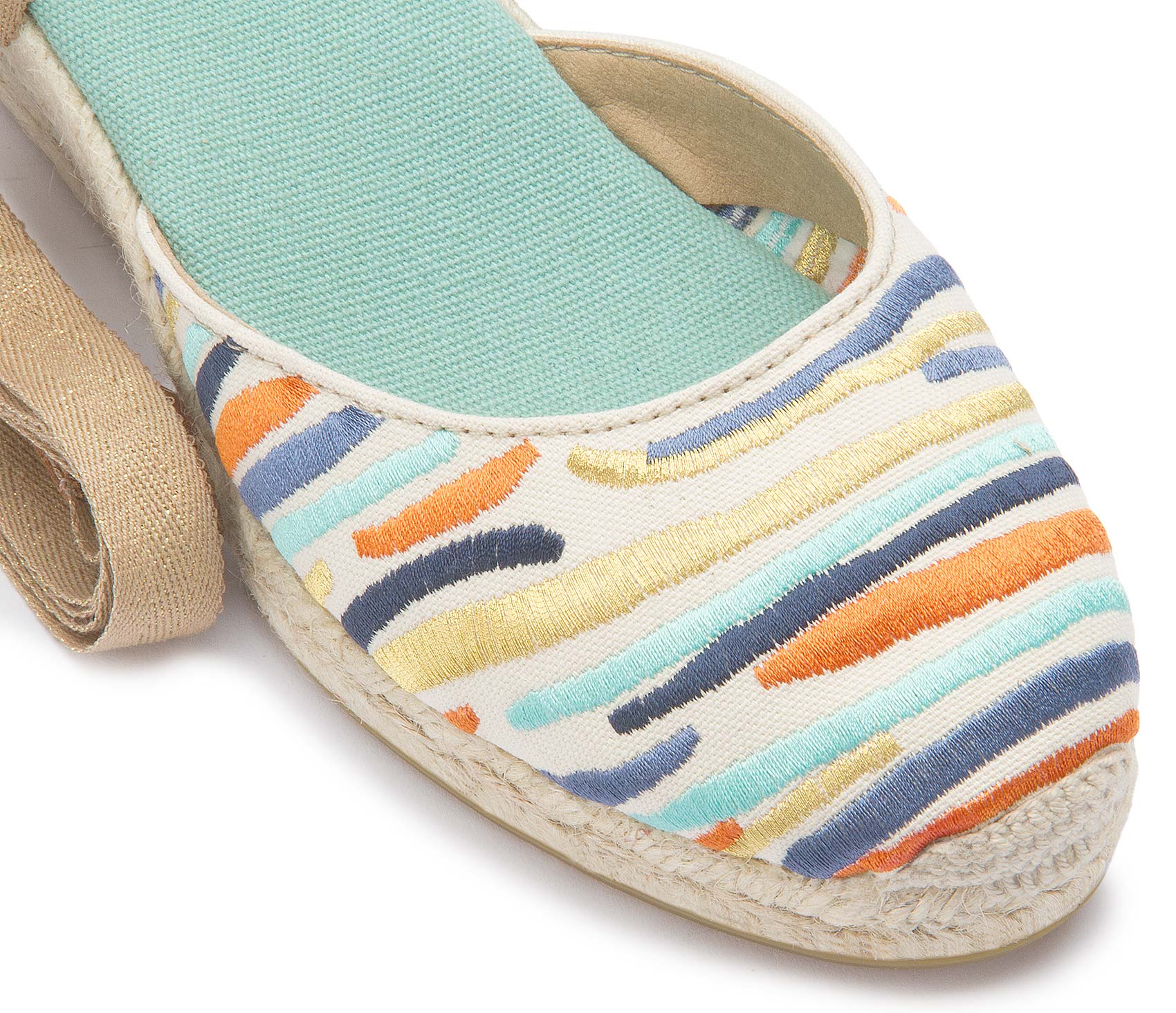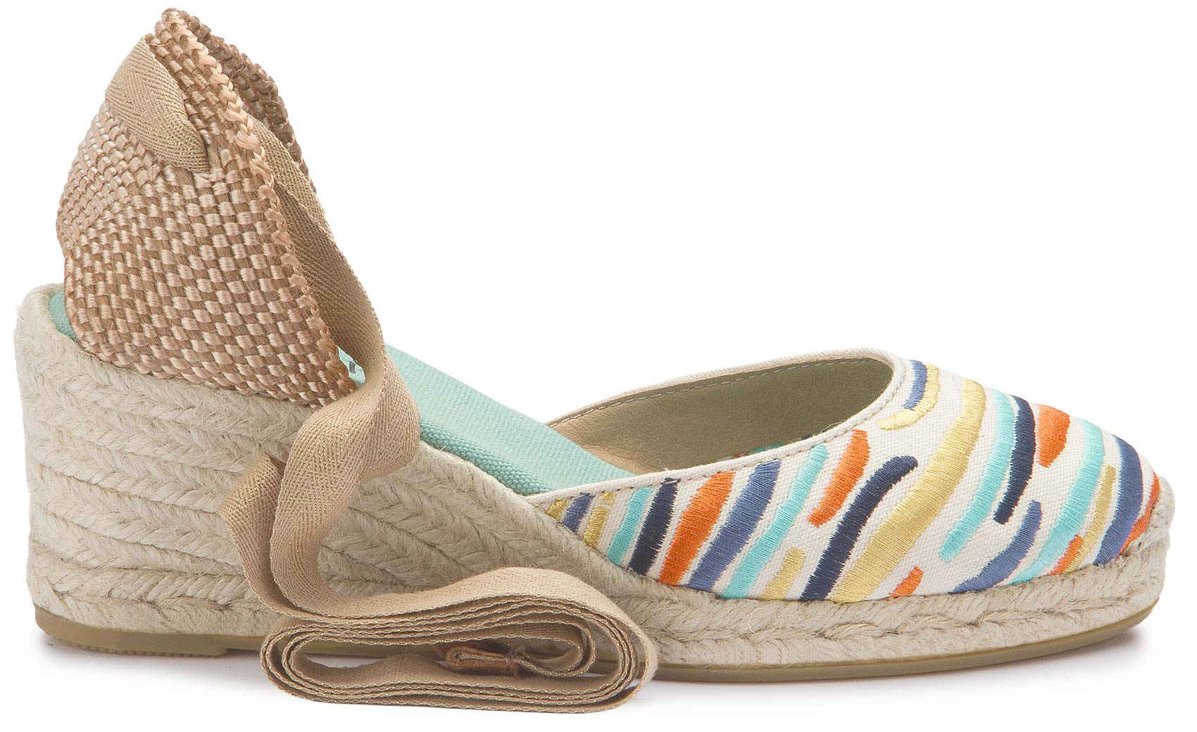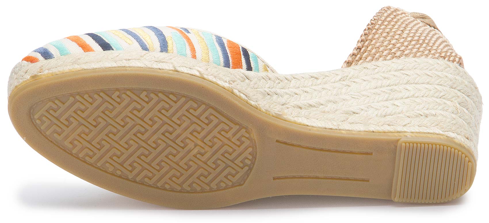 Diese trendigen Espadrilles mit Keilabsatz setzen mit ihrem farbenfrohen Streifenmuster sommerliche Akzente. Die klassische Jute-Sohle sorgt für einen natürlichen Look, während die Schnürbänder am Knöchel einen femininen und sicheren Sitz bieten. Ideal für stilvolle Outfits an warmen Tagen.