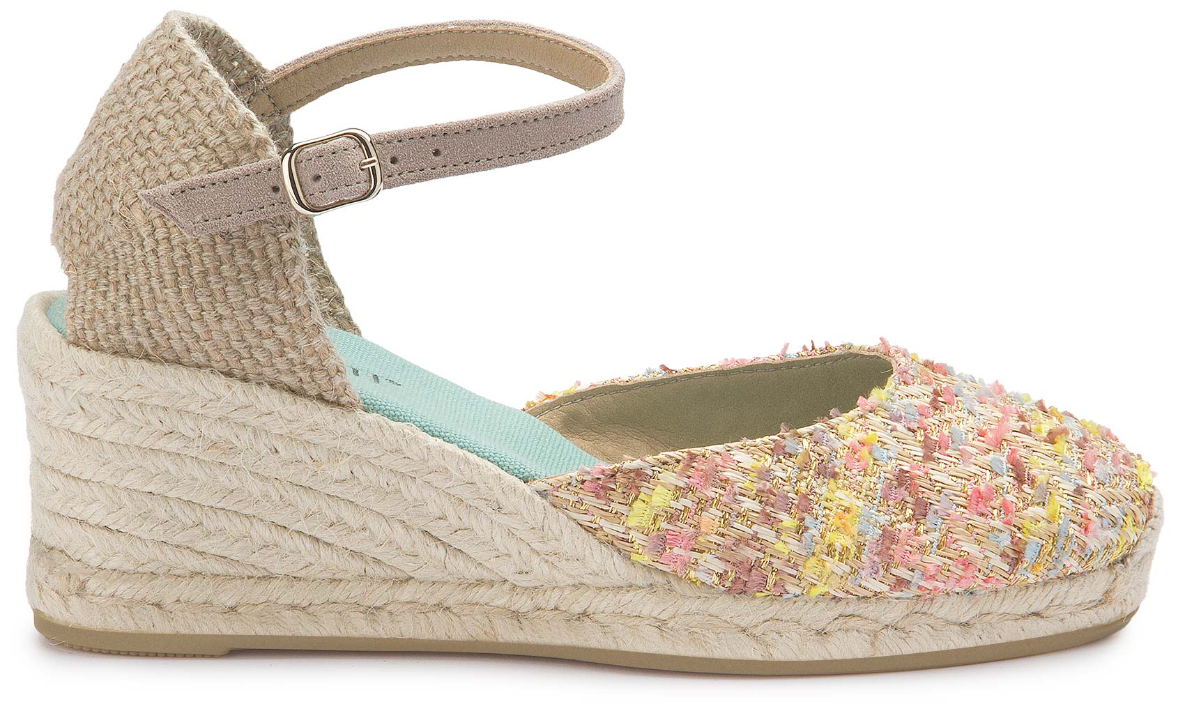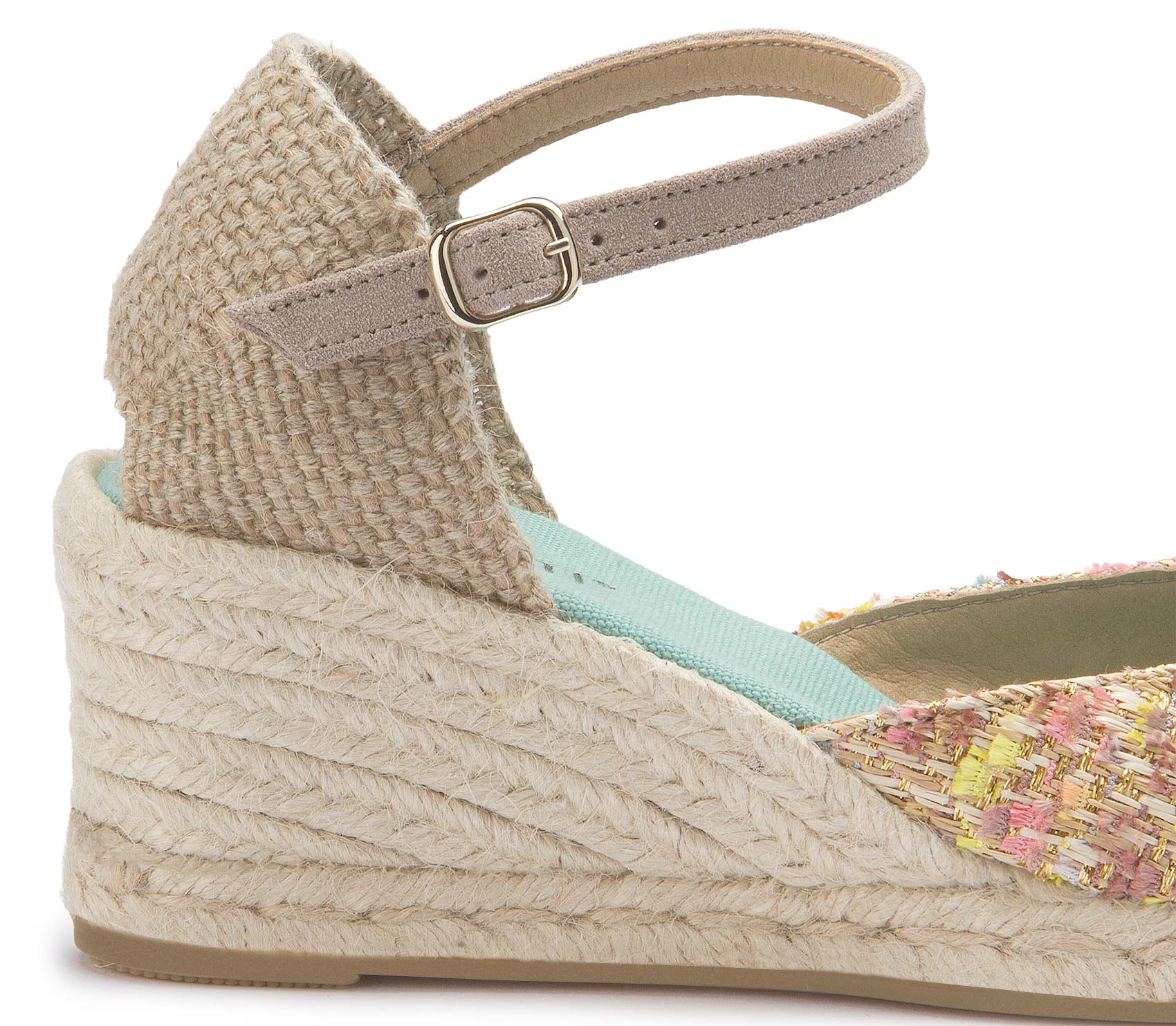 Diese Espadrilles mit Keilabsatz begeistern durch ihr verspieltes, mehrfarbiges Obermaterial und sommerliche Leichtigkeit. Die klassische Jute-Sohle und der verstellbare Riemen sorgen für Komfort und sicheren Halt. Ein stilvoller Begleiter für warme Tage – perfekt für entspannte und elegante Looks zugleich.