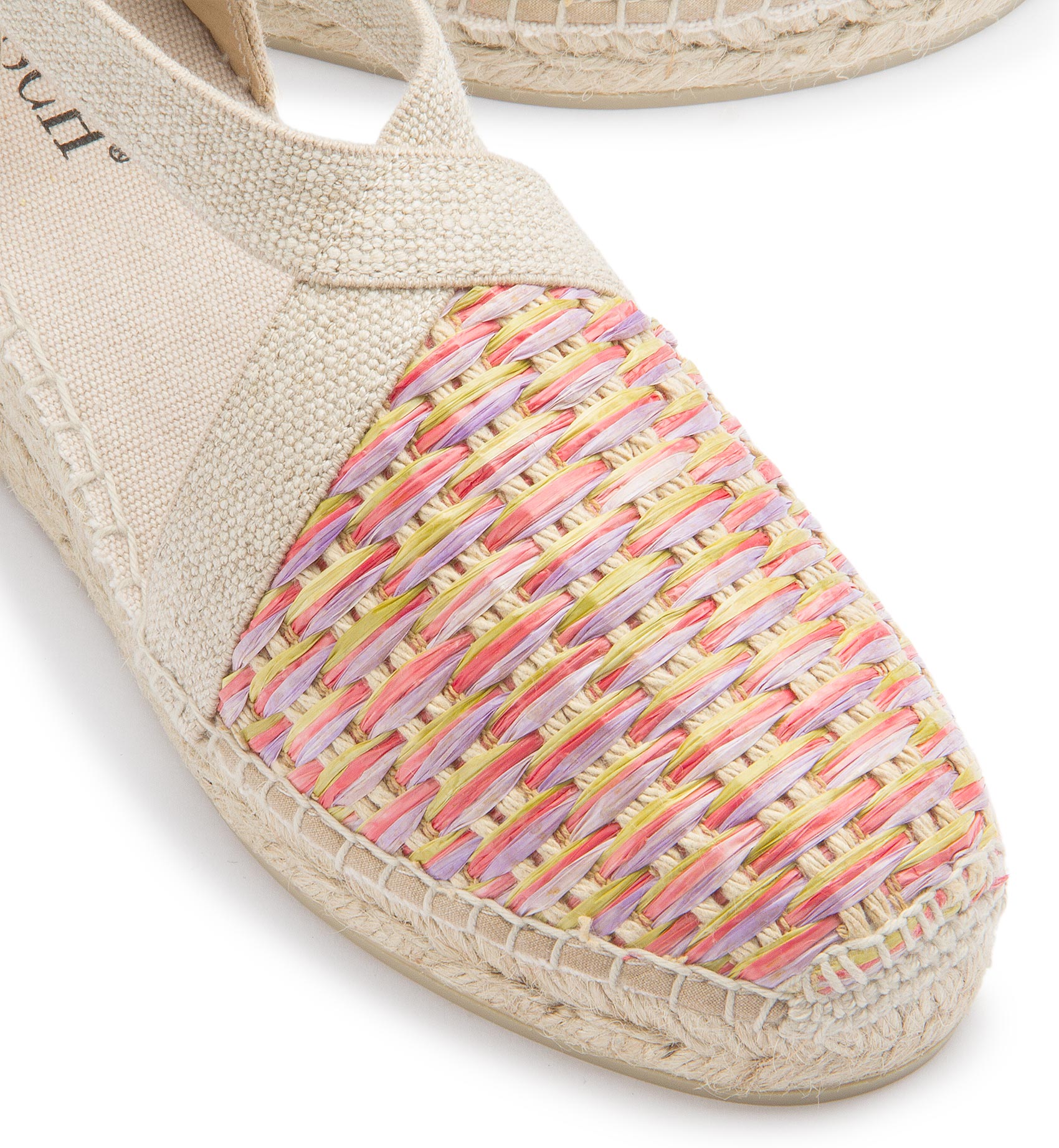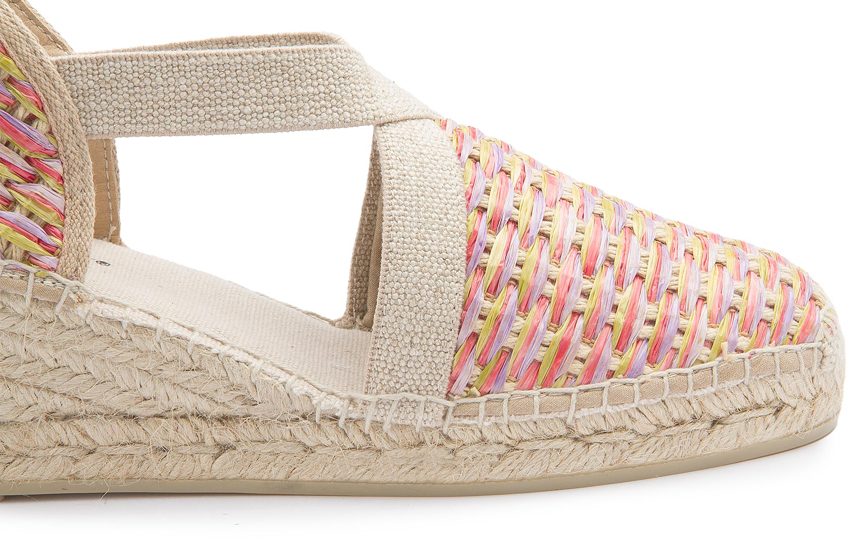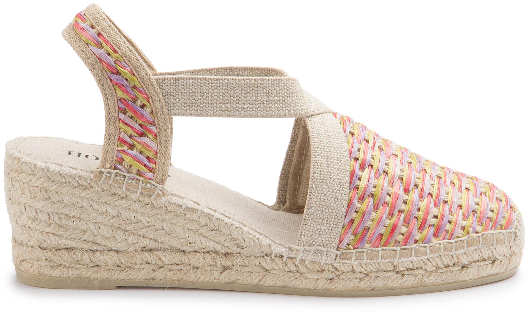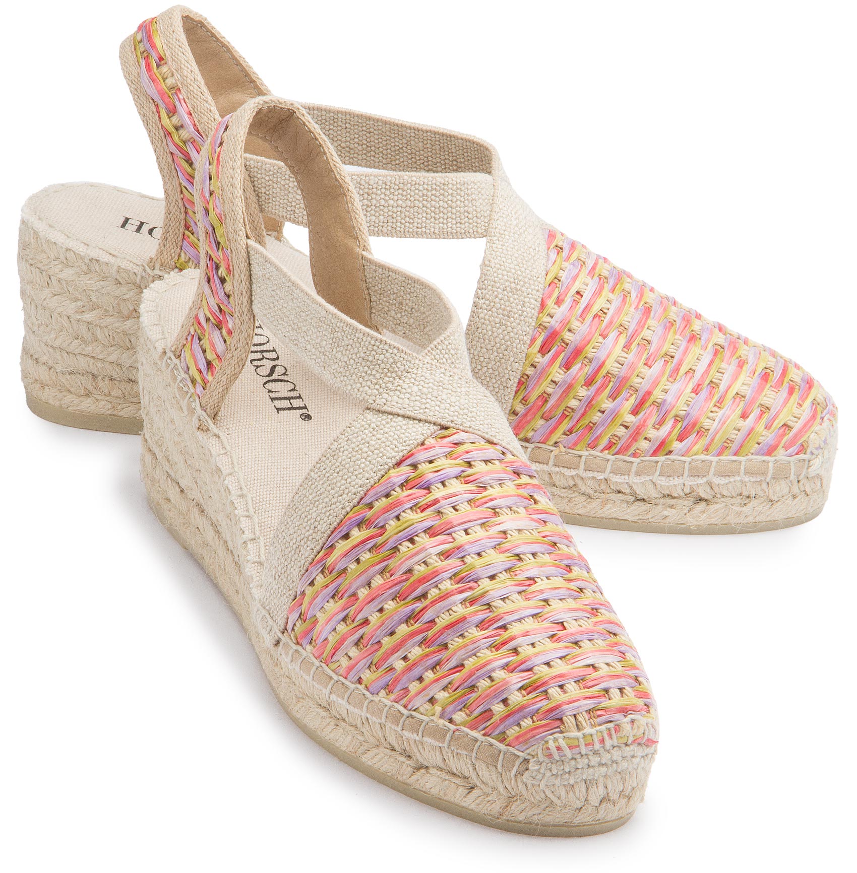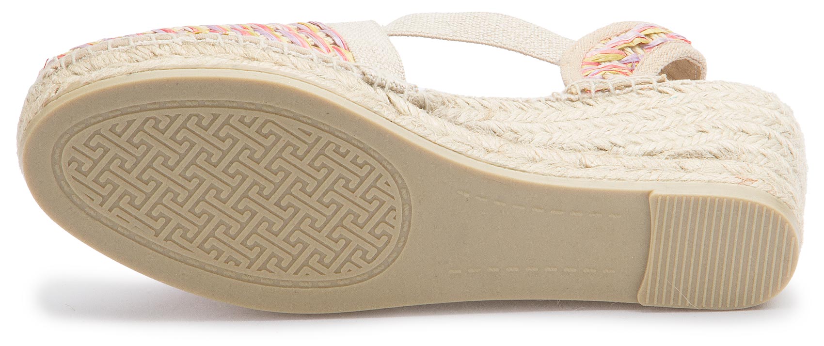 Mit diesen modischen Espadrilles wird man zum echten Blickfang. Das tolle Design und der angesagte Keilabsatz machen dieses Modell so besonders. Sehen lassen kann sich auch das Obermaterial, das aus Textil gefertigt wurde. Zu einem luftigen Kleid oder einem angesagten Jumpsuit passt der Schuh ideal.