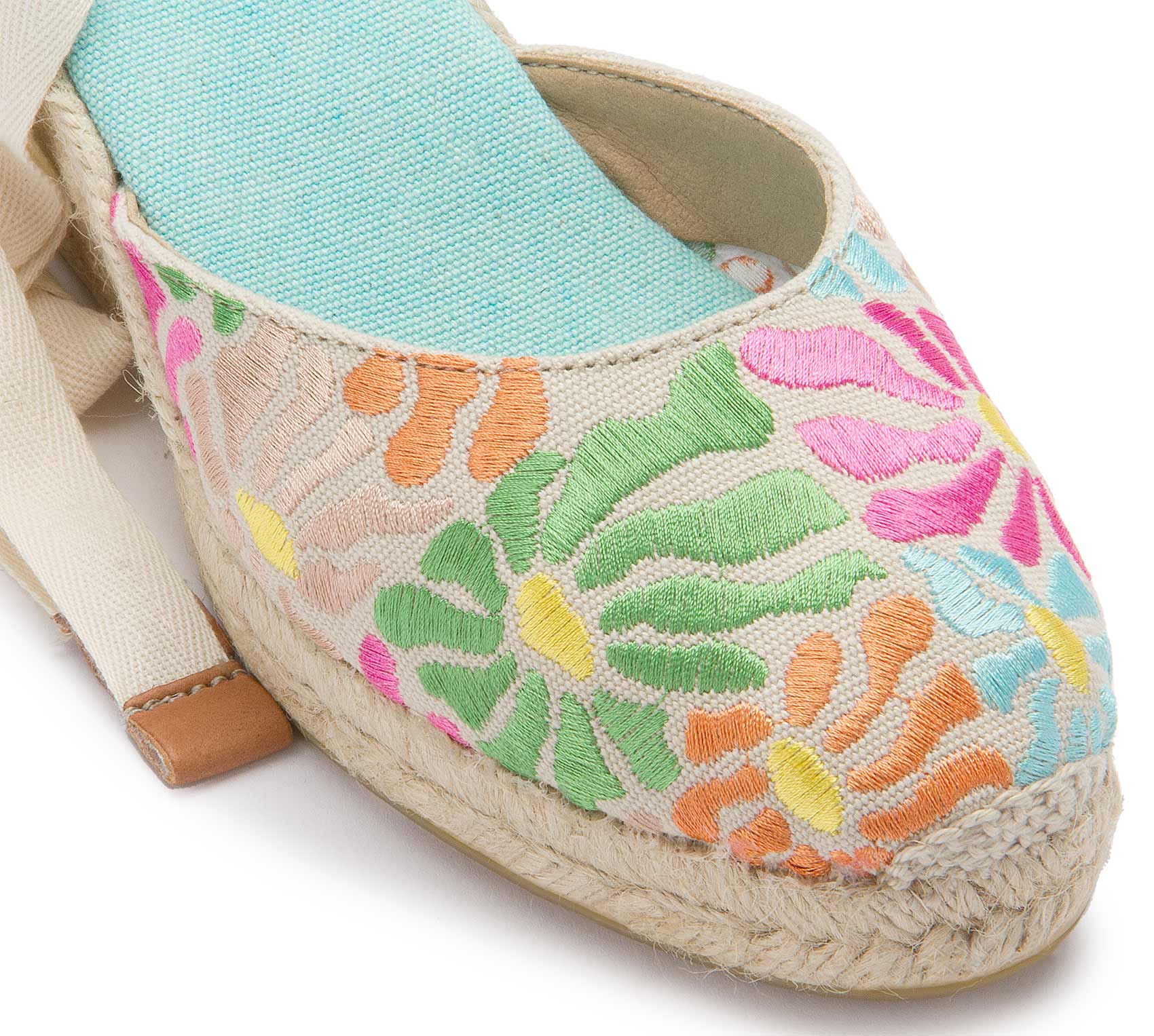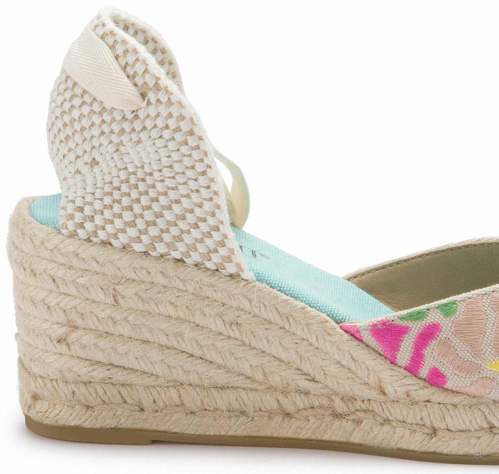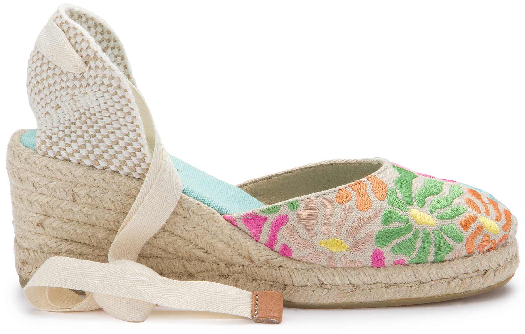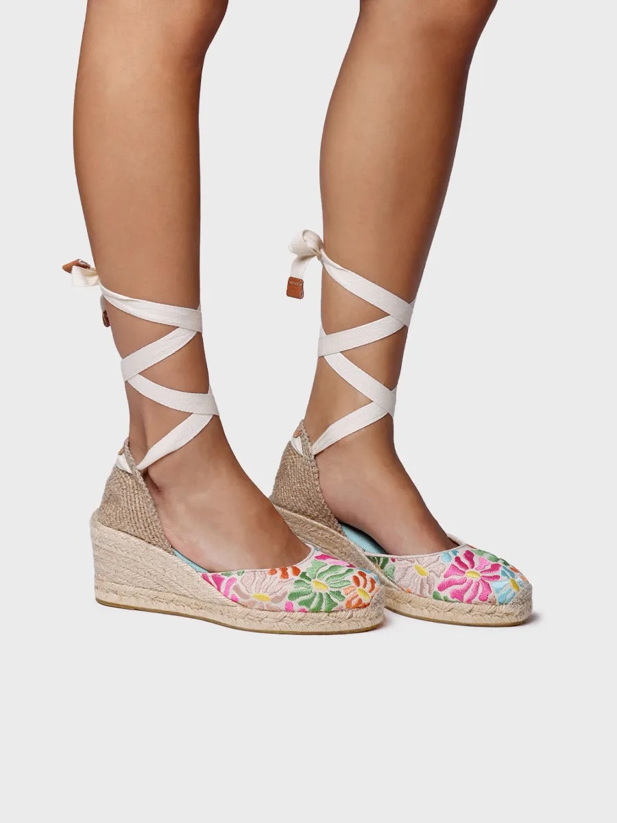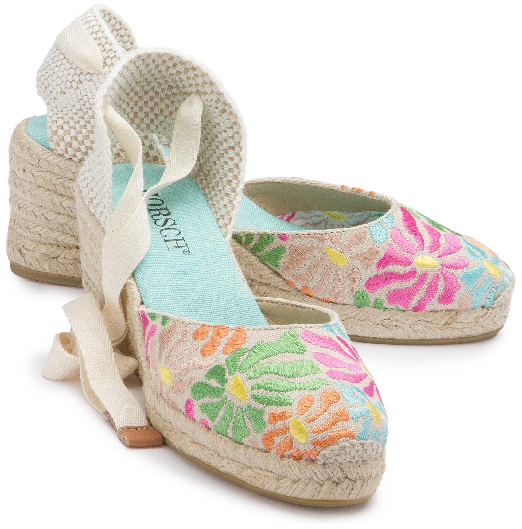 Diese eleganten Espadrille-Wedges mit floraler Stickerei sind ein echter Hingucker für den Sommer. Die verspielten Bänder zum Binden sorgen für einen eleganten Look, während die geflochtene Keilsohle einen natürlichen Charme verleiht. Perfekt für stilvolle Sommeroutfits – ob zur Jeans oder zum luftigen Kleid!